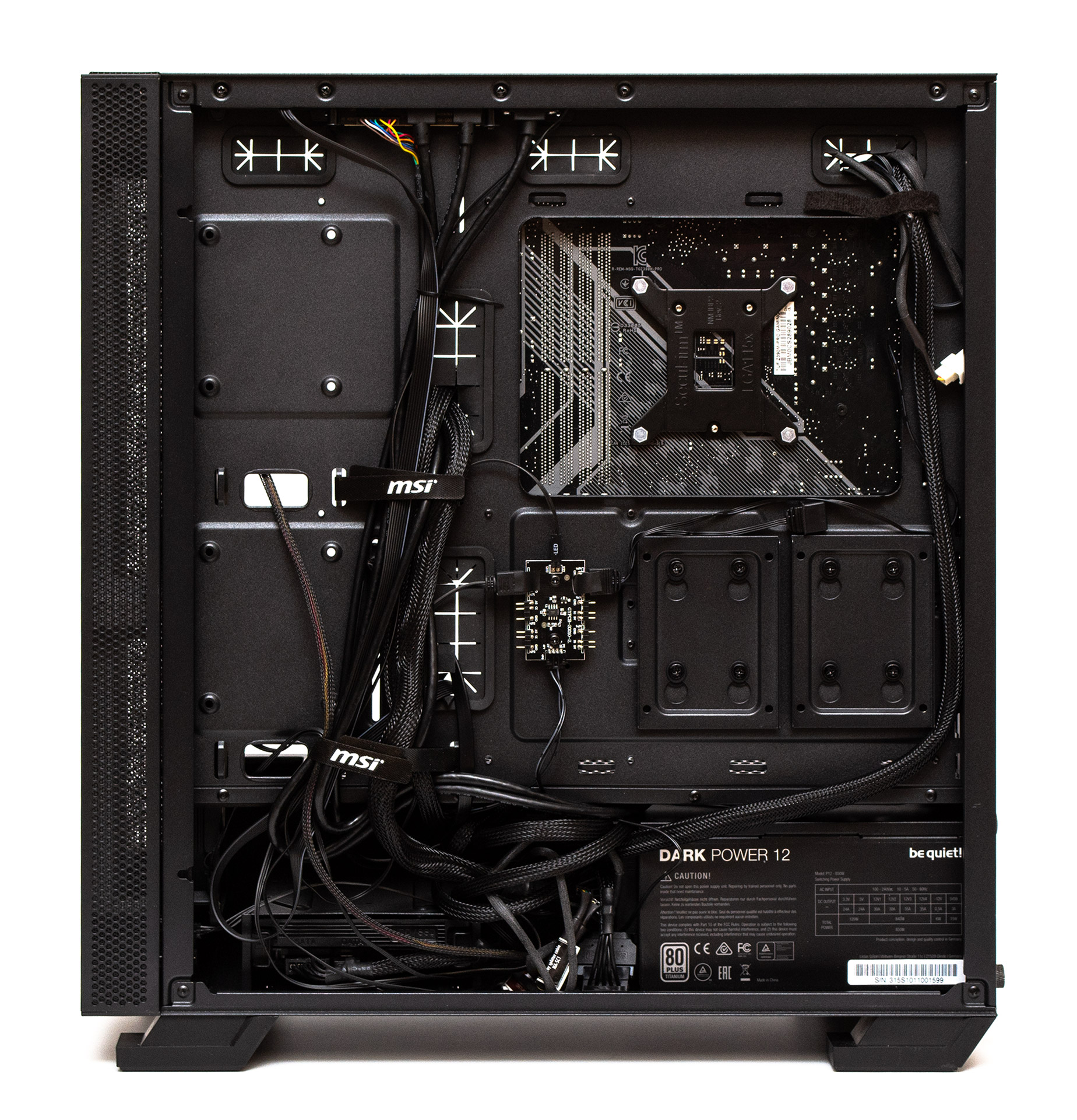 Корпус MSI MAG Vampiric 300R зручний для багаторазового складання системи, оскільки в ньому багато місця і завжди є вільний доступ до всіх компонентів. Всі кабелі можна легко розмістити за піддоном, чому сприяють багаторазові липучі стрічки. Єдиний мінус ергономіки полягає в тому, що для зняття кошика накопичувачів, доводиться укладати шасі на бік, попередньо знявши бічне скло.
