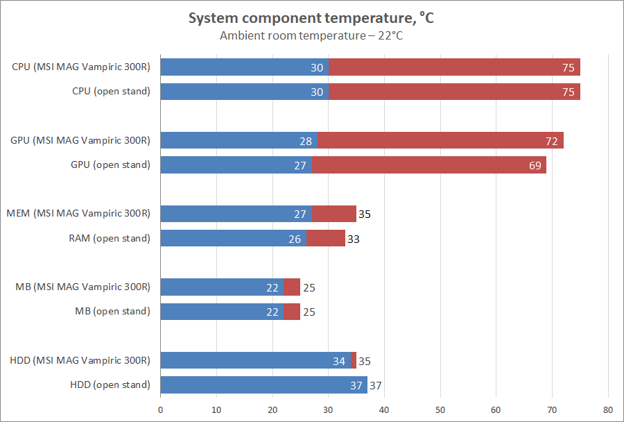 За результатами теплового тесту до корпусу MSI MAG Vampiric 300R не виникає жодних питань. Його показники дуже близькі до значень відкритого стенду. Корпус та стенд збігаються за температурою процесора та материнської плати. Стенд виграє два або три градуси за нагріванням відеокарти та оперативної пам'яті та стільки ж поступається за температурою жорсткого диска. Це шасі без проблем подолає охолодження повноцінної гарячої ігрової системи за умови комплектації додатковими вентиляторами.