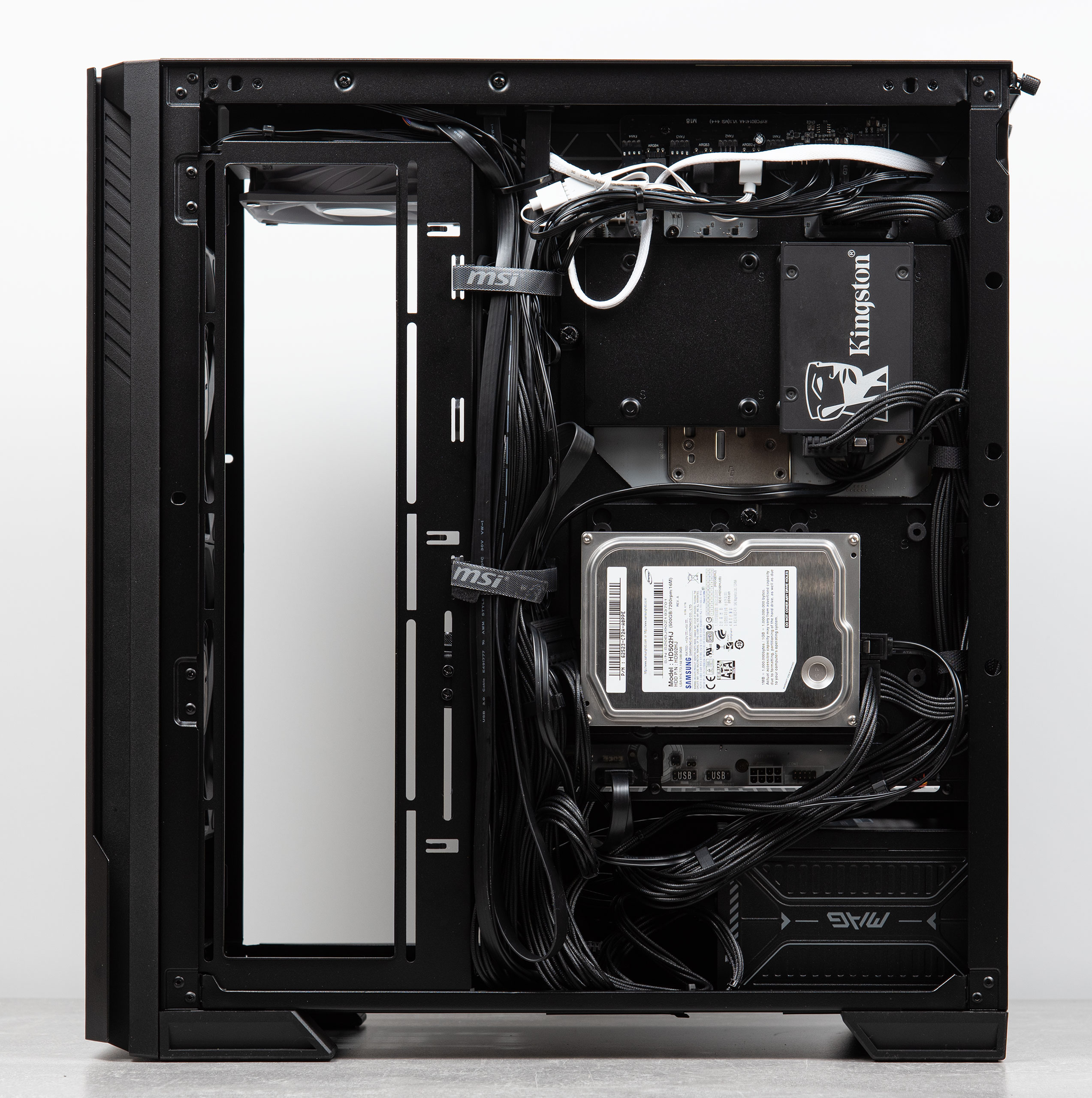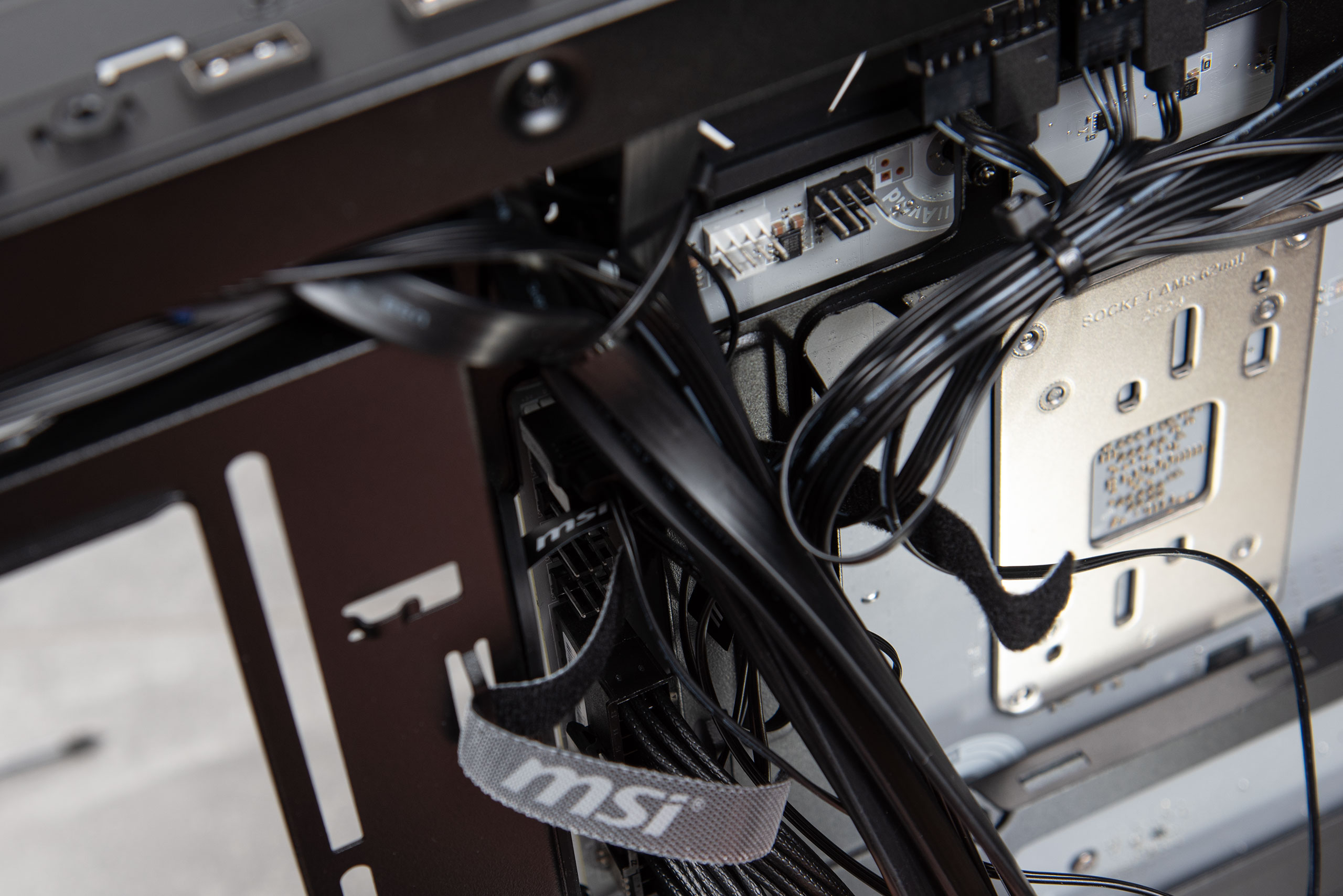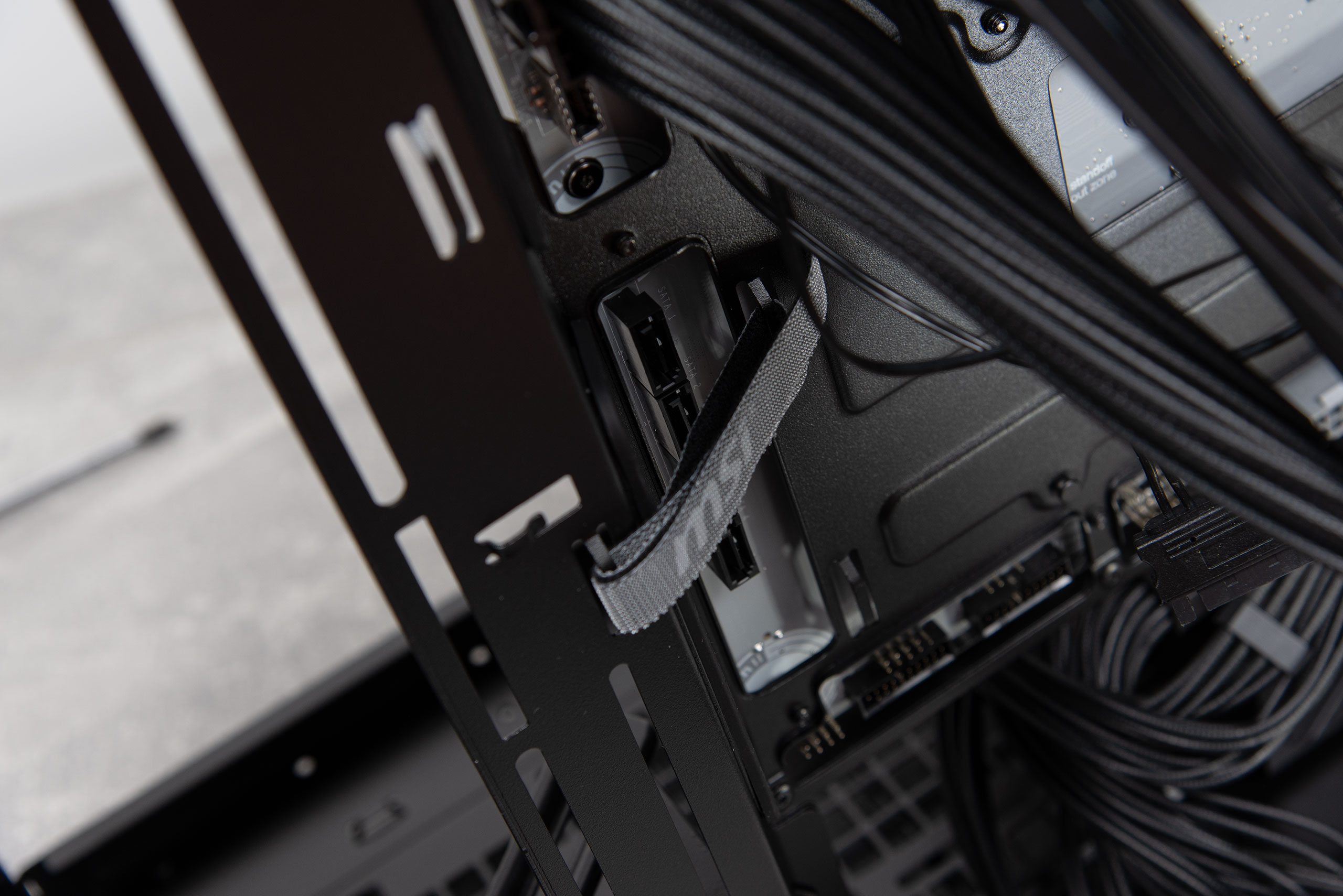Після встановлення материнської плати та процесорної системи охолодження маємо гарний вигляд системи всередині, але деякі нюанси на зворотному боці все ж таки залишаються. Наприклад, стяжки-липучки перекривають деякі роз’єми і якщо буде необхідність задіяти всі конектори, то можуть виникнути проблеми з кабель-менеджментом. З іншого боку, одну стяжку можна переставити в сусідні вушка, але тоді будуть перекриватися інші роз’єми.