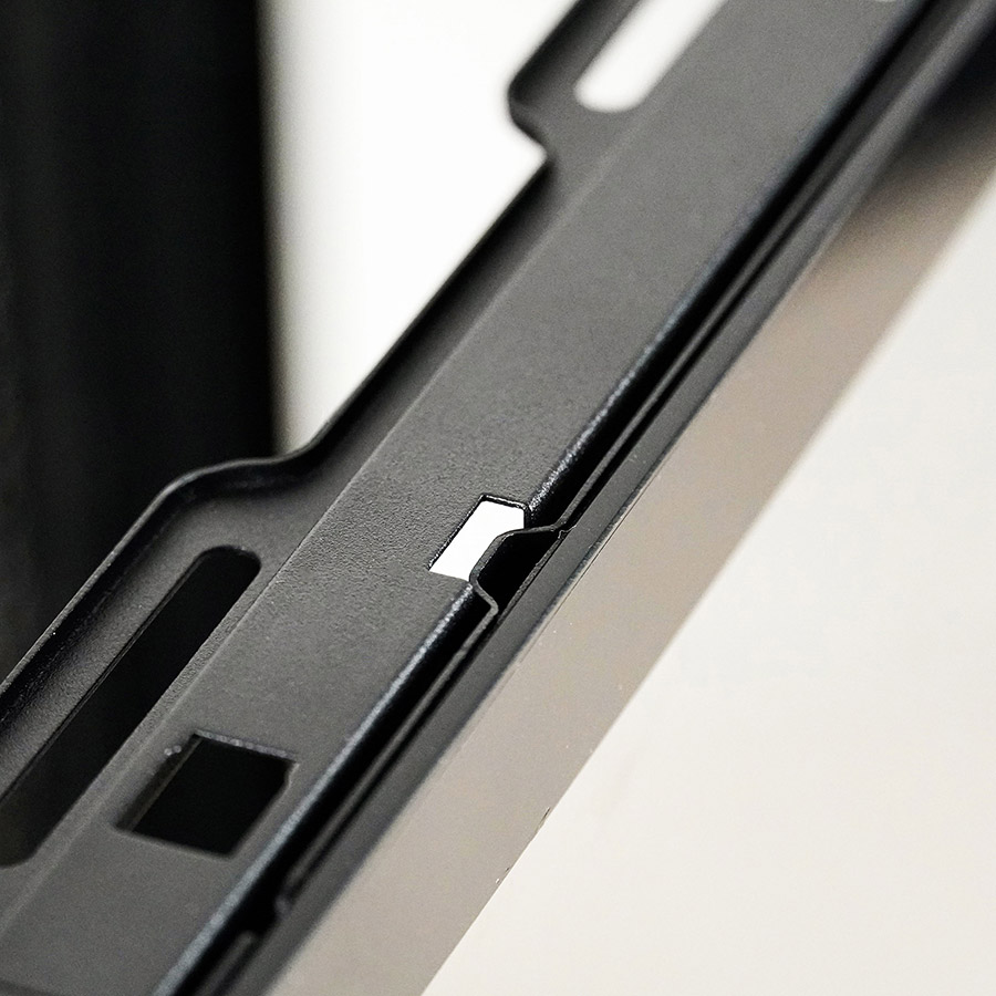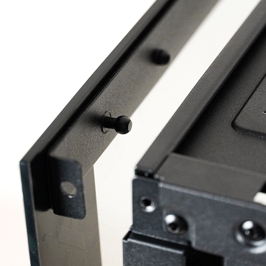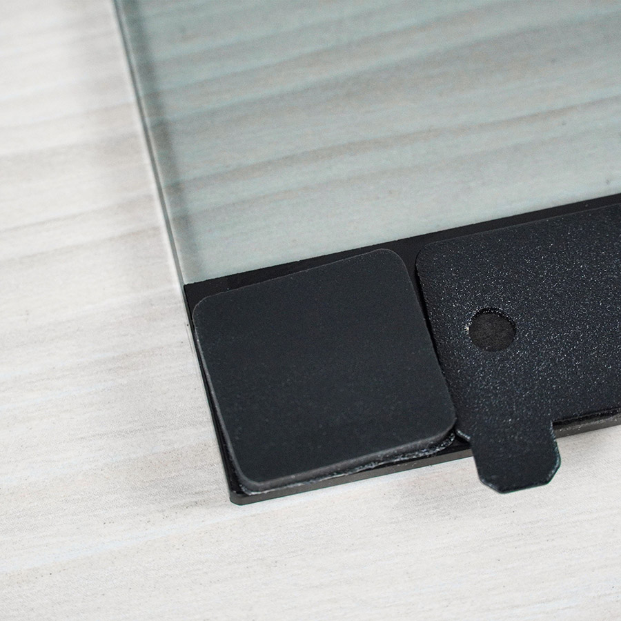 Металеві планки кріплення приклеєні до скла та тримаються міцно. На кутах скла з передньої частини присутні невеличкі гумові демпферні ущільнювачі, а на задній стороні розміщений спінений демпфер.