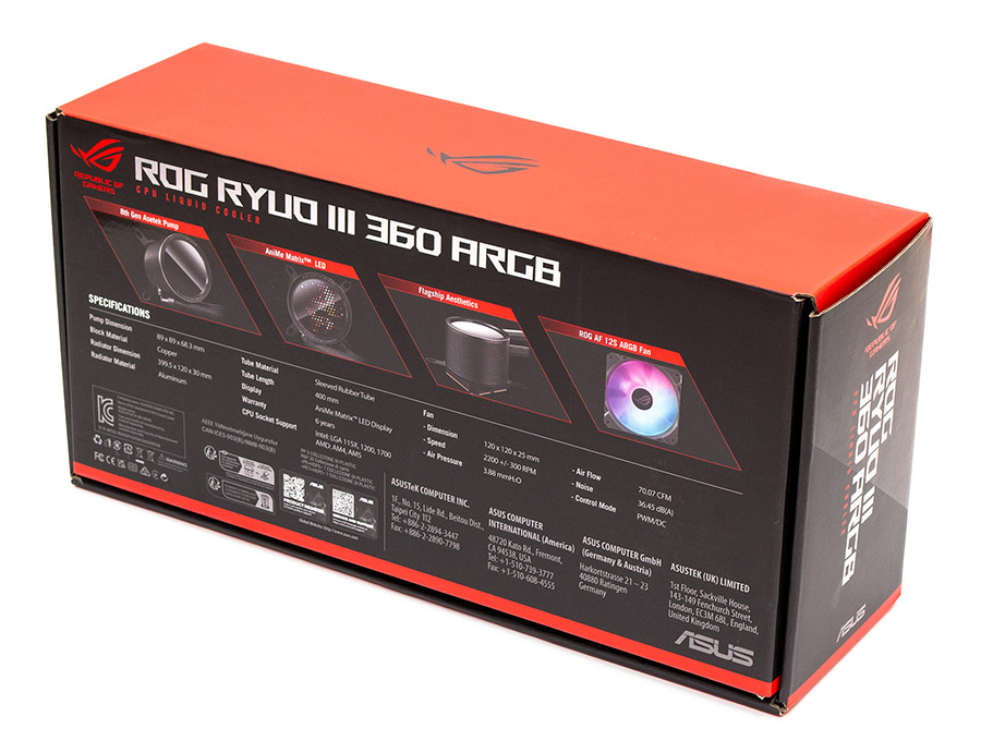| Особливості | Вбудований у водяний блок дисплей AniMe Matrix LED, ARGB підсвітка вентиляторів, шість років гарантії |