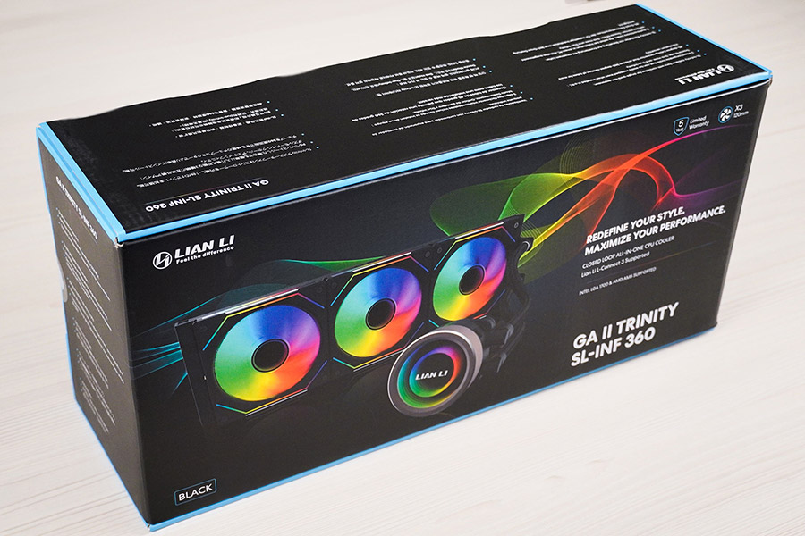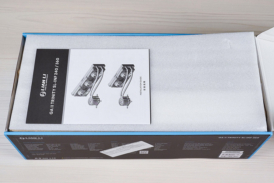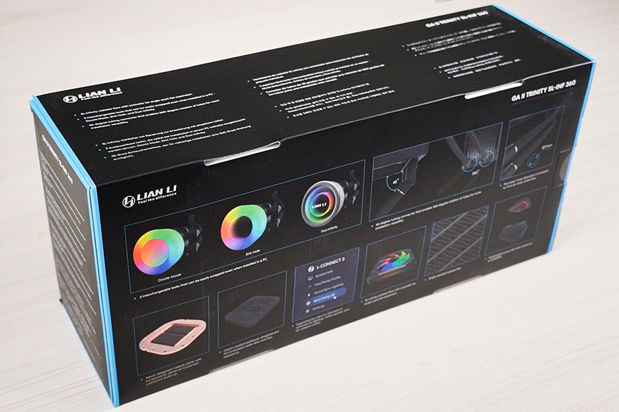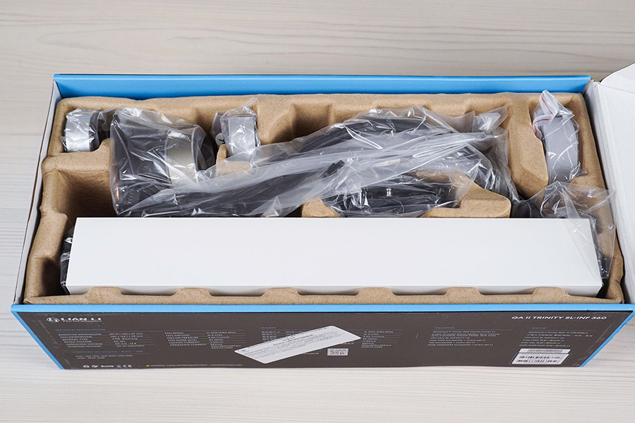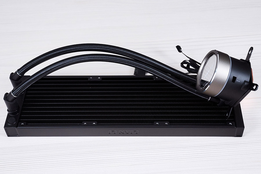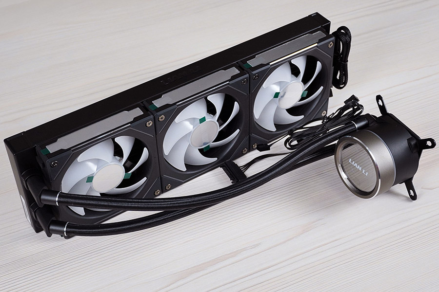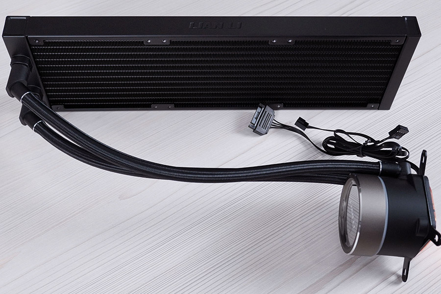 Система рідинного охолодження Lian Li Ga II Trinity SL-INF 360 має стандартний вигляд. Вона складається з чорного алюмінієвого радіатора формату 360 мм, поєднаного гнучкими гумовими шлангами у нейлоновому обплетенні з помпою, суміщеною з водяним блоком. Довжина трубок із зовнішнім діаметром в 13 мм становить 385 мм. Вентилятори одразу встановленні «з коробки».