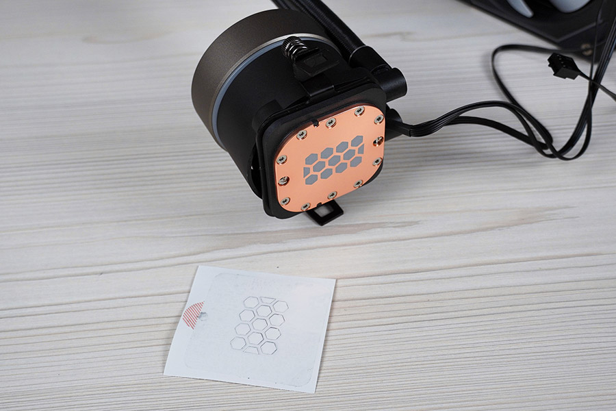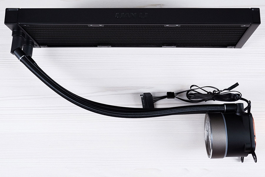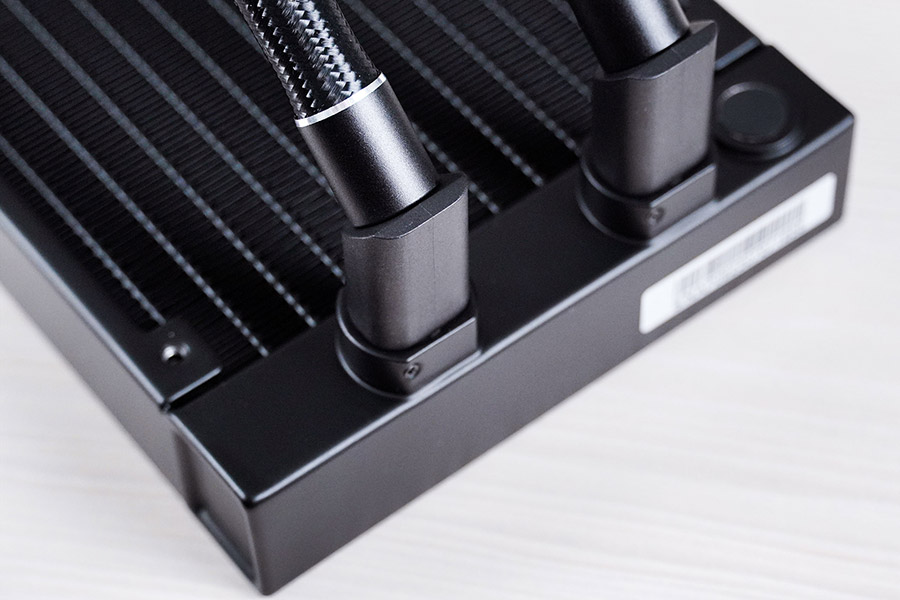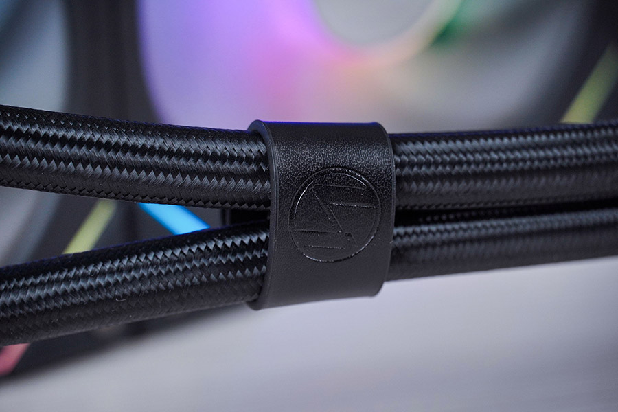 Шланги приєднуються до водяного блоку кутовими фітингами, які можуть повертатися в межах приблизно 45 градусів в кожну сторону. Три кабелі для помпи виведені між фітингами. Ще один кабель ARGB-підсвітки приєднується в вільний роз’єм на корпусі водоблоку.