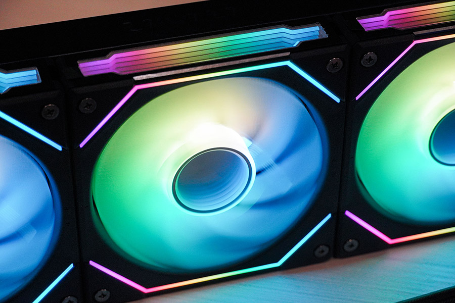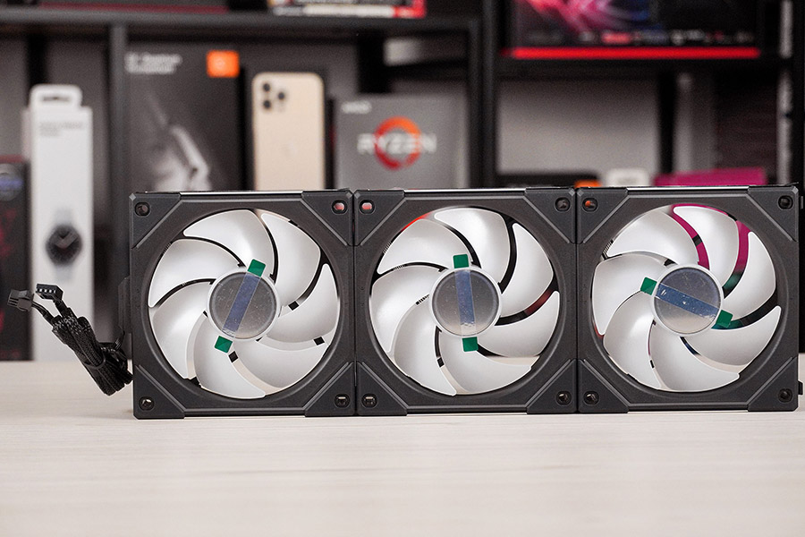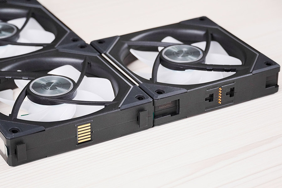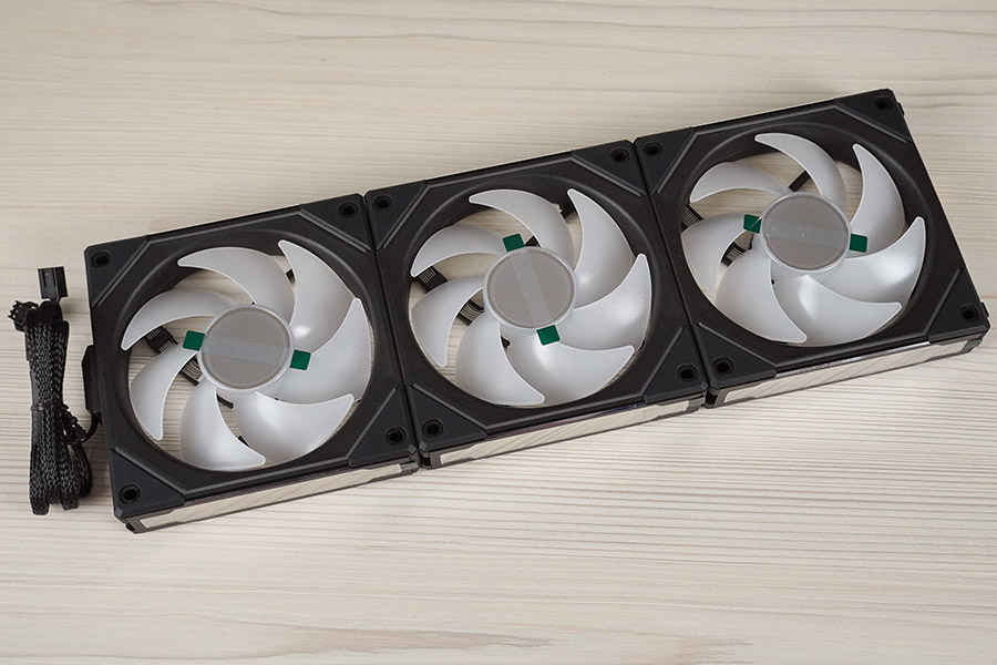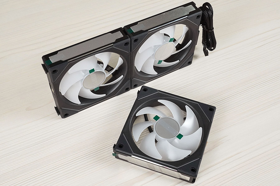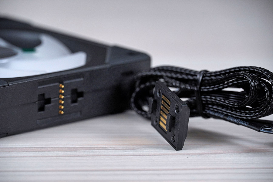 Особливість цих вентиляторів полягає у їх конструкції. Комбінований кабель підсвітки та живлення приєднується до першого вентилятора, а потім стеком в групу решта, для чого на них є спеціальні пази для підключення.
