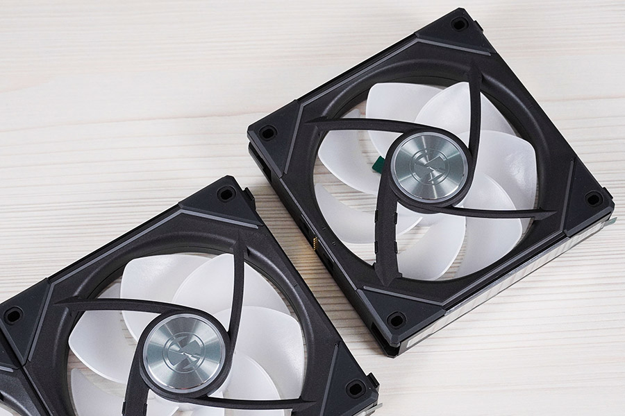 Три стокові вентилятори мають назву Lian Li Uni Fan SL-Infinity 120. Їх фактичні габарити складають 120х120х27 мм. Пропелер має звичайні сім лопатей, товсту рамку з гумовими демпферами по її кутах, та максимальну швидкість 2100 обертів на хвилину. Приблизно до 900 об/хв роботу пропелерів не чутно взагалі, після 1400 об/хв їх стає чутно з закритого корпусу, а на максимальній швидкості рівень шуму можна схарактеризувати як гучний, але без різких призвуків на фоні. Тип вальниці — гідродинамічний (FDB).