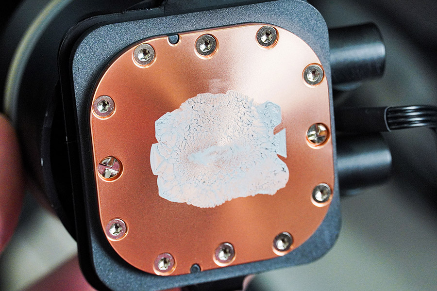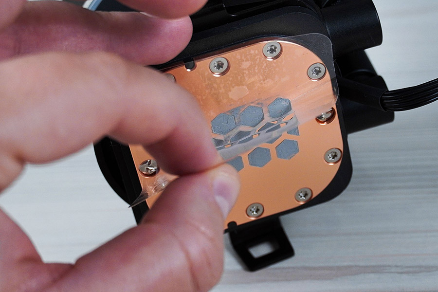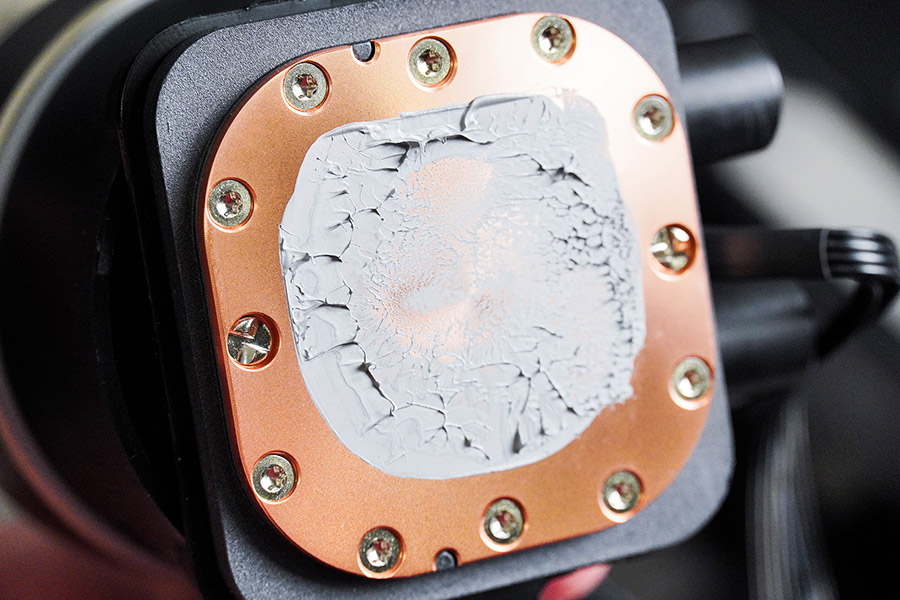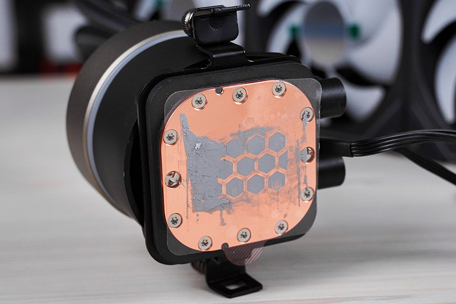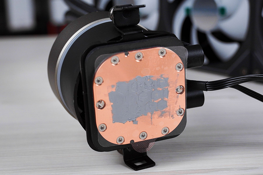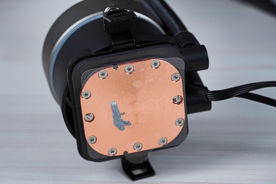 Підошва водяного блоку мідна та має форму заокругленого по кутах квадрата розміром 56х56 мм. Вона зафіксована дванадцятьма гвинтами. Ефективна площа контакту складає 43х43 мм.