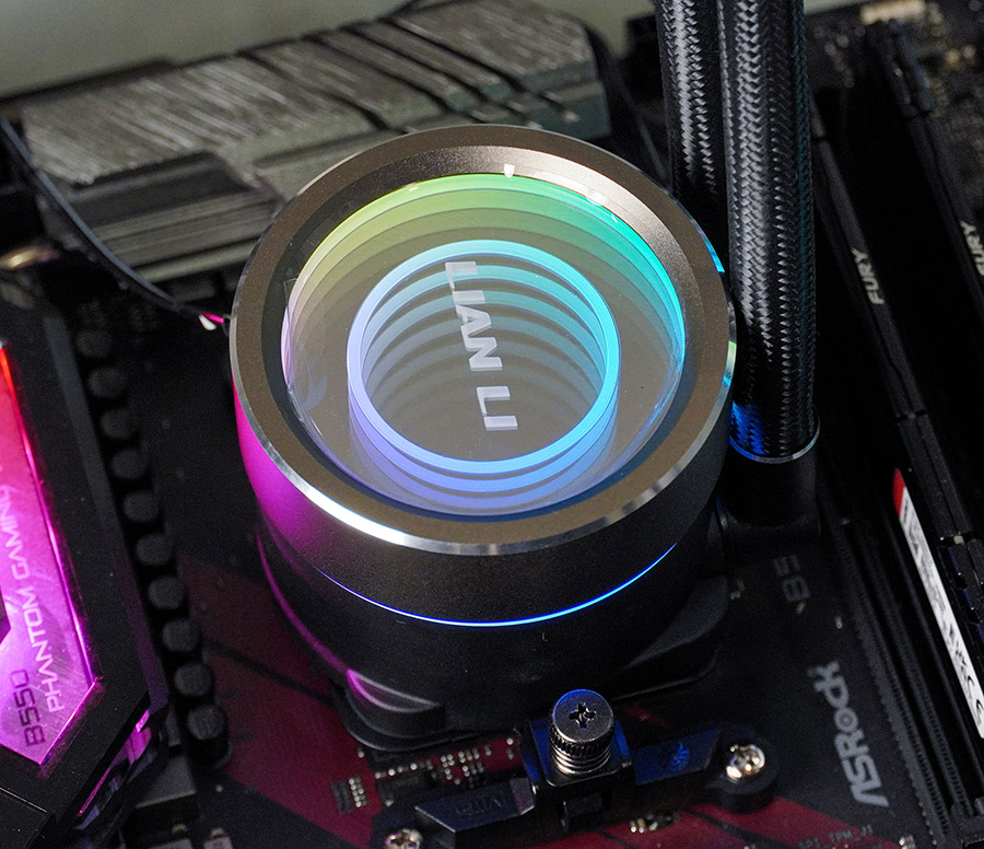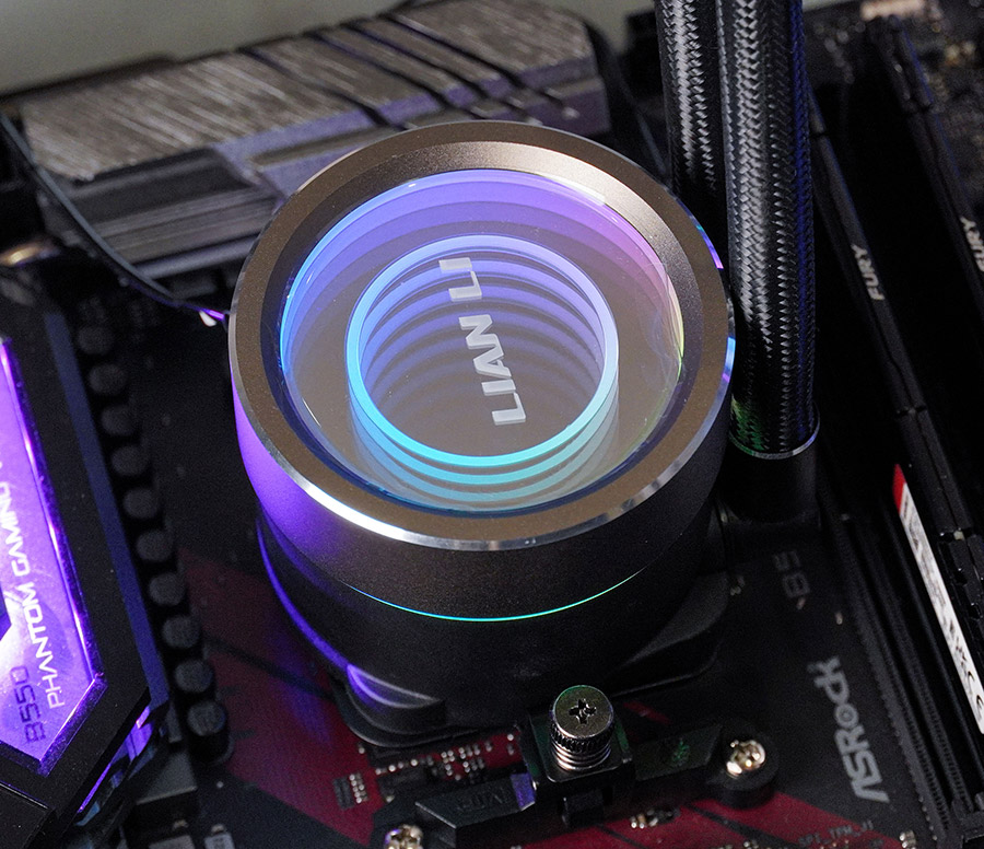Водяний блок повторює концепцію підсвітки вентиляторів. З заводу встановлена декоративна алюмінієва кришка з подвійним нескінченним дзеркалом та логотипом Lian Li у центрі.
