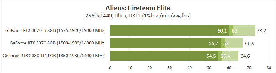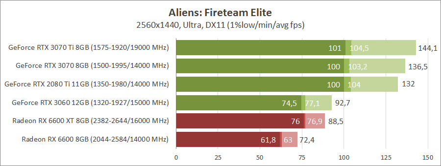 Комфортно грати в 1440p можна на Radeon RX 6600 та порівнянних відеокарт старих поколінь. Більш потужні Radeon RX 6600 XT і GeForce RTX 3060 показують схожі результати. У топовому сегменті GeForce RTX 3070 трохи виграє у GeForce RTX 2080Ti.