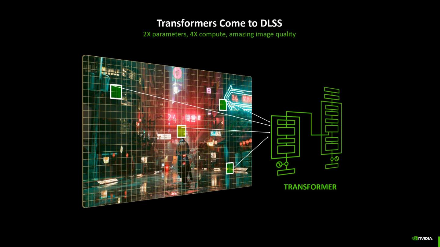 Важливим елементом підвищення продуктивності в новому поколінні GeForce RTX 50 стала поява DLSS 4 та Multi Frame Generation (MFG). NVIDIA перейшла від стандартної моделі побудови зображення CNN (Convolutional Neural Network) до моделі Transformer. Ця модель ШІ краще працює з динамічними даними, забезпечуючи якіснішу картинку при масштабуванні та усуваючи деякі невеликі артефакти, що мають місце при апскейлингу. Transformer вимагає більше ресурсів, але спеціально для цього в чипах Blackwell з’явилися потужніші тензорні ядра п’ятого покоління. Впровадження Transformer та зміни в оптичному конвеєрі дозволили реалізувати технологію Multi Frame Generation, яка генерує до трьох додаткових кадрів, підвищуючи плавність зображення і рівень комфорту.