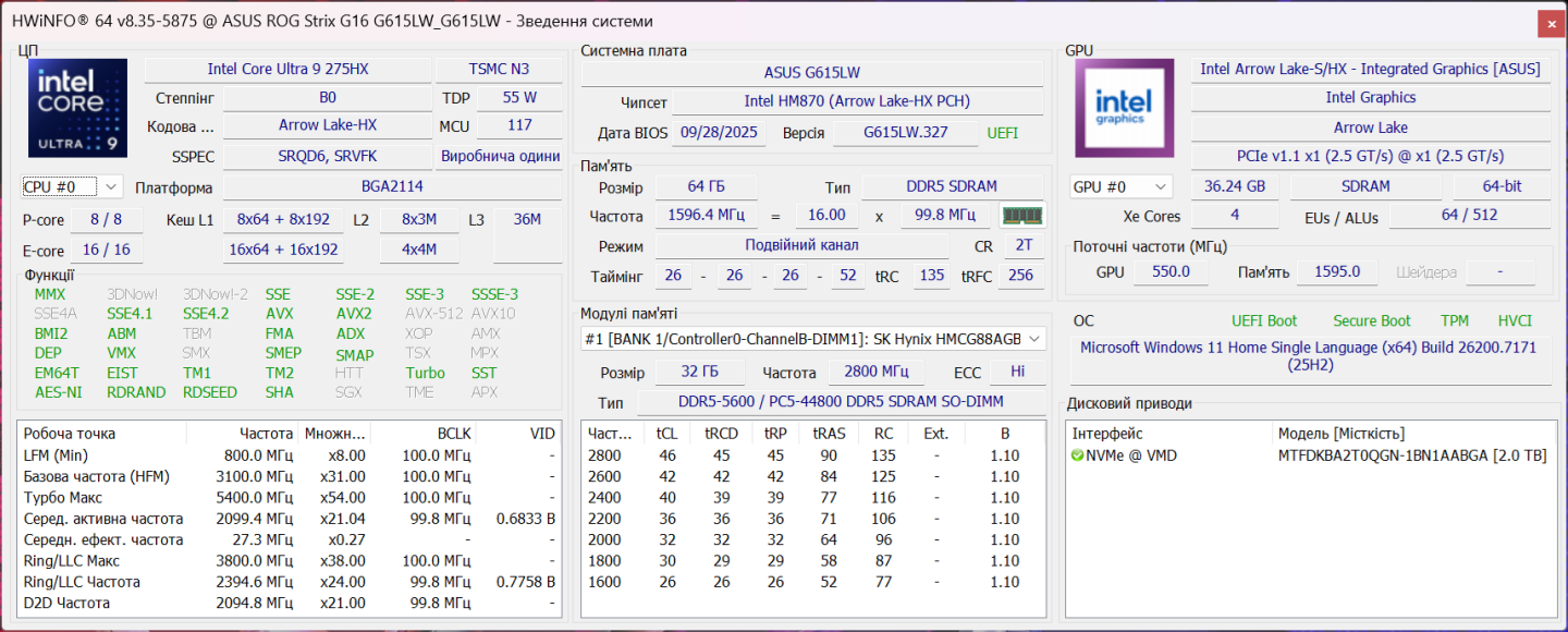 На додаток до GeForce RTX 5080 з високим TGP 175 Вт ноутбук отримав сучасний процесор Intel Core Ultra 9 275HX з 24 ядрами, з яких 8 високопродуктивних P‑ядер з частотою до 5,4 ГГц. Також наш варіант оснащений 64 ГБ пам’яті DDR5-5600 і твердотілим накопичувачем NVMe M.2 на 2 ТБ. Але виробник пропонує і доступніші варіанти з меншим обсягом пам’яті.