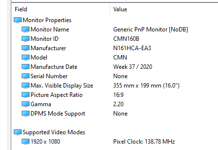 Використовується IPS-матриця Innolux N161HCA-EA3 (CMN160B) діагоналлю 16 дюймів, роздільна здатність Full HD 1920x1080, частота оновлення дорівнює 60 Гц.