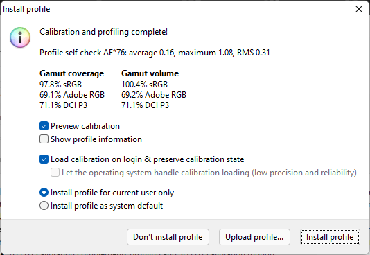 Екран показує високу точність передачі кольорів із середнім відхиленням DeltaE близько 1 одиниці, що є відмінним результатом.