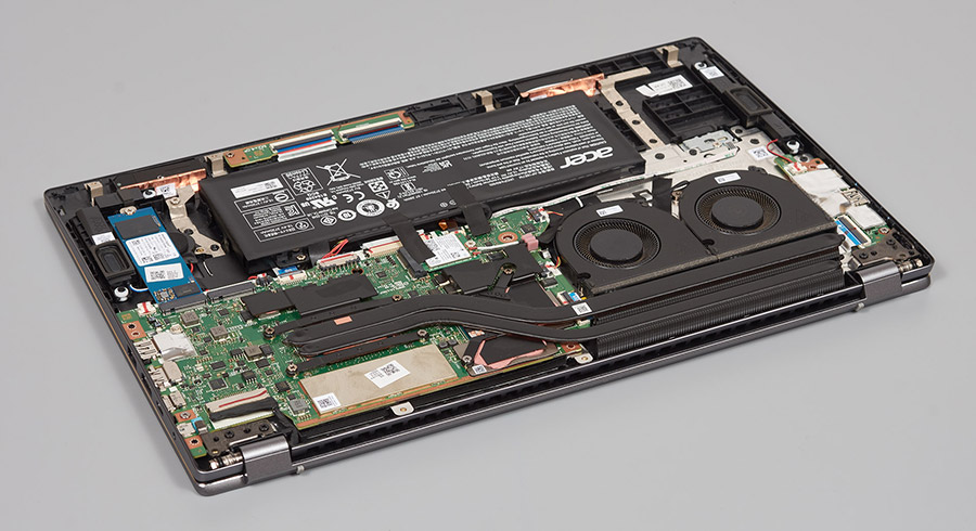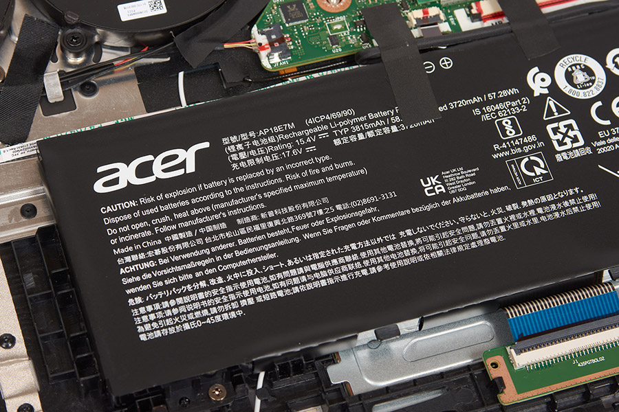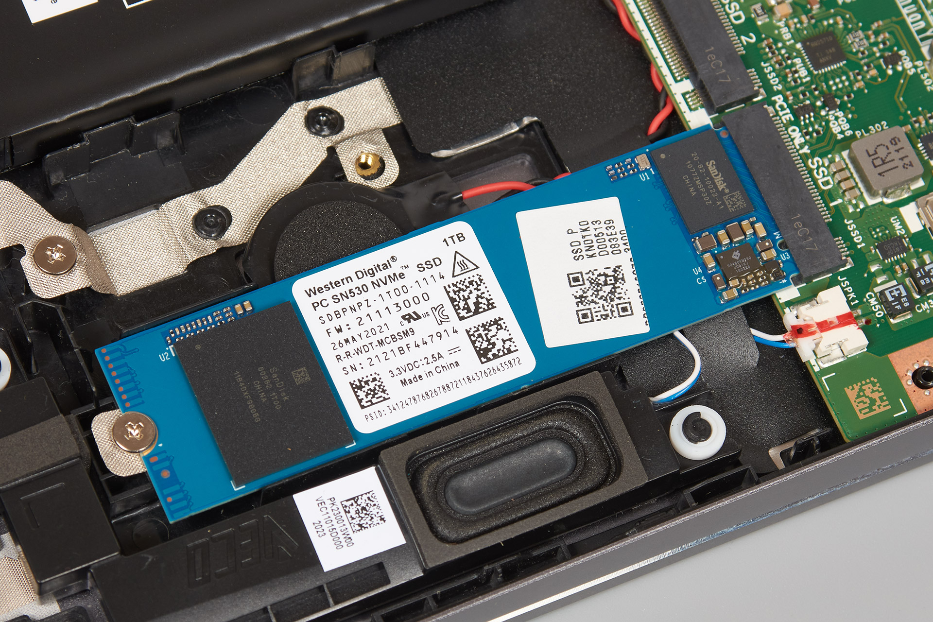 Встановлено накопичувач NVMe M.2 Western Digital SN530 SDBPNPZ-1T00-1114 місткістю 1 ТБ з інтерфейсом 4x PCI-E 3.0. Передбачено місце для другого накопичувача. У кутах корпусу розташовані стереодинаміки.