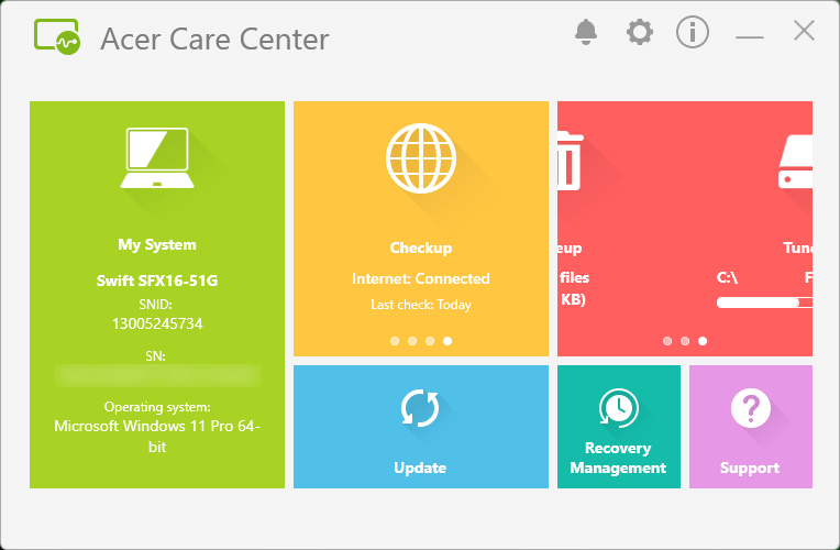 Програма Acer Care Center дозволяє контролювати оновлення системи та програм, забезпечує швидкий доступ до служб відновлення та деяких інших функцій.