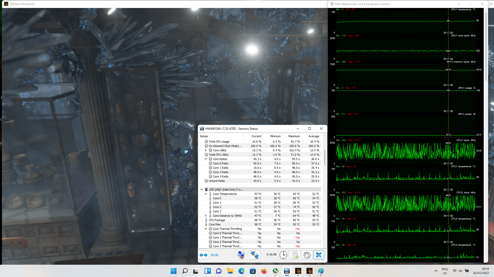 У такому режимі температура GPU досягала 58 °C за частот Boost близько 950–1050 МГц. Процесор Intel Core i7-11390H прогрівався до пікових значень 90–93 °C, хоча середні робочі температури були нижче 60 °C. Ядра процесора показували буст до 4,8–4,9 ГГц.