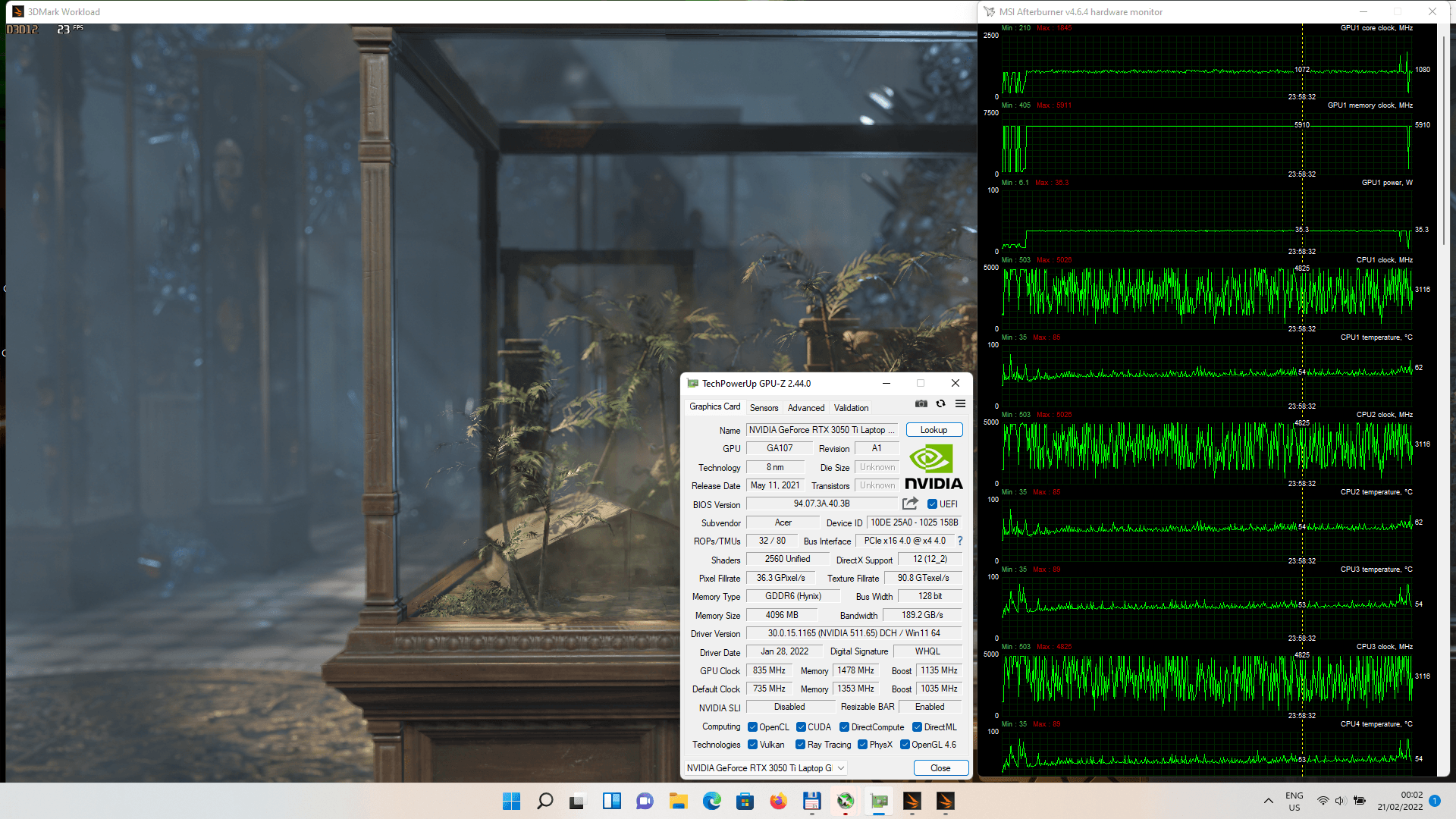 Цілком очікувано ультрабук використовує економічну версію GeForce RTX 3050 Ti Max-Q із найнижчим TGP у рамках цієї серії. Це обумовлює низькі робочі частоти: базове значення GPU 735 МГц із Boost Clock 1035 МГц, ефективна частота пам'яті 10820 МГц. Варто відзначити, що топова версія GeForce RTX 3050 Ti працює при частоті Boost Clock 1695 МГц з більш швидкою пам'яттю. Але в цьому випадку у нас компактний пристрій, і зниження потенціалу відеокарти — вимушений компроміс для досягнення оптимального балансу між продуктивністю, нагріванням та автономною роботою. У 2D-режимі активується вбудована в процесор графіка Intel Xe Graphics.