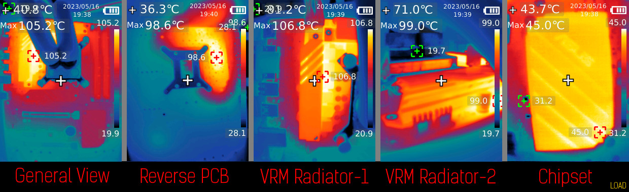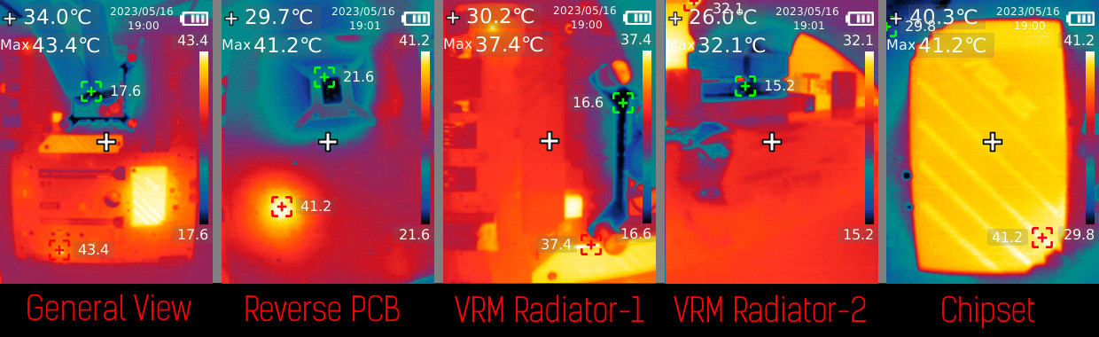 Управління обертами вентилятора було автоматичне. Температура в приміщенні утримувалась на рівні 20 градусів за Цельсієм. Показники температур бралися з моніторингу HWINFO, а також з термофото, що було виконано тепловою камерою UNI-T RX-600. Під час фіксації температур материнська плата або була 30 хвилин без навантаження, або 30 хвилин з ним. Вимір сумарного енергоспоживання платформи проводився за допомогою енергометра Feron TM55 та електролічильника протягом 30 хвилин у режимі навантаження (забіг LinX) та без нього. Вимір енергоспоживання окремо процесору проводився за допомогою ElmorLabs PMD. Кожен бенчмарк запускався п'ять разів, у результатах зазначено середнє арифметичне, те саме стосується ігор. В них відбувався запис телеметрії (1% low fps + Average fps) за допомогою Riva Tuner Statistics Server. CS:GO (налаштування якості — мінімальні) — тест на мапі майстерні FPS Benchmark від початку сцени бенчмарку до третього звукового сигналу на чорному екрані. Інші ігри тестувались на заводських пресетах мінімальної якості в стандартних бенчмарках.