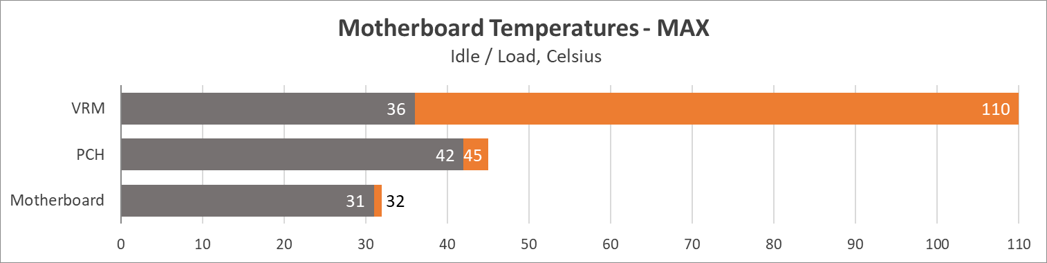 Материнська плата не здатна забезпечити статичне прискорення Intel Core i7-13700K, силова підсистема потребує додаткового обдуву своїх радіаторів, чого в методиці тестування не передбачено через використання відкритого стенду та СВО. В таких умовах плата забезпечила процесору середню частоту P-cores на рівні ~5050 МГц та E-cores на рівні ~3630 МГц. Враховуючи низьку імовірність використання такого процесора з цією материнською платою — це не є проблема, крім того, користувач завжди може налаштувати статичну частоту при меншій напрузі, і відповідно меншому навантаженні на VRM.