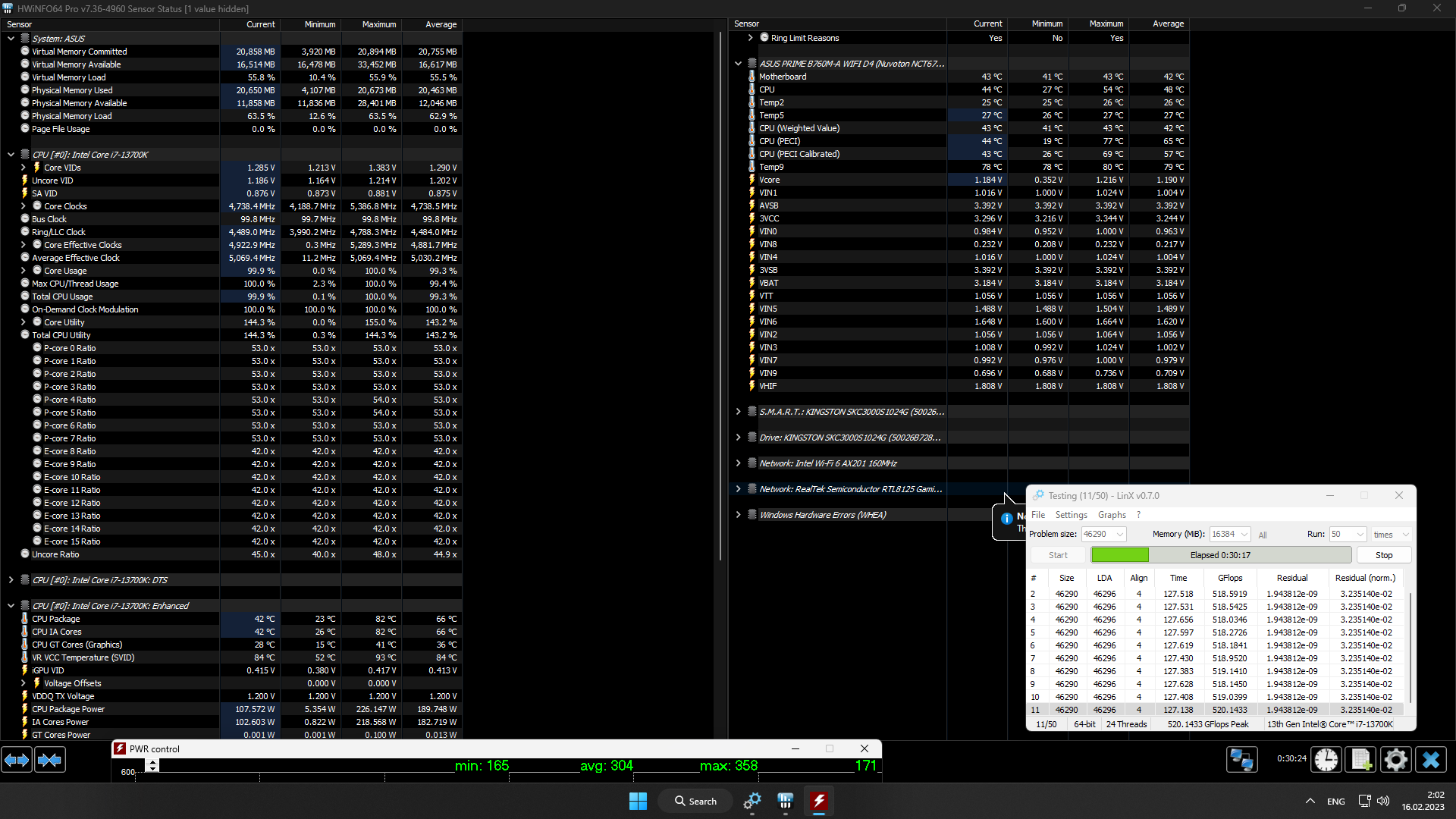 Під час тестування навантаження за допомогою LinX P-cores процесору знаходились на рівні 5,3 ГГц, а E-cores на рівні 4,2 ГГц. Це файний результат, як для плати бюджетного цінового сегмента.
