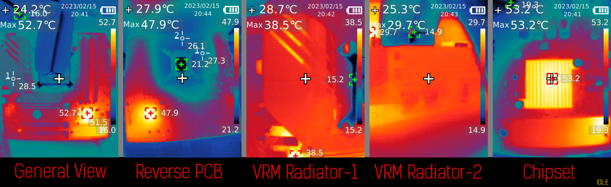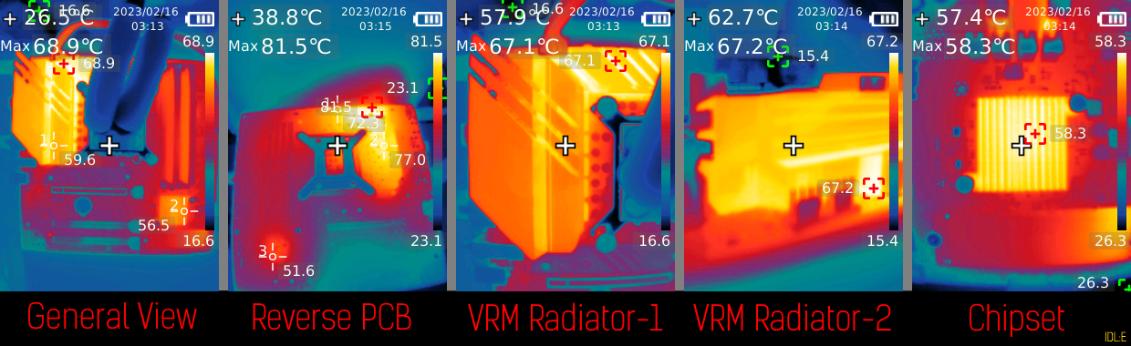 Подібний режим експлуатації не виявився чимось непід’ємним для материнської плати, результати на термофото нижче (простій та навантаження):