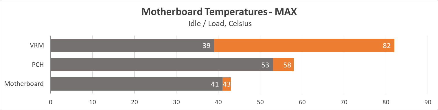 Управління обертами вентилятора — автоматичне. Температура в приміщенні утримувалась на рівні 20 градусів за Цельсієм. Показники температур бралися з моніторингу HWINFO, а також з термофото, що було виконано тепловою камерою UNI-T RX-600. Під час фіксації температур материнська плата або була 30 хвилин без навантаження, або 30 хвилин з ним. Вимір сумарного енергоспоживання платформи проводився за допомогою енергометра Feron TM55 та електролічильника протягом 30 хвилин у режимі навантаження (забіг LinX) та без нього. Вимір енергоспоживання окремо процесору проводився за допомогою ElmorLabs PMD. Кожен бенчмарк запускався п'ять разів, у результатах зазначено середнє арифметичне, те саме стосується ігор. В них відбувався запис телеметрії (1% low fps + Average fps) за допомогою Riva Tuner Statistics Server. CS:GO (налаштування якості — мінімальні) — тест на мапі майстерні FPS Benchmark від початку сцени бенчмарку до третього звукового сигналу на чорному екрані. Інші ігри тестувались на заводських пресетах мінімальної якості на стандартних бенчмарках.
