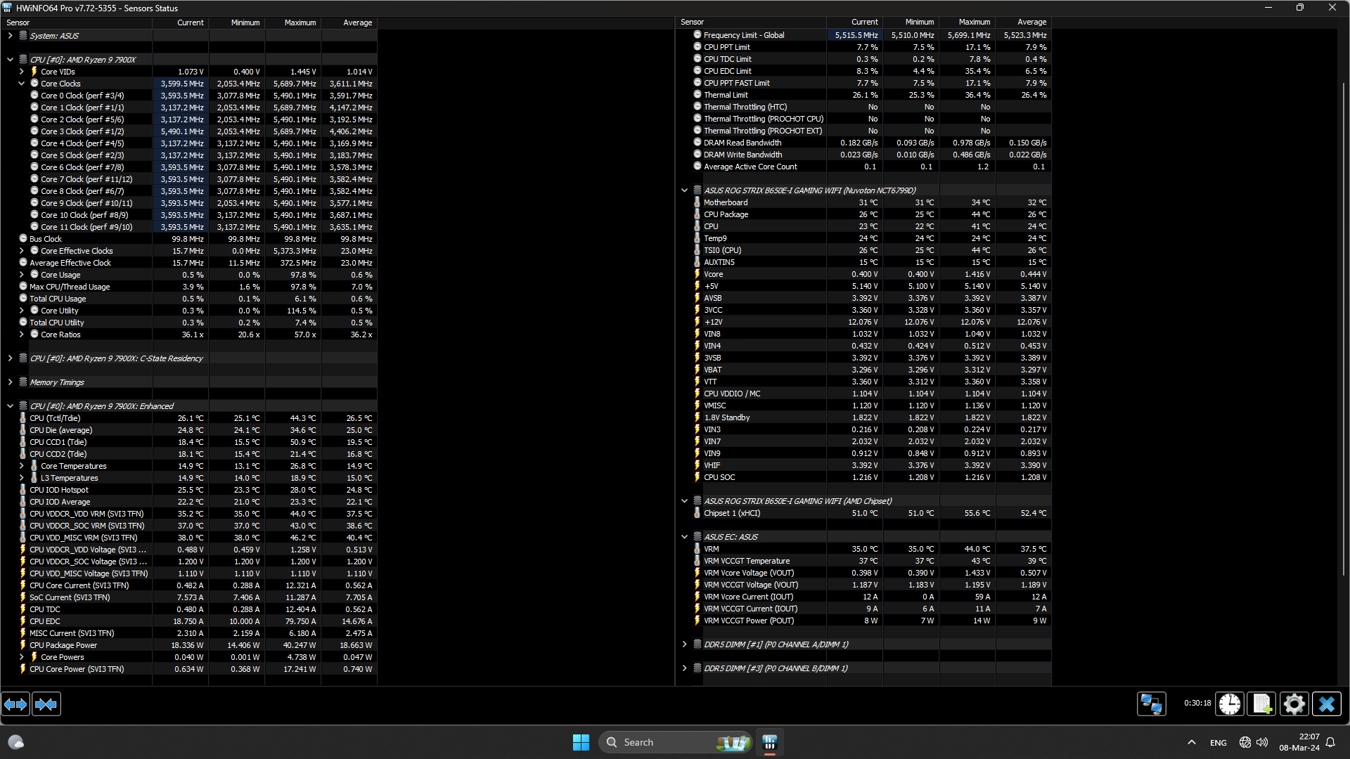 В режимі навантаження при типових налаштуваннях STRIX B650E-I забезпечила середню частоту ядер на рівні 5217,1 МГц з максимальним прискоренням одного ядра до 5,5 ГГц