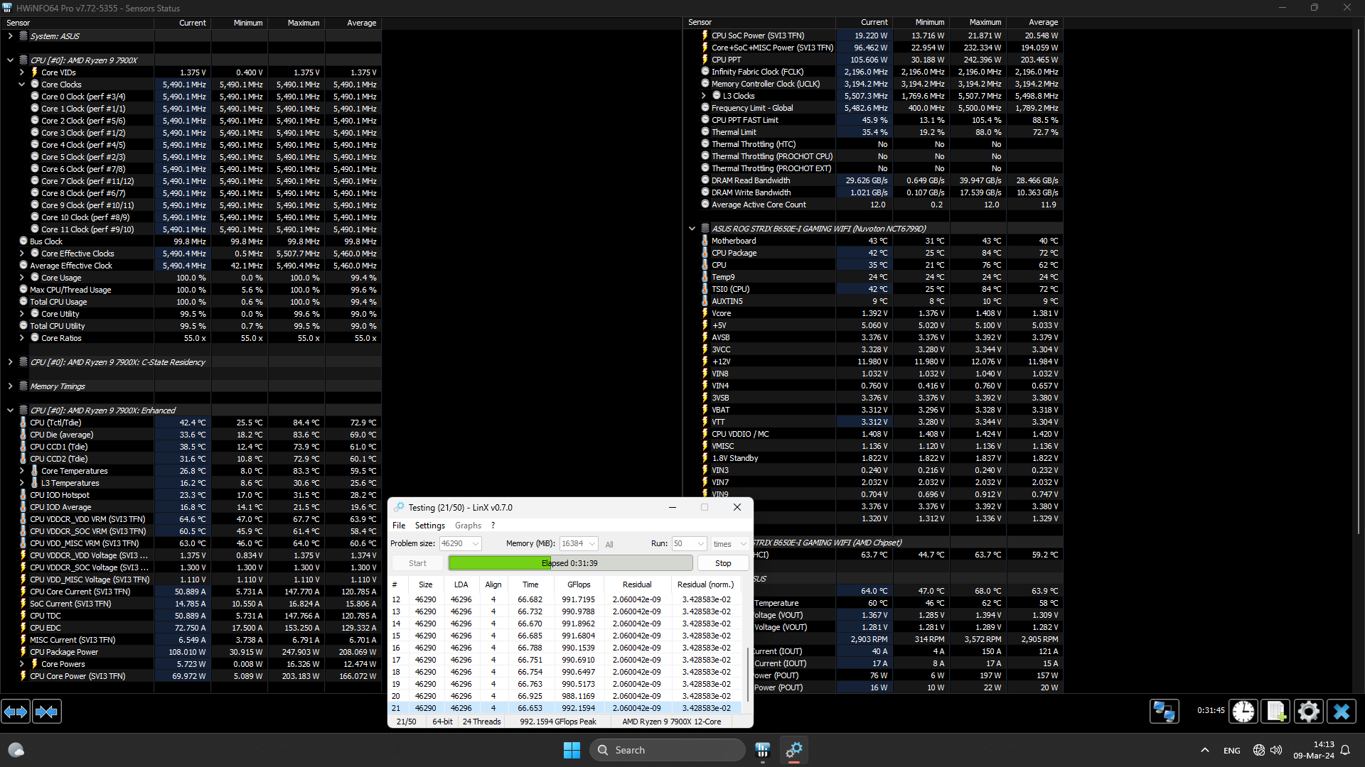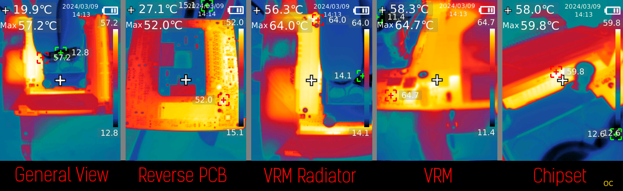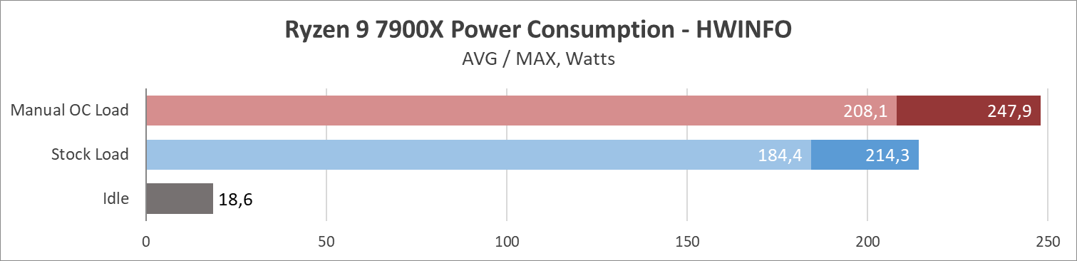 Материнська плата без проблем забезпечила стабільну роботу ОЗП в режимі DDR5-6400 CL32-39-39-30 2T. Попри присутність топології 1DPC стабілізувати роботу в режимі IMC 1:1 на частоті 6600 МГц не вдалось, спортивний режим для HWBOT не рахується. Процесор працював на частоті 5,5 ГГц за всіма ядрами, прискорення одного ядра окремо не налаштовувалось. FCLK дорівнювала 2200 МГц. Напруга ядра була на рівні 1,4 В, VDDP — 1,15 В, VDD та VDDQ — 1,4 В.