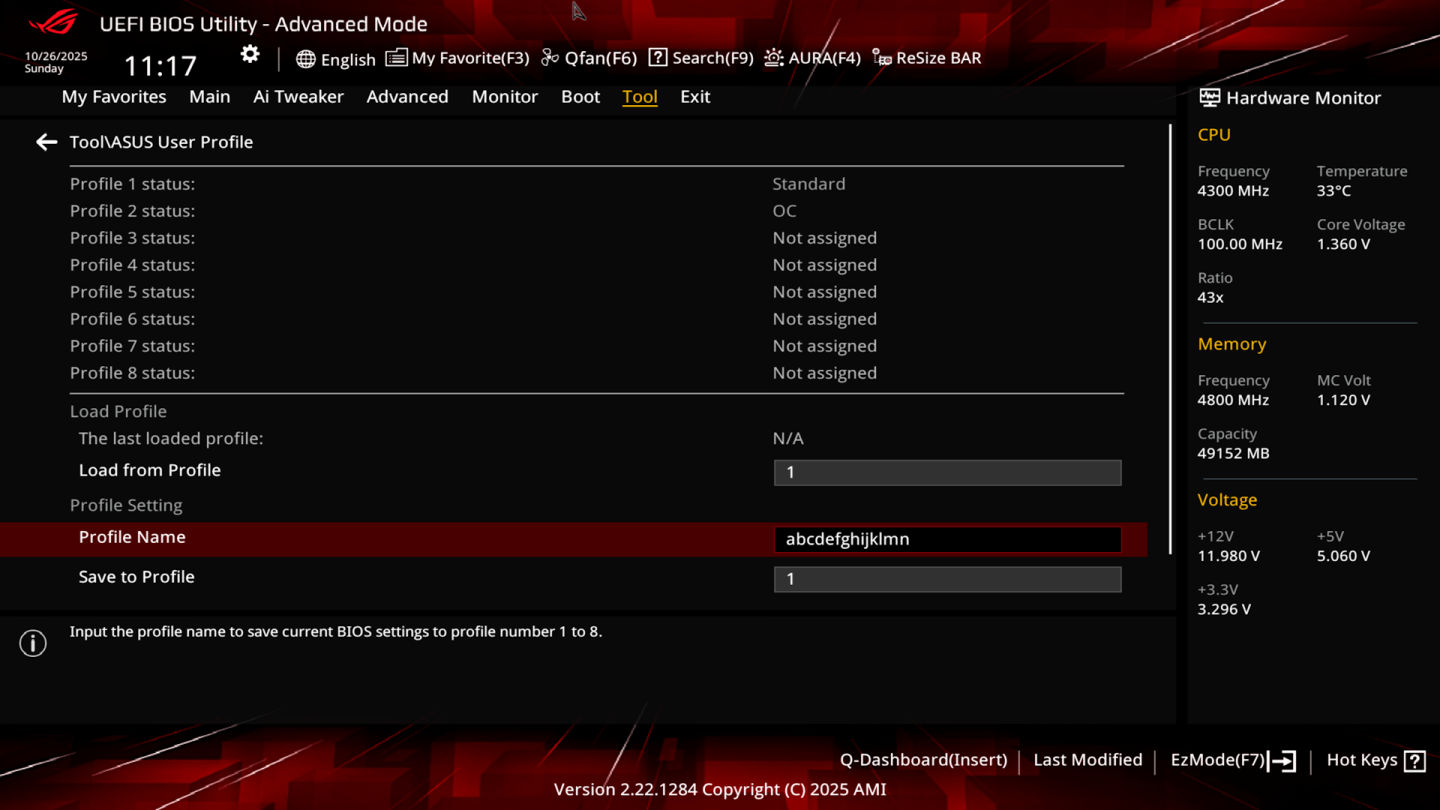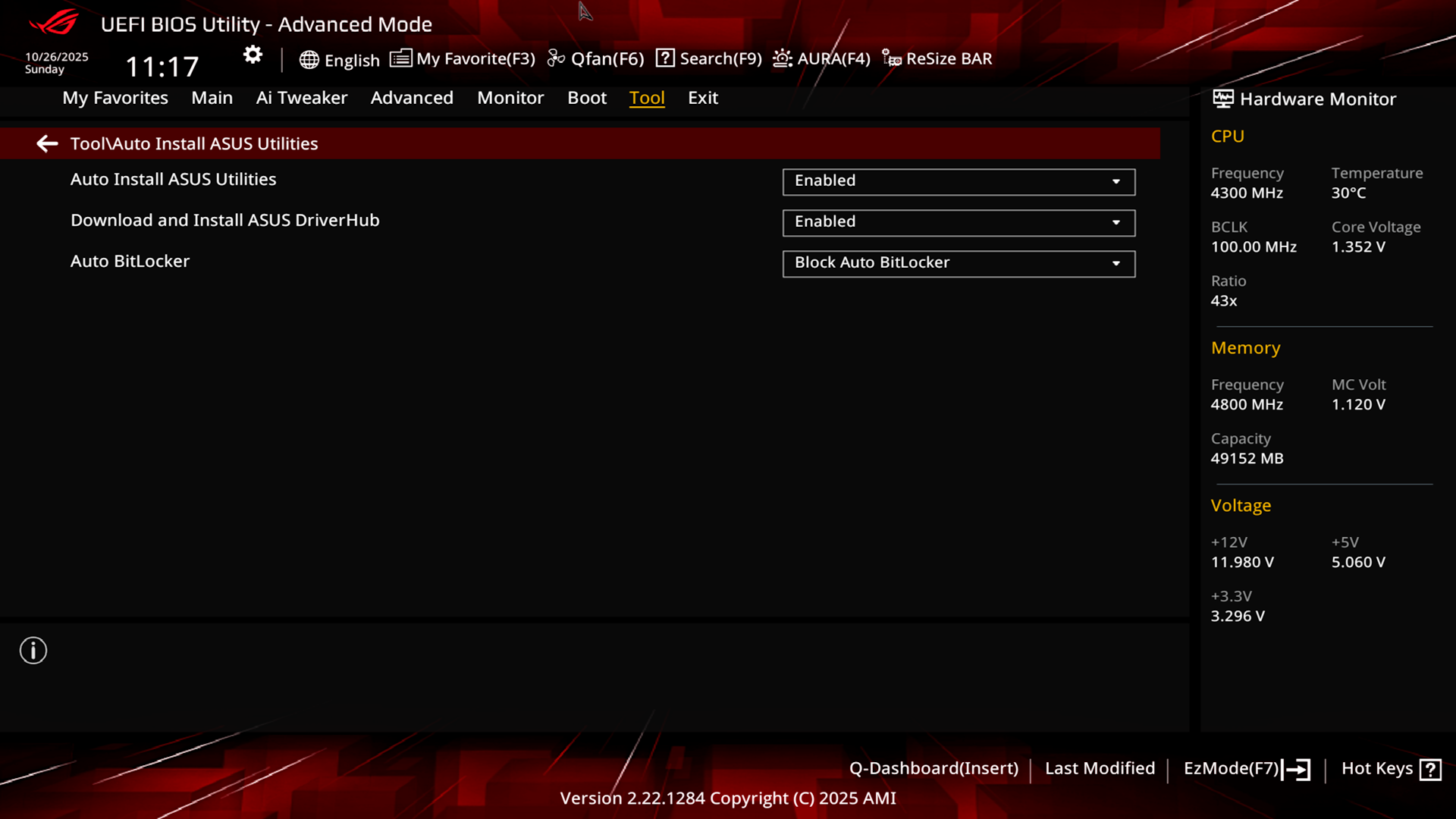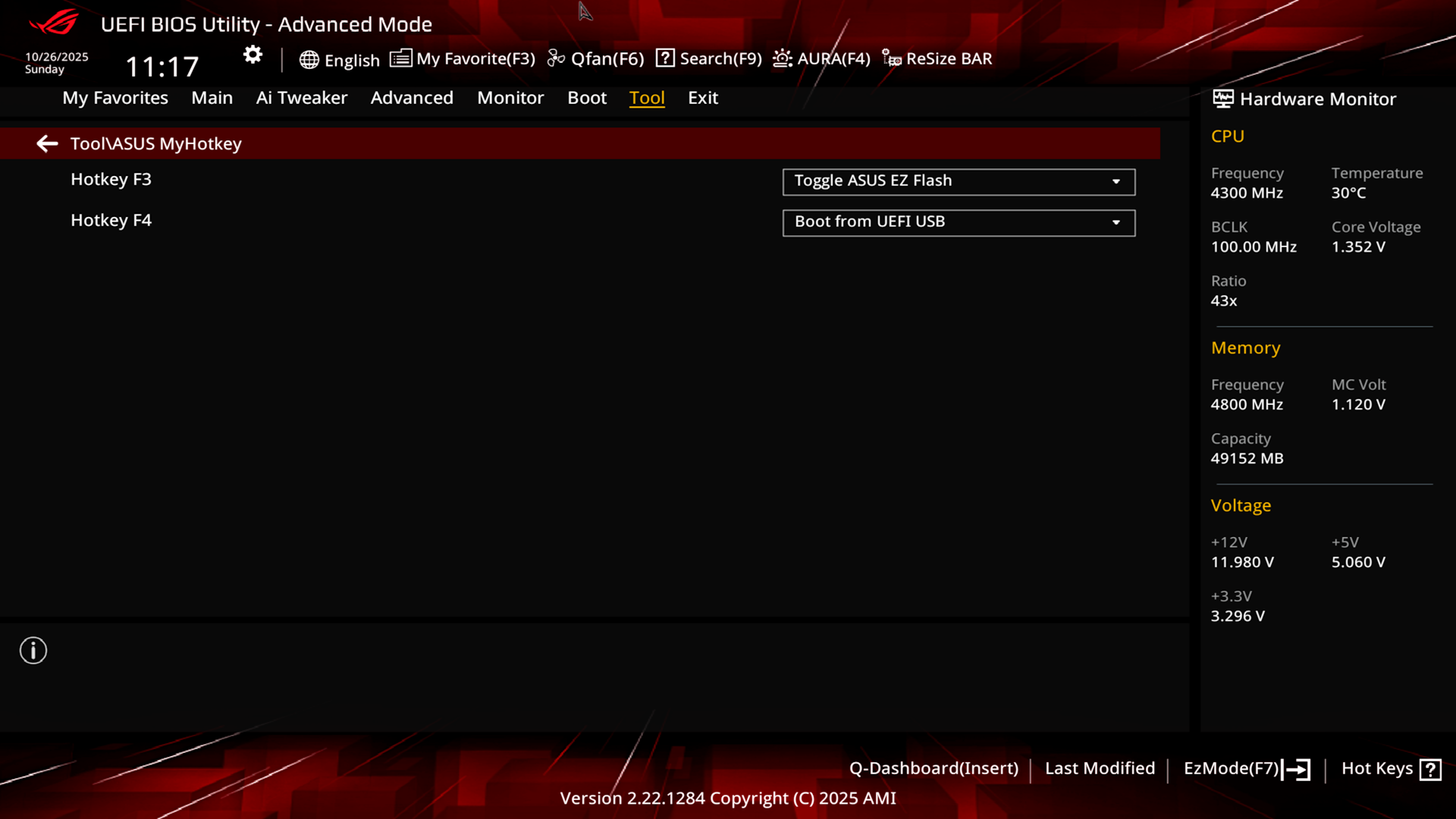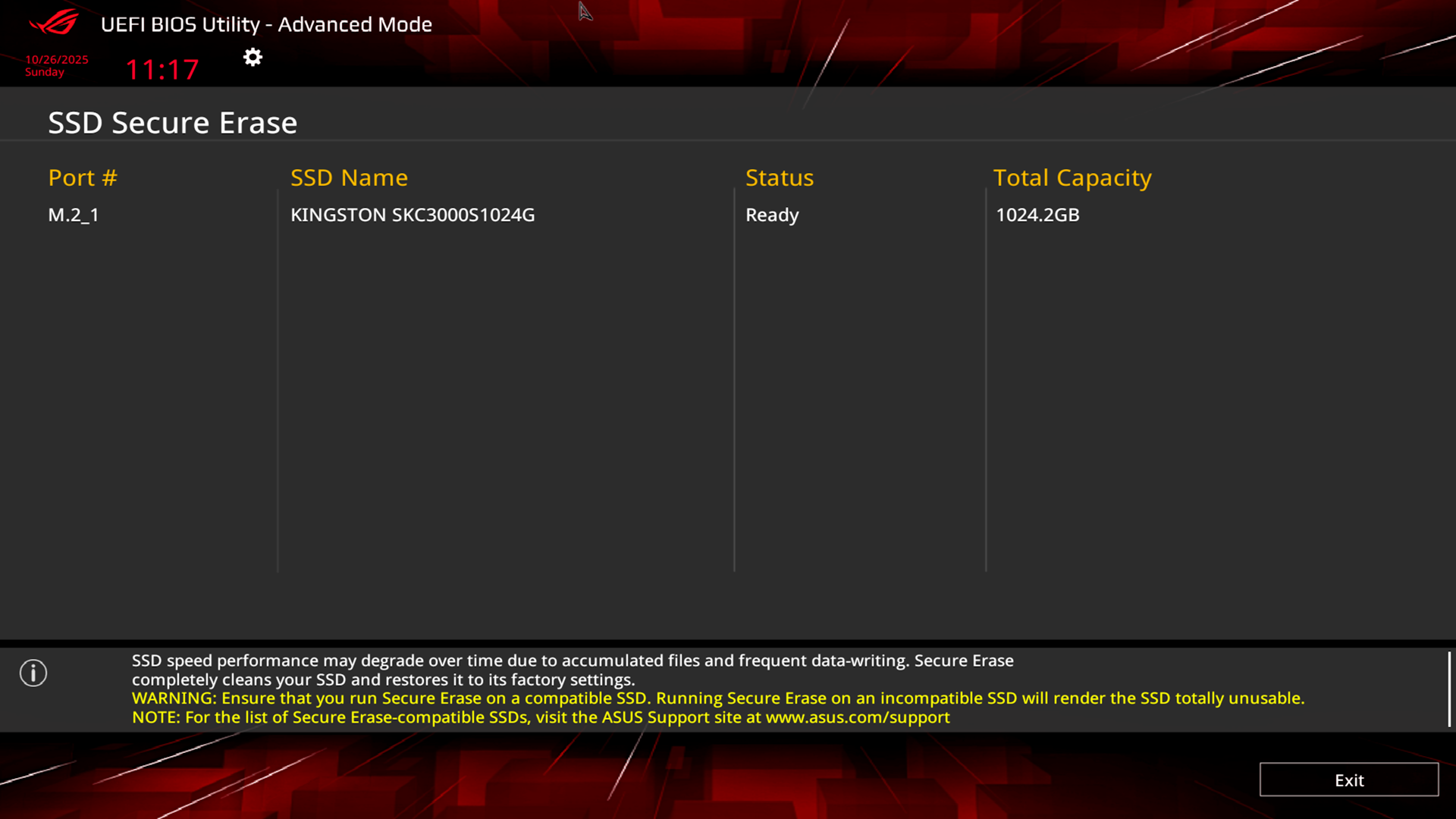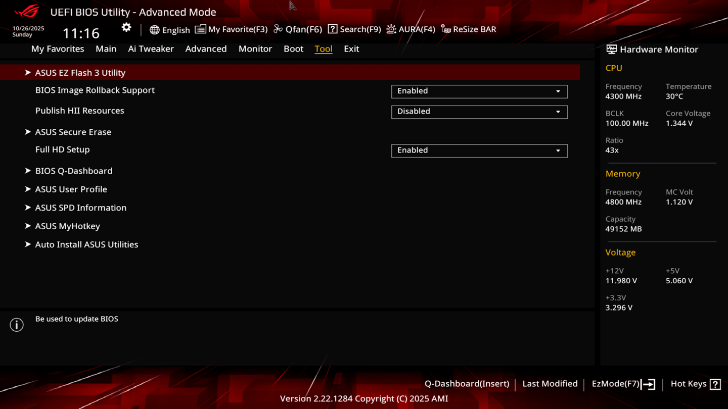 Вкладка Tool: тут знаходяться система профілів налаштувань ASUS User Profile (зберігаються в пам’яті плати, або імпортуються/експортуються на зовнішні накопичувачі), управління фірмовими технологіями виробника на кшталт ASUS DriverHub, MyHotKey, ASUS EZ Flash 3 Utility (для оновлення прошивки), Secure Erase для накопичувачів, FlexKey. Також присутнє ще одне посилання виклику BIOS Q‑Dashboard.