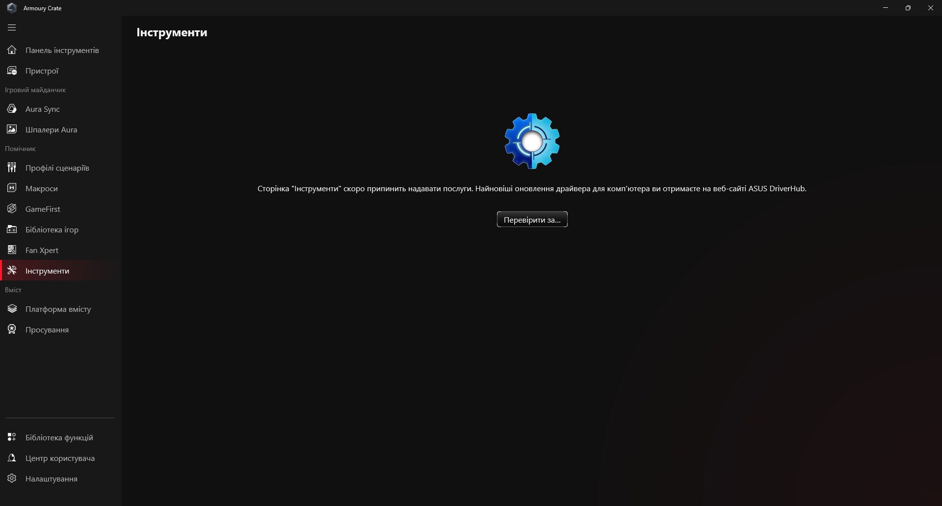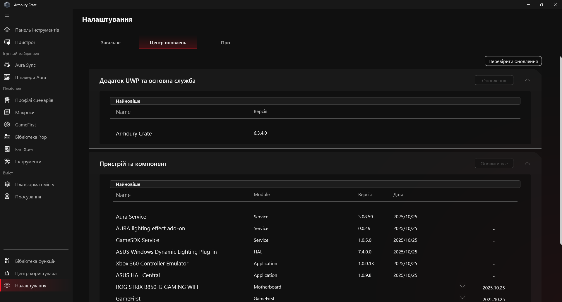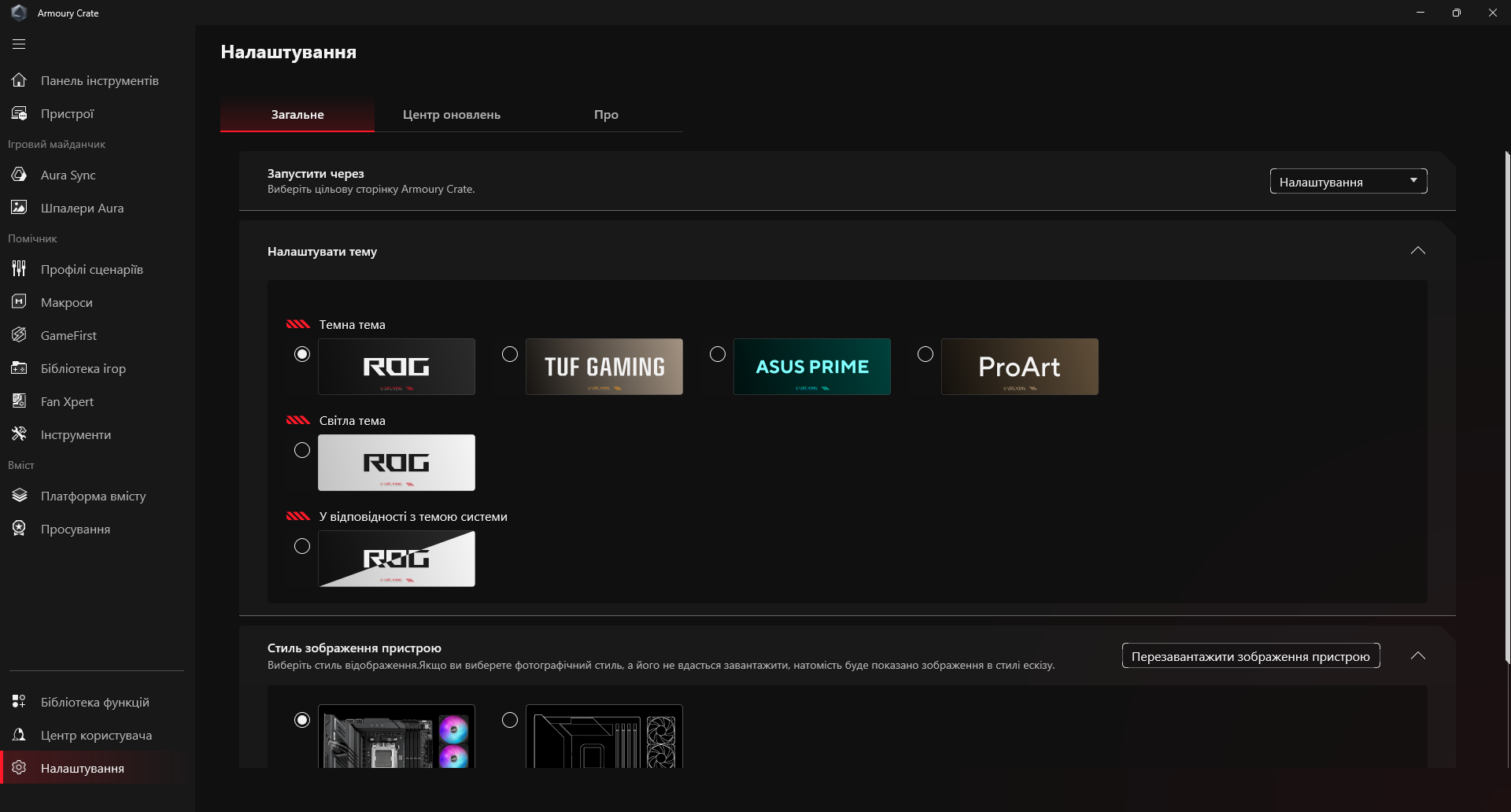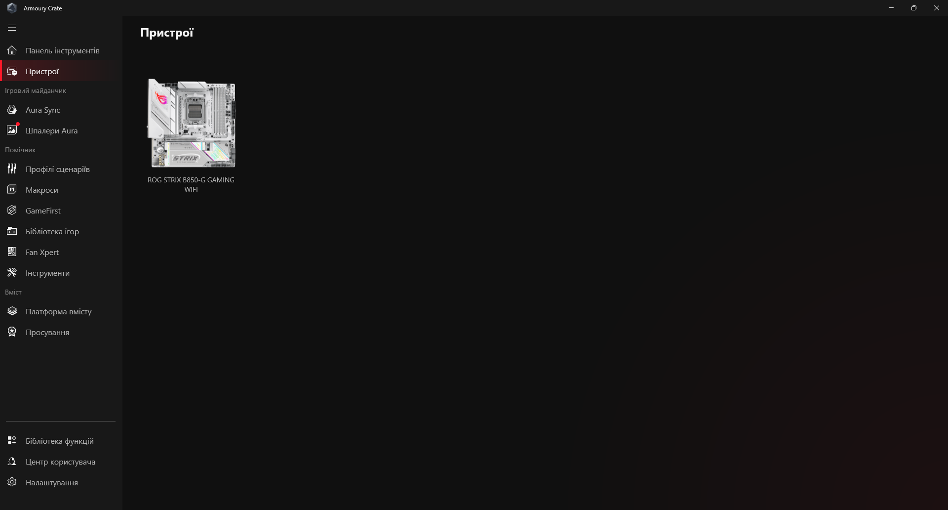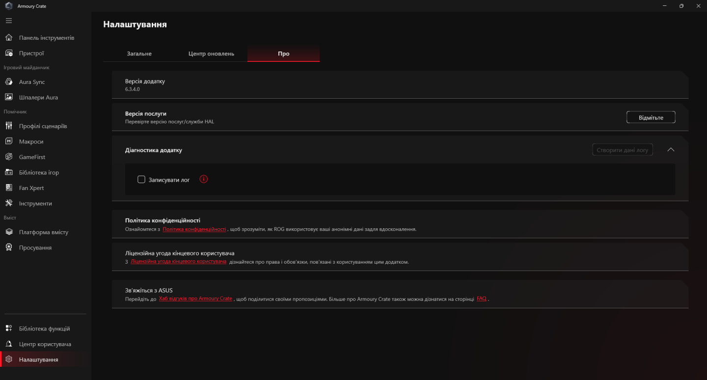 Головний хаб пристроїв та продукції ASUS — Armoury Crate. Завдяки йому все синхронізується та керується з єдиної консолі. Базовий застосунок дозволяє зареєструвати продукт, керувати RGB, отримати зведення по різних вузлах платформи й керувати ними. Можливо оновлювати прошивки фірмових пристроїв на кшталт маніпуляторів, а також налаштовувати їх через інтерфейс Armoury Crate. Додатково можна оптимізувати систему під виявлені ігри, створювати профілі для різних сценаріїв використання, встановити додаткові модулі типу Virtual Pet, додати функції ігрового майданчика, помічника, служби надавання вмісту. У застосунку присутня українська локалізація. Оновлення драйверів відбувається окремо через вебінтерфейс ASUS DriverHub.