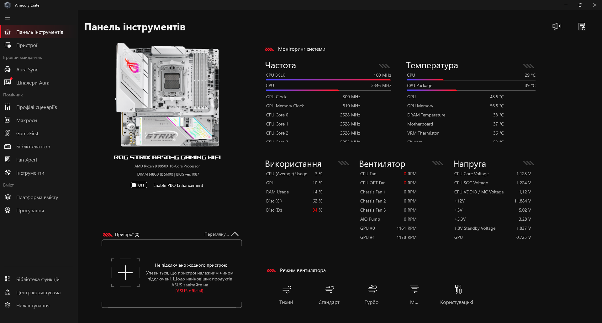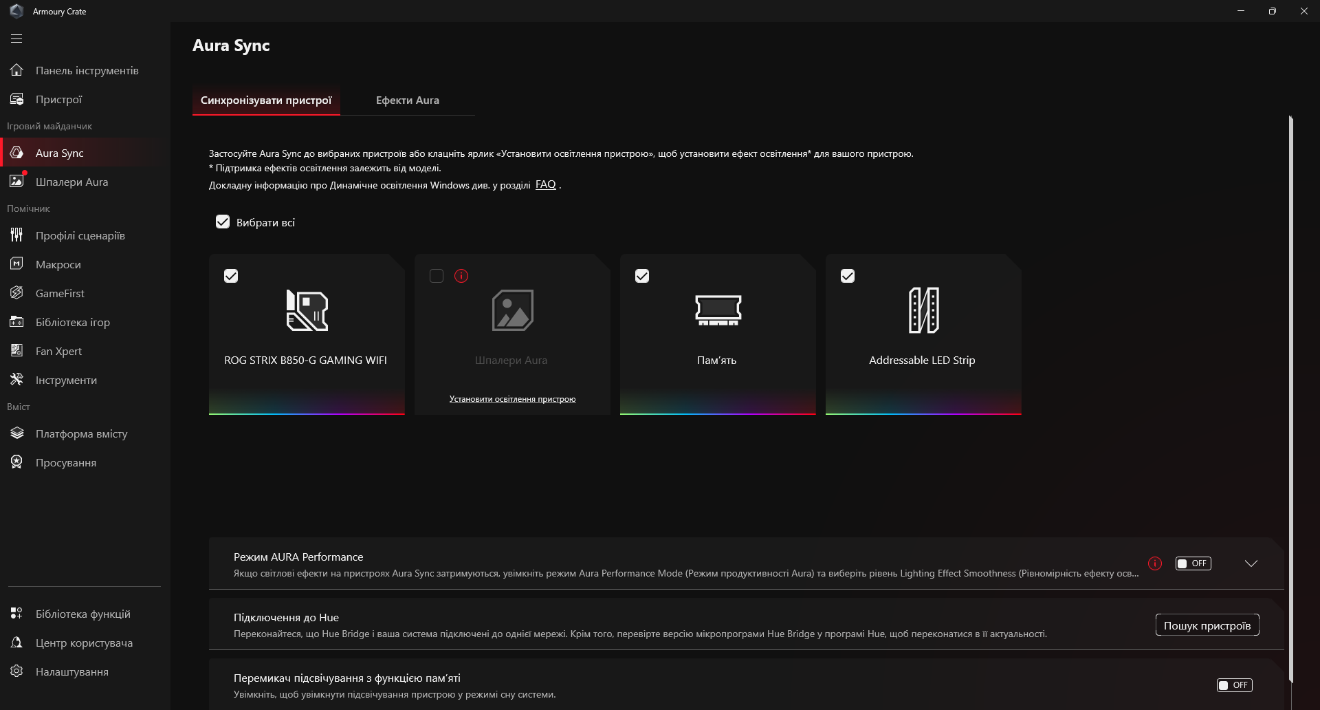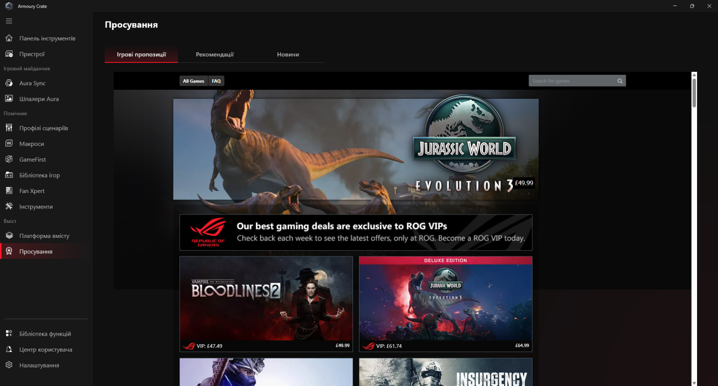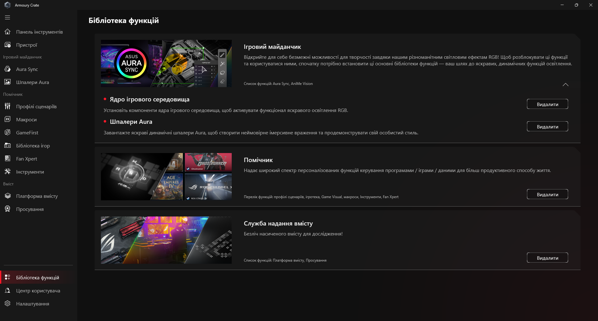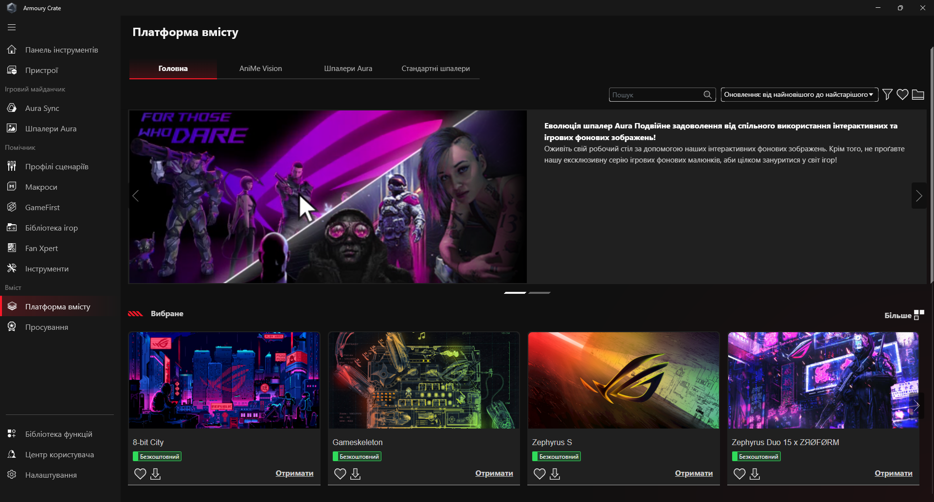Головний хаб пристроїв та продукції ASUS — Armoury Crate. Завдяки йому все синхронізується та керується з єдиної консолі. Базовий застосунок дозволяє зареєструвати продукт, керувати RGB, отримати зведення по різних вузлах платформи й керувати ними. Можливо оновлювати прошивки фірмових пристроїв на кшталт маніпуляторів, а також налаштовувати їх через інтерфейс Armoury Crate. Додатково можна оптимізувати систему під виявлені ігри, створювати профілі для різних сценаріїв використання, встановити додаткові модулі типу Virtual Pet, додати функції ігрового майданчика, помічника, служби надавання вмісту. У застосунку присутня українська локалізація. Оновлення драйверів відбувається окремо через вебінтерфейс ASUS DriverHub.