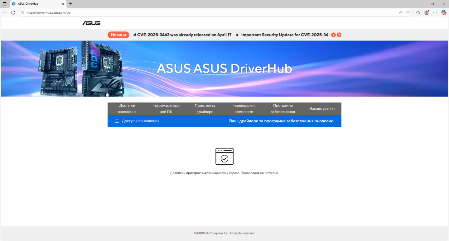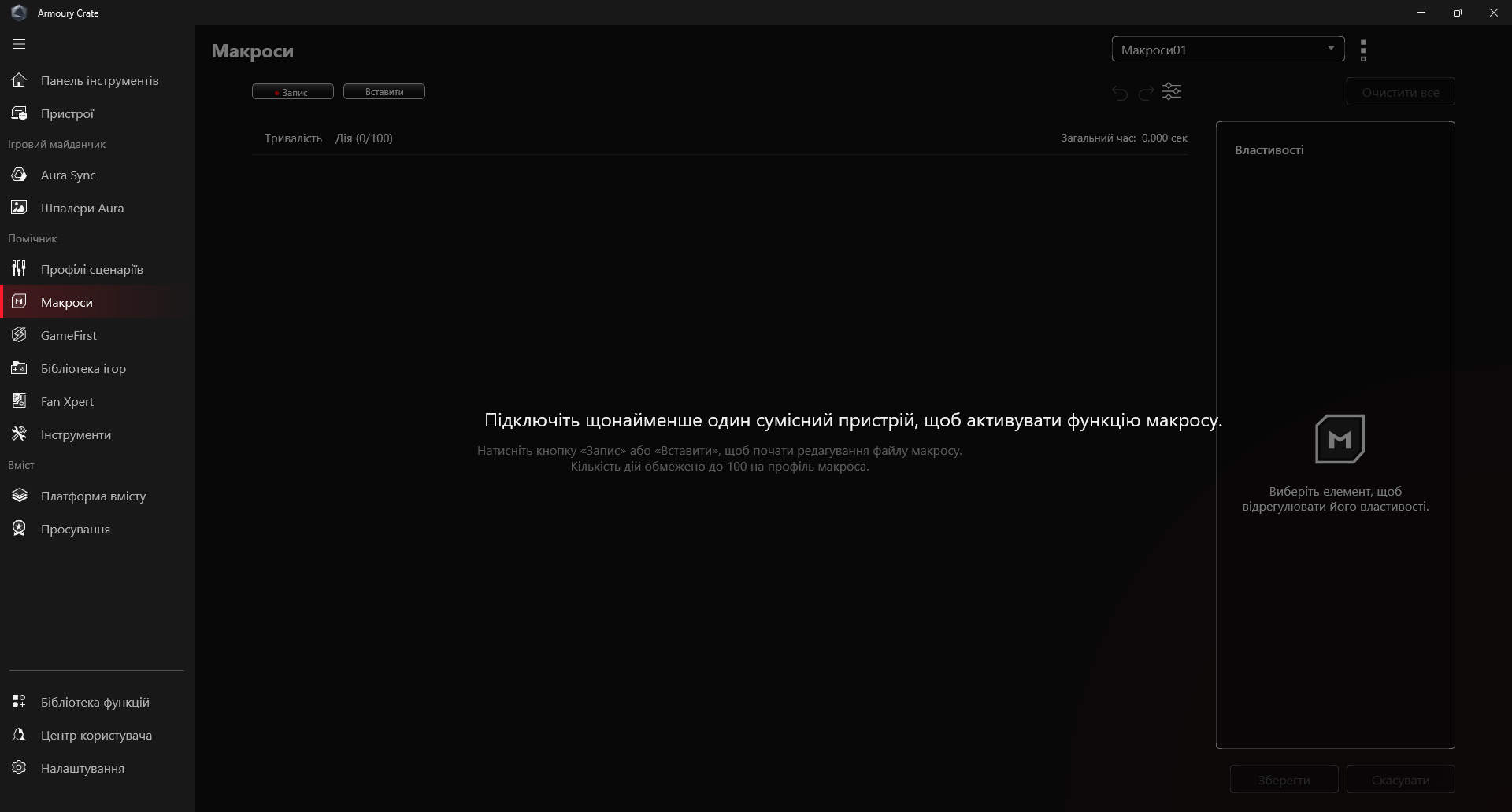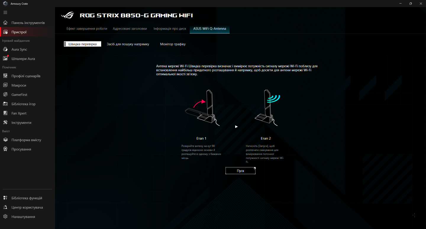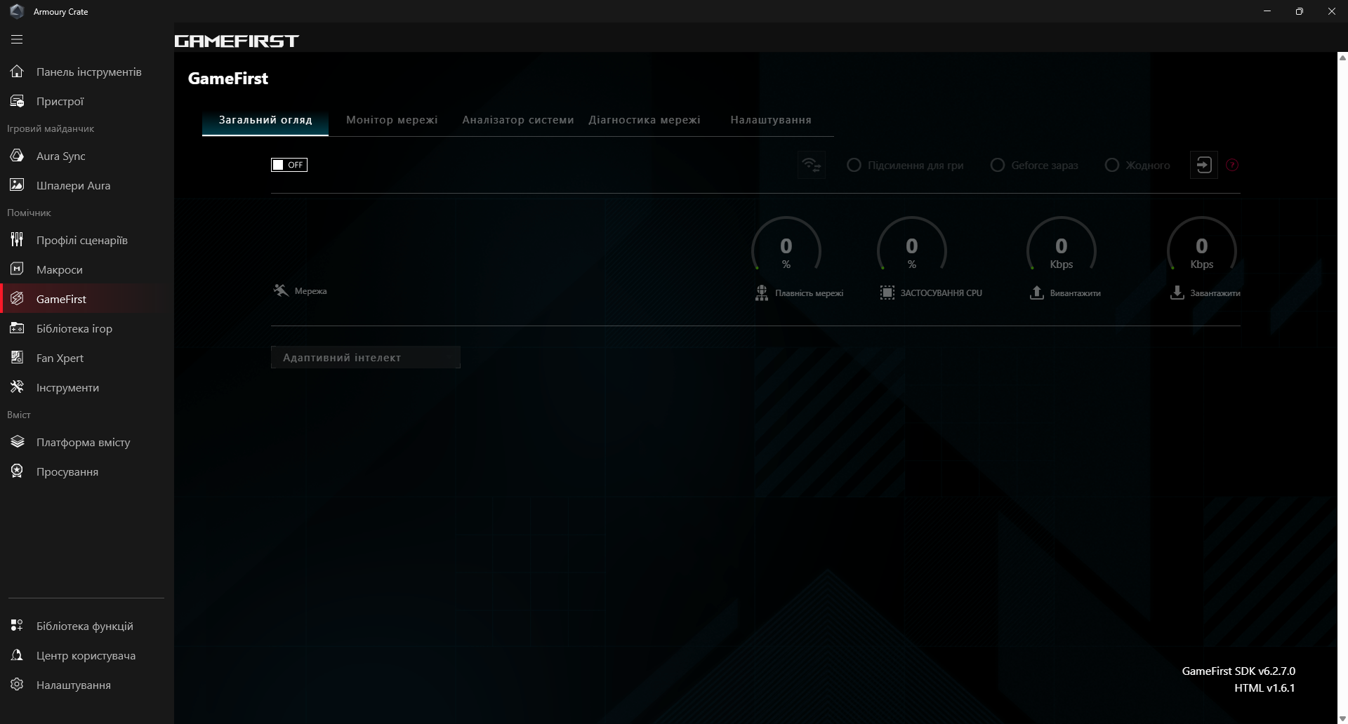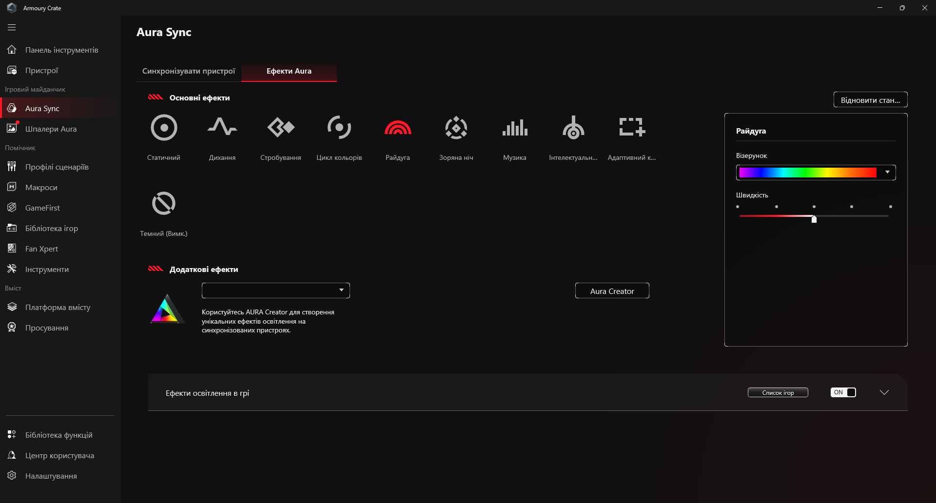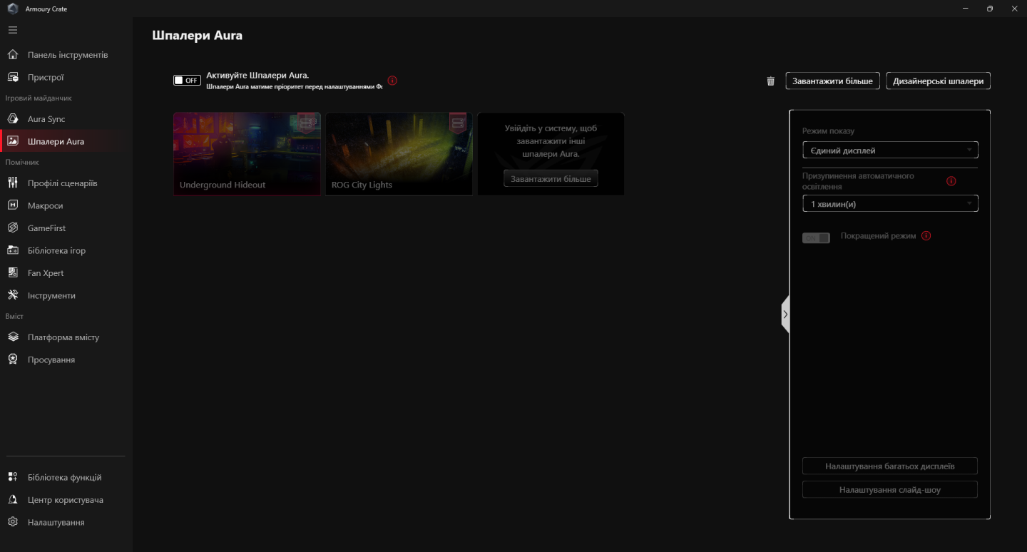 Головний хаб пристроїв та продукції ASUS — Armoury Crate. Завдяки йому все синхронізується та керується з єдиної консолі. Базовий застосунок дозволяє зареєструвати продукт, керувати RGB, отримати зведення по різних вузлах платформи й керувати ними. Можливо оновлювати прошивки фірмових пристроїв на кшталт маніпуляторів, а також налаштовувати їх через інтерфейс Armoury Crate. Додатково можна оптимізувати систему під виявлені ігри, створювати профілі для різних сценаріїв використання, встановити додаткові модулі типу Virtual Pet, додати функції ігрового майданчика, помічника, служби надавання вмісту. У застосунку присутня українська локалізація. Оновлення драйверів відбувається окремо через вебінтерфейс ASUS DriverHub.