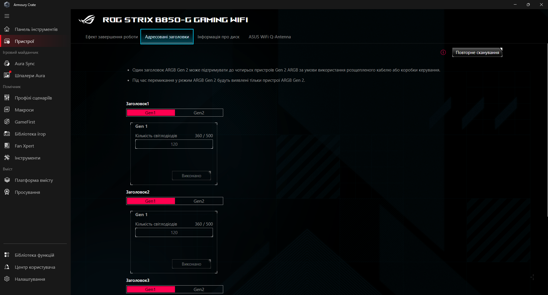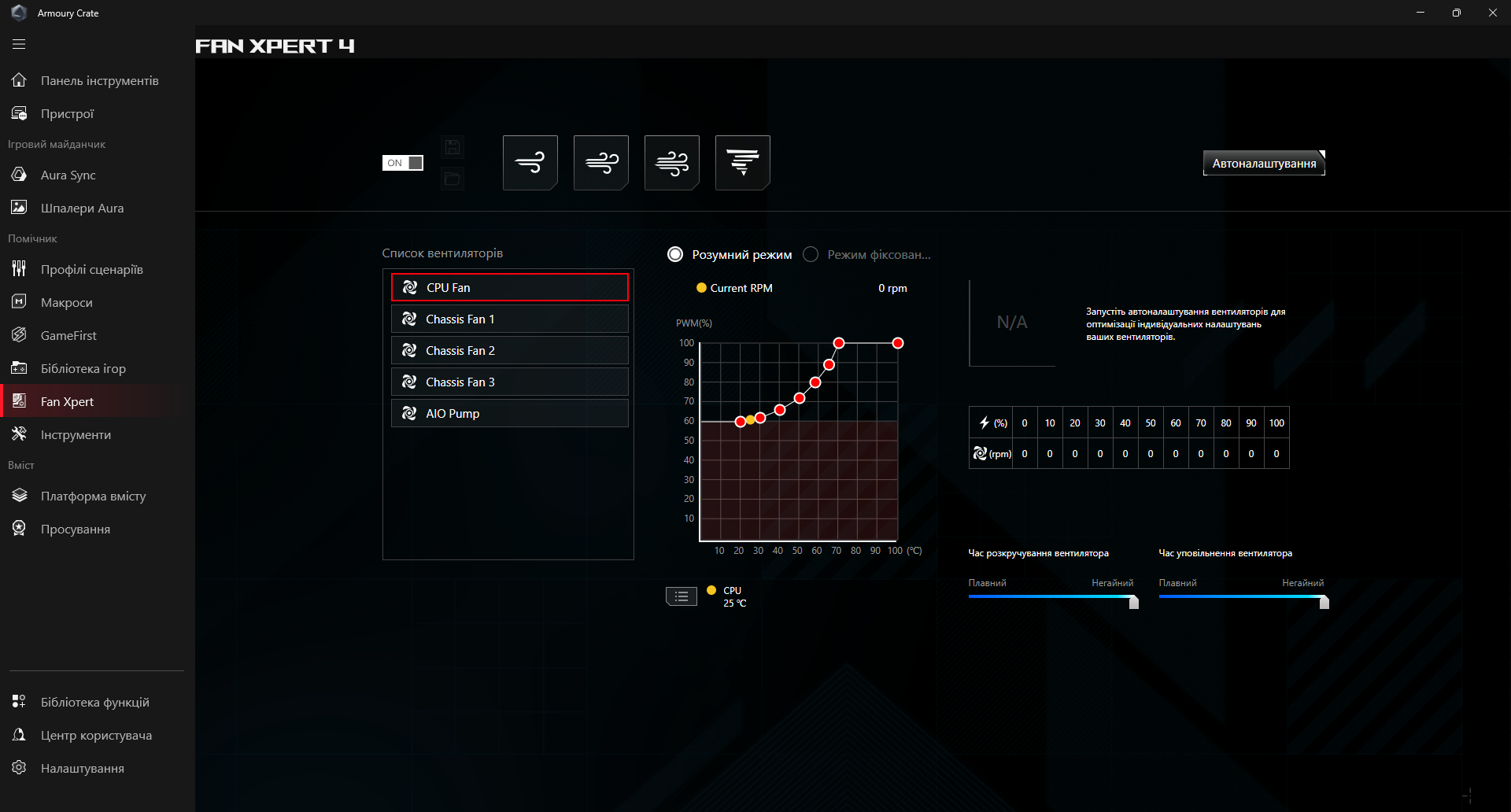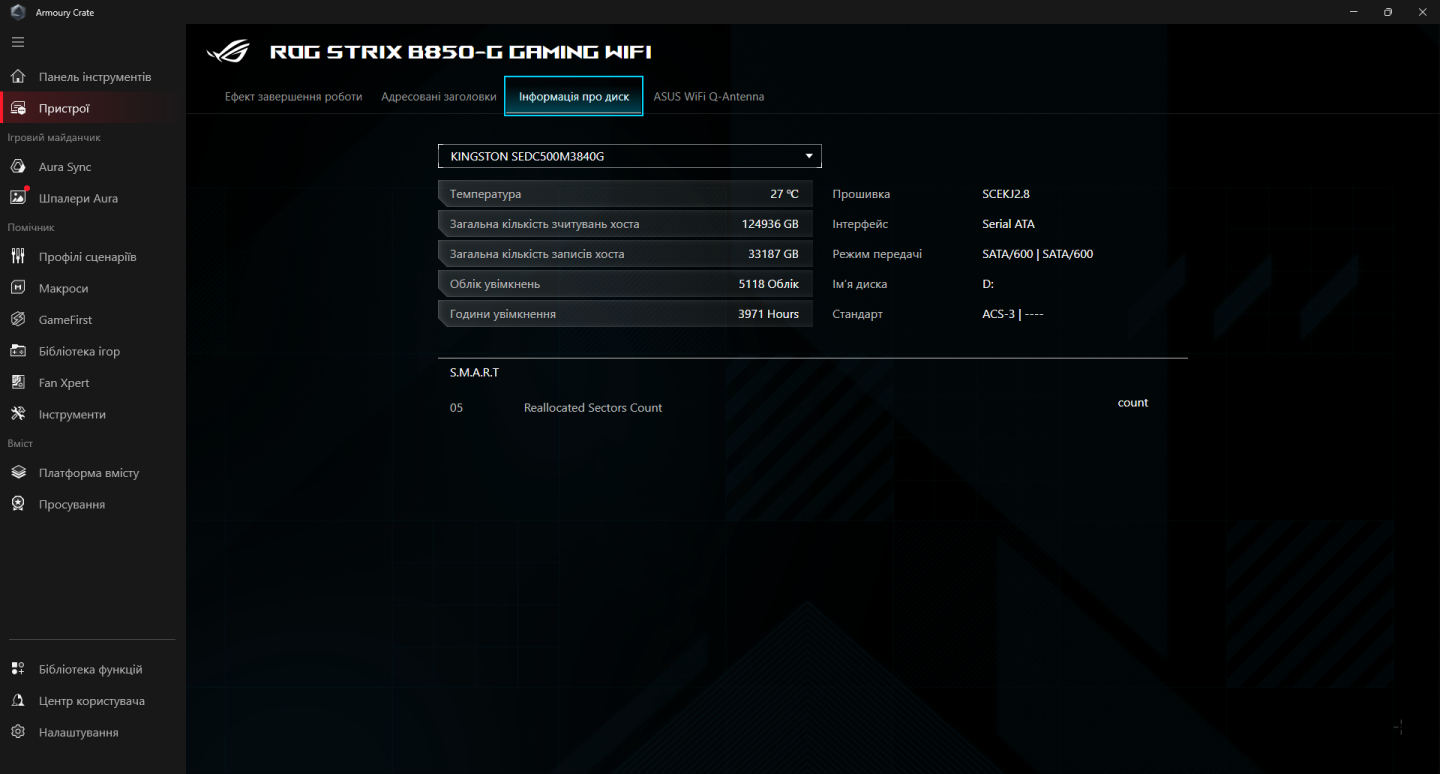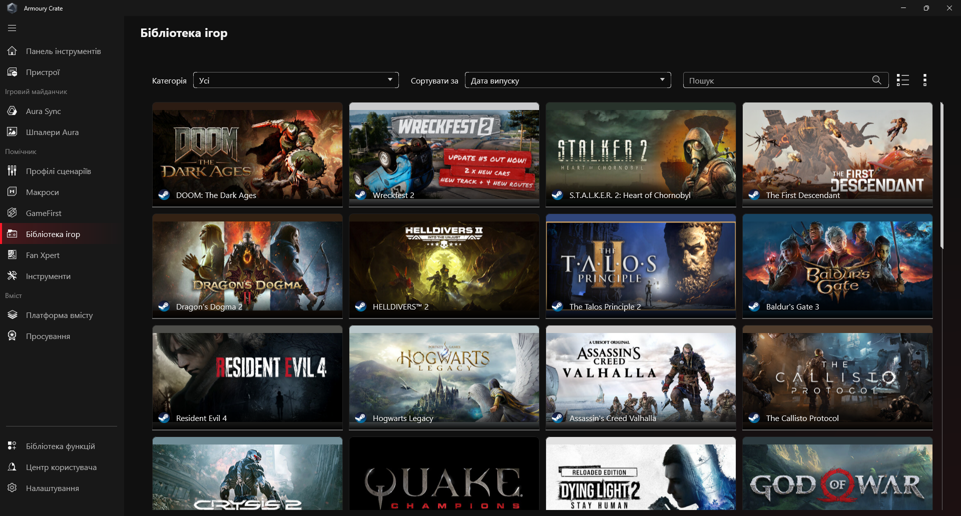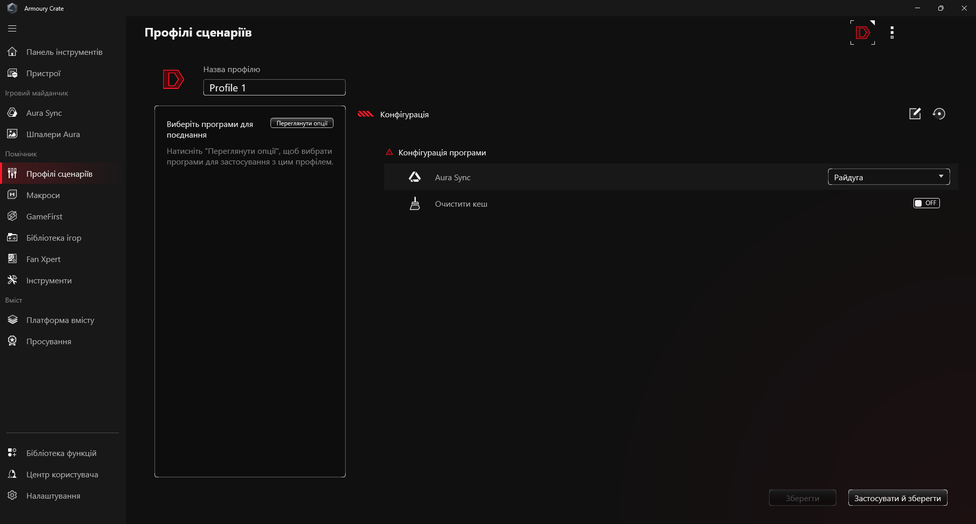 Головний хаб пристроїв та продукції ASUS — Armoury Crate. Завдяки йому все синхронізується та керується з єдиної консолі. Базовий застосунок дозволяє зареєструвати продукт, керувати RGB, отримати зведення по різних вузлах платформи й керувати ними. Можливо оновлювати прошивки фірмових пристроїв на кшталт маніпуляторів, а також налаштовувати їх через інтерфейс Armoury Crate. Додатково можна оптимізувати систему під виявлені ігри, створювати профілі для різних сценаріїв використання, встановити додаткові модулі типу Virtual Pet, додати функції ігрового майданчика, помічника, служби надавання вмісту. У застосунку присутня українська локалізація. Оновлення драйверів відбувається окремо через вебінтерфейс ASUS DriverHub.