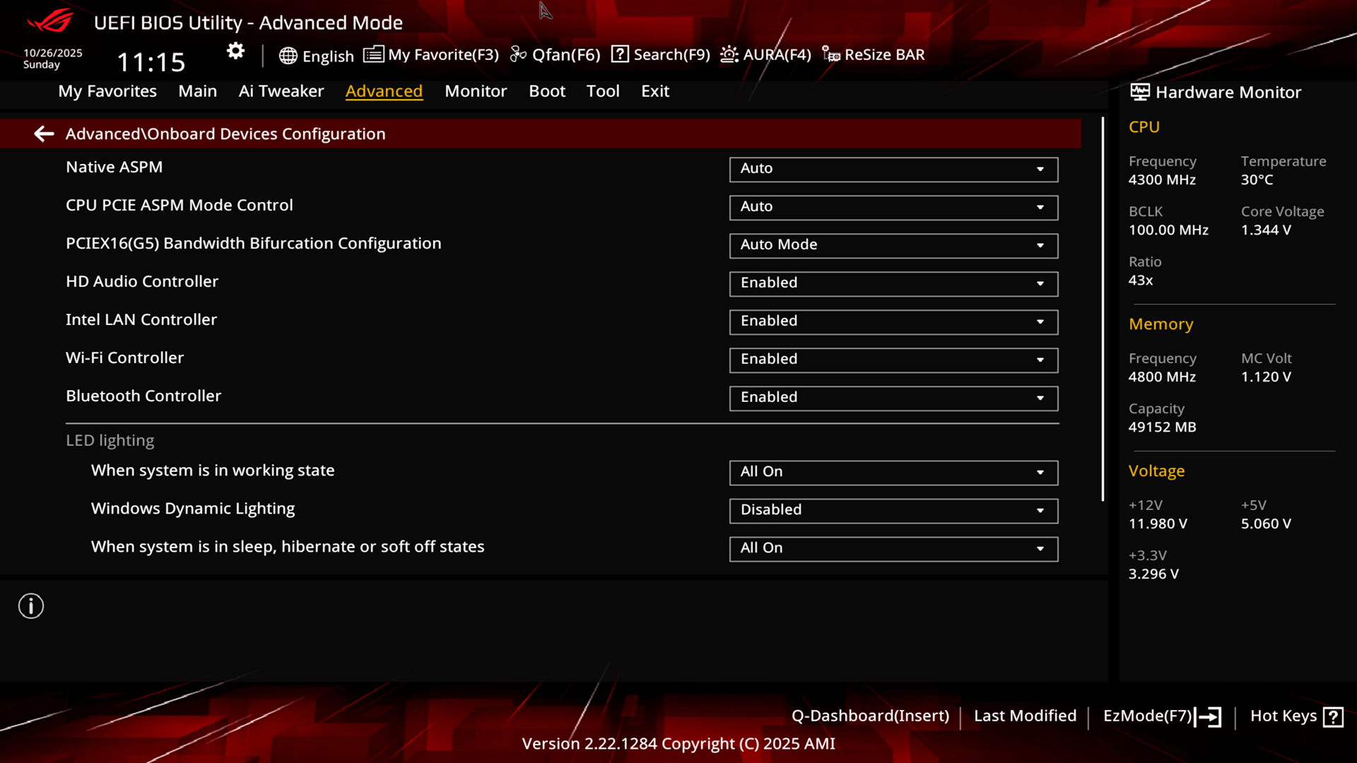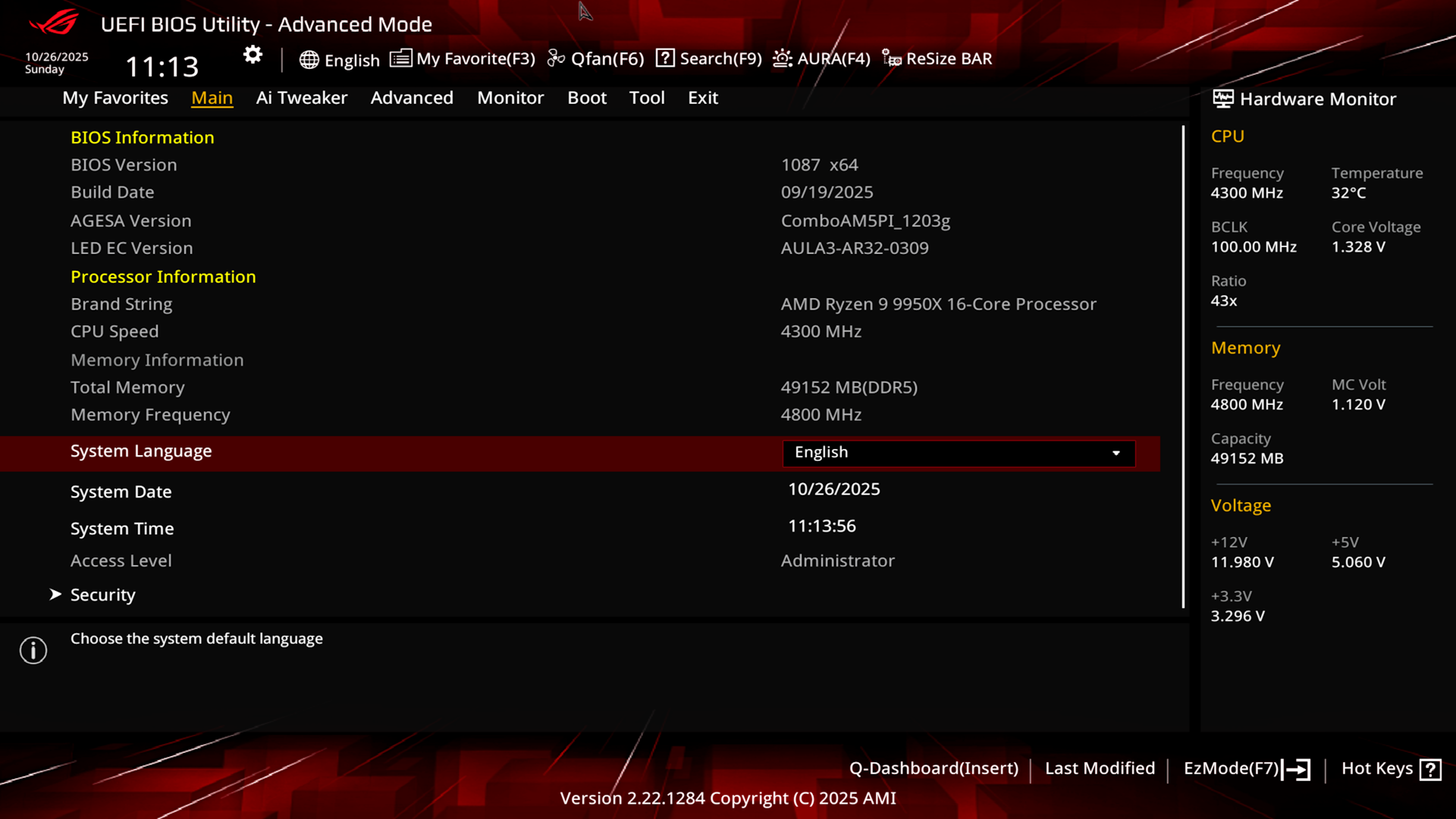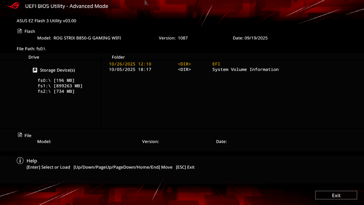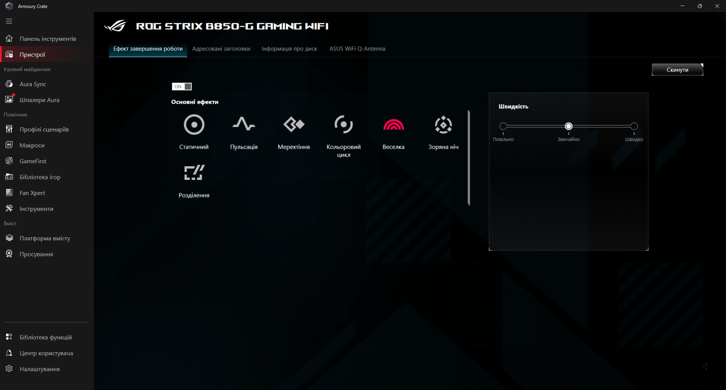 ASUS ROG Strix B850‑G Gaming WiFi керується типовим ASUS UEFI BIOS UTILITY, який стилізовано під лінійку продуктів Republic of Gamers. Пропонуються два варіанти керування: EZ Mode та Advanced Mode.