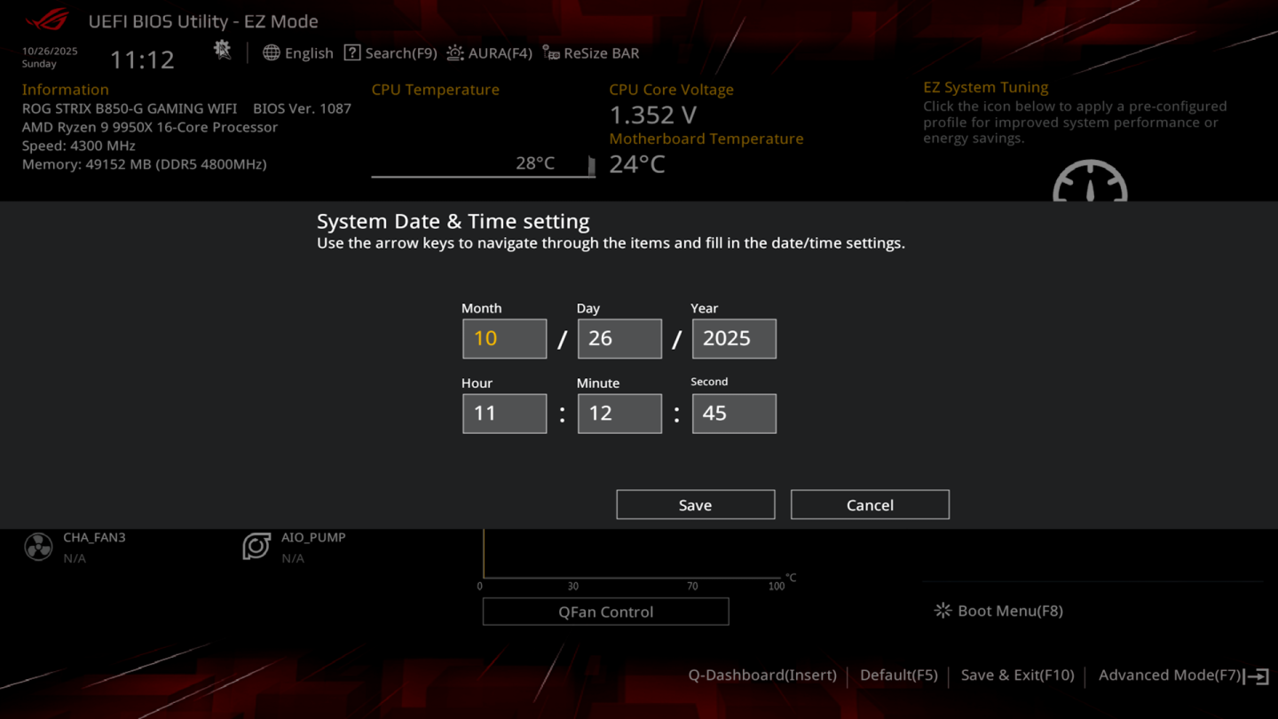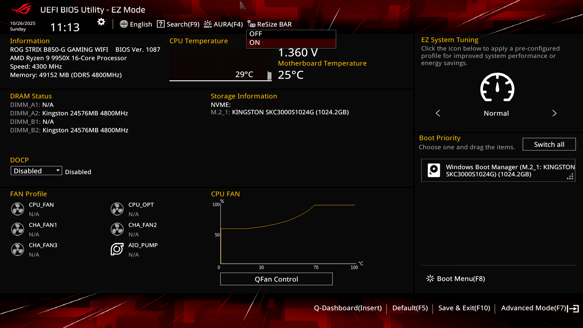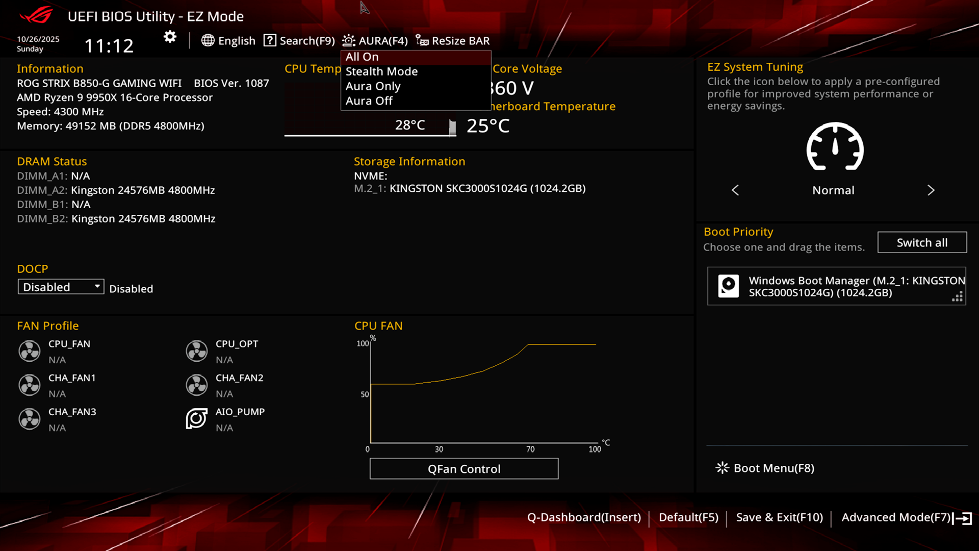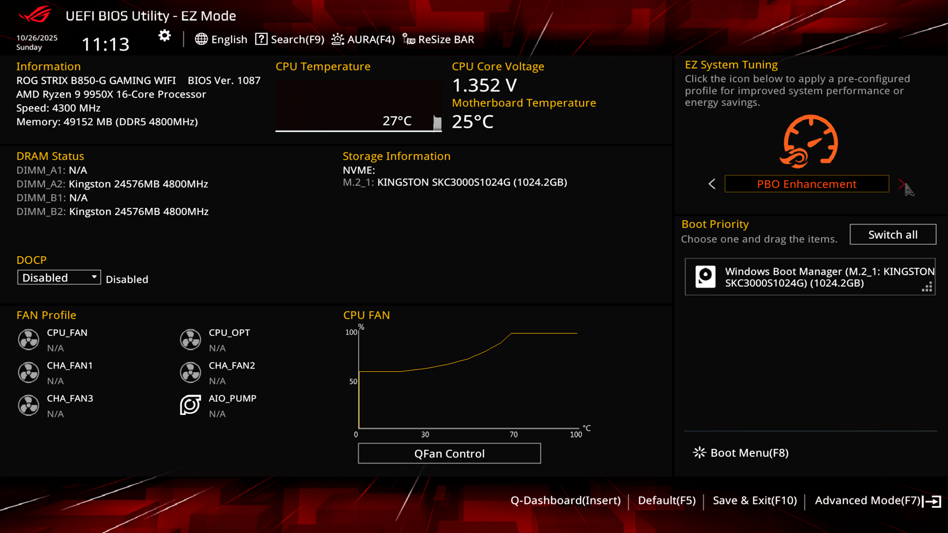 Режим керування EZ Mode реалізовано в рамках однієї сторінки. В ньому користувач може отримати стандартний звіт по ключових елементах системи, вказати системний час, обрати мову інтерфейсу, знайти потрібну опцію за пошуком, налаштувати AURA (система RGB), ResizeBAR, криву обертів вентиляторів, пустити в дію профілі AMD EXPO, у разі їх наявності, чи AEMP (ASUS Enhanced Memory Profile) для свого комплекту ОЗП, налаштувати RAID (доступна функціональність залежить від процесора), вказати пріоритет завантаження з мережі чи накопичувачів, а також викликати інтерфейс Q‑Dashboard. Автоматичний оверклокінг у цієї моделі відсутній, натомість пропонується форсування режиму PBO Enchancement (Precision Boost Overdrive), а це не є ексклюзивною функцією, вона доступна всюди через меню AMD Overclocking.