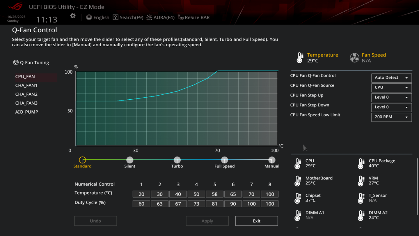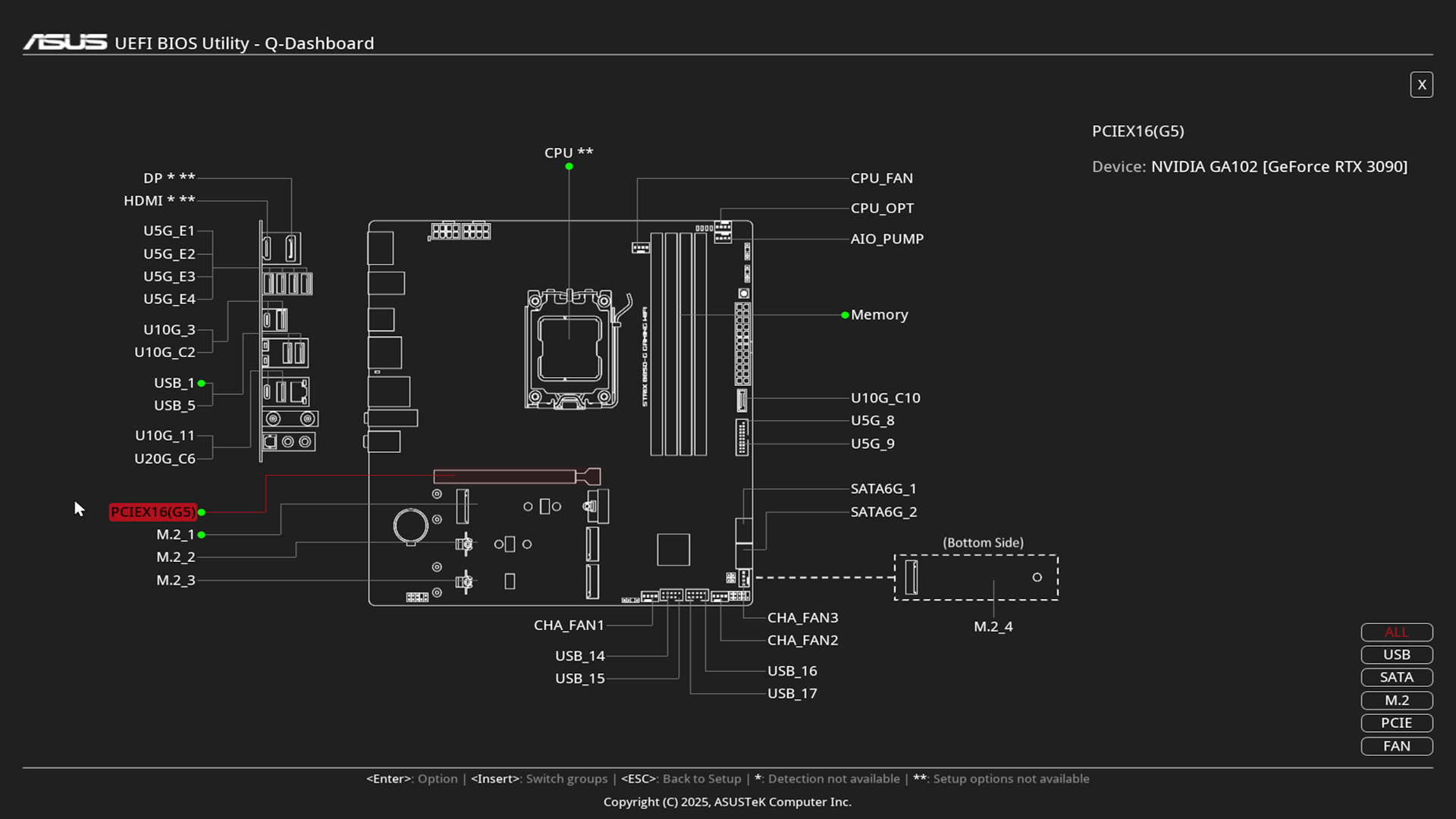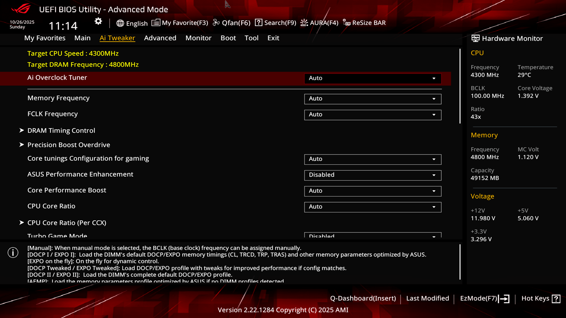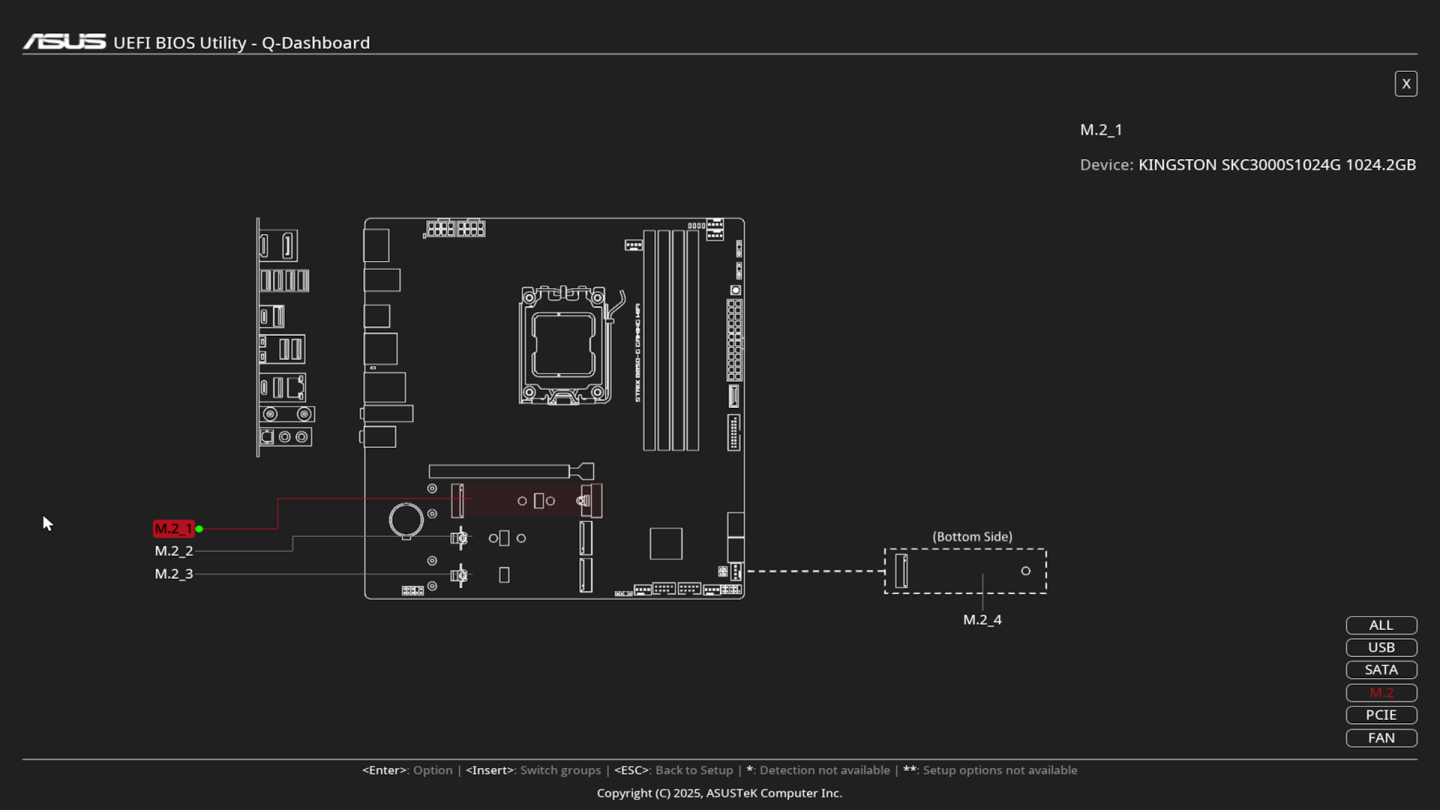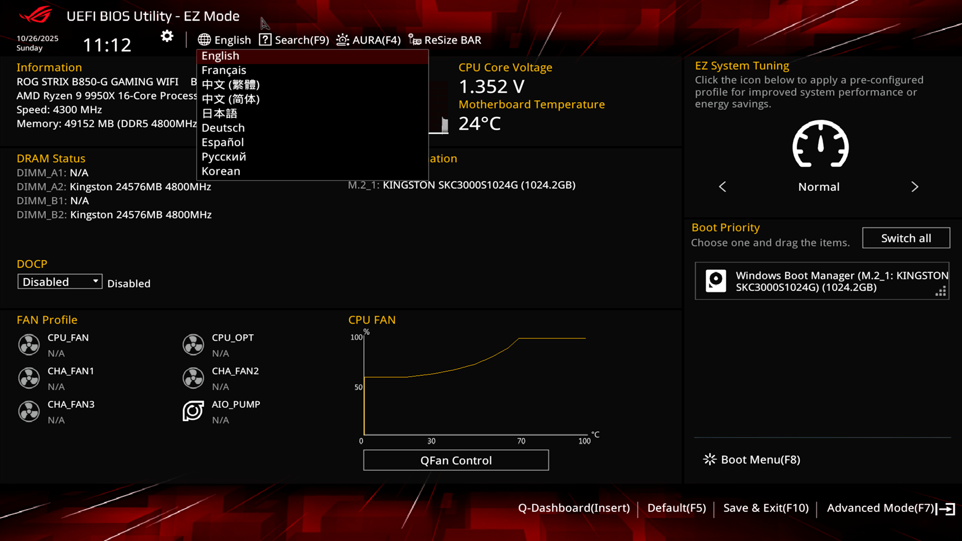 Режим керування EZ Mode реалізовано в рамках однієї сторінки. В ньому користувач може отримати стандартний звіт по ключових елементах системи, вказати системний час, обрати мову інтерфейсу, знайти потрібну опцію за пошуком, налаштувати AURA (система RGB), ResizeBAR, криву обертів вентиляторів, пустити в дію профілі AMD EXPO, у разі їх наявності, чи AEMP (ASUS Enhanced Memory Profile) для свого комплекту ОЗП, налаштувати RAID (доступна функціональність залежить від процесора), вказати пріоритет завантаження з мережі чи накопичувачів, а також викликати інтерфейс Q‑Dashboard. Автоматичний оверклокінг у цієї моделі відсутній, натомість пропонується форсування режиму PBO Enchancement (Precision Boost Overdrive), а це не є ексклюзивною функцією, вона доступна всюди через меню AMD Overclocking.
