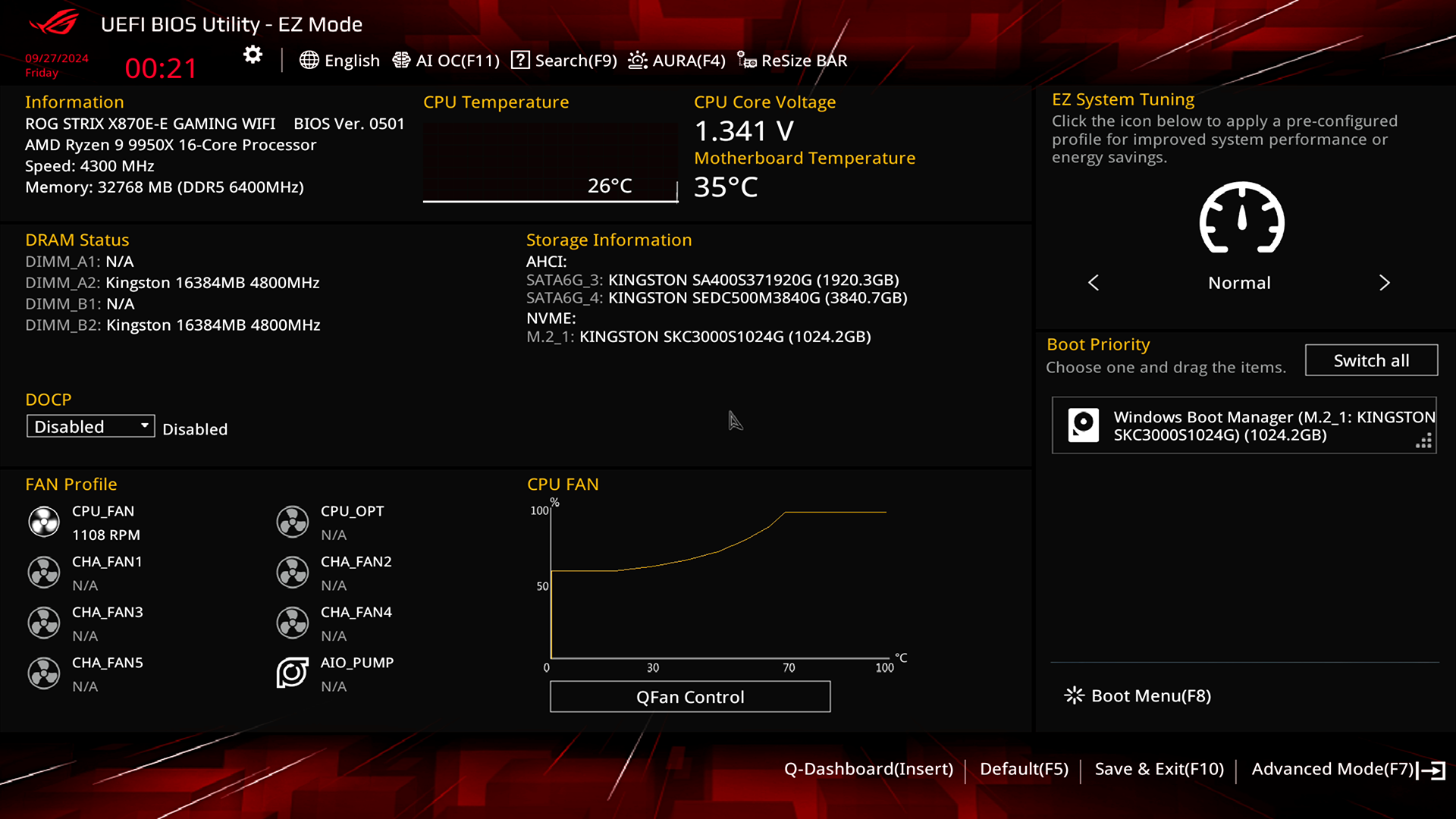 ROG Strix X870E-E Gaming WiFi керується новим ASUS UEFI BIOS UTILITY, який в конкретному випадку стилізовано під лінійку продуктів ROG. Передбачено два режими відображення налаштувань: Advanced Mode й EZ Mode. Крім цього ASUS нарешті забезпечили нативний широкоформатний режим відображення UEFI, що значно підвищує комфорт роботи під час налаштувань та експериментів. Традиційно почнемо з EZ Mode.