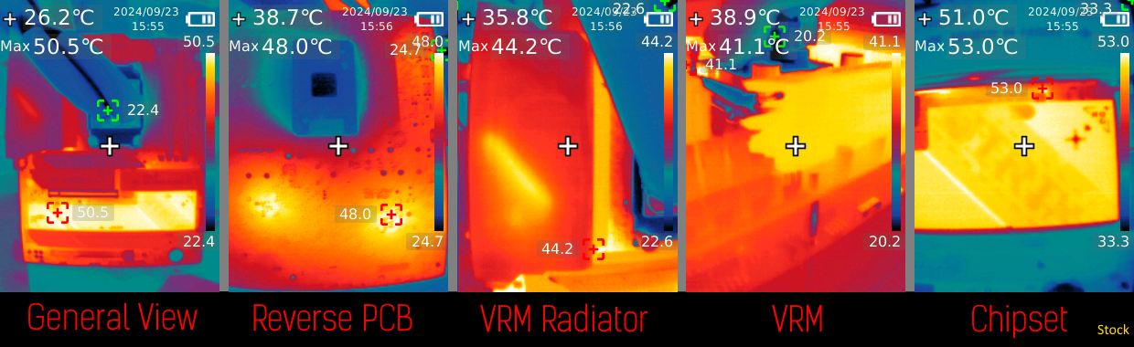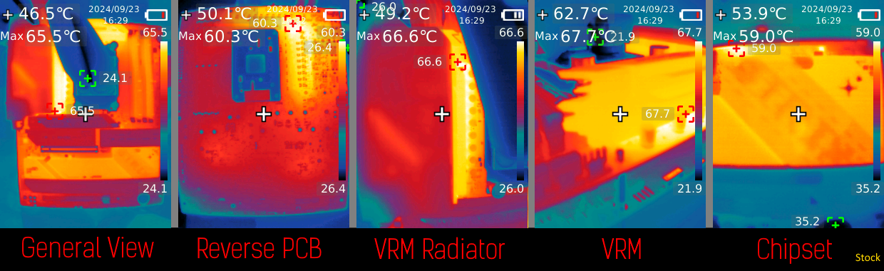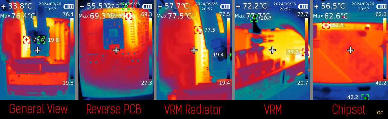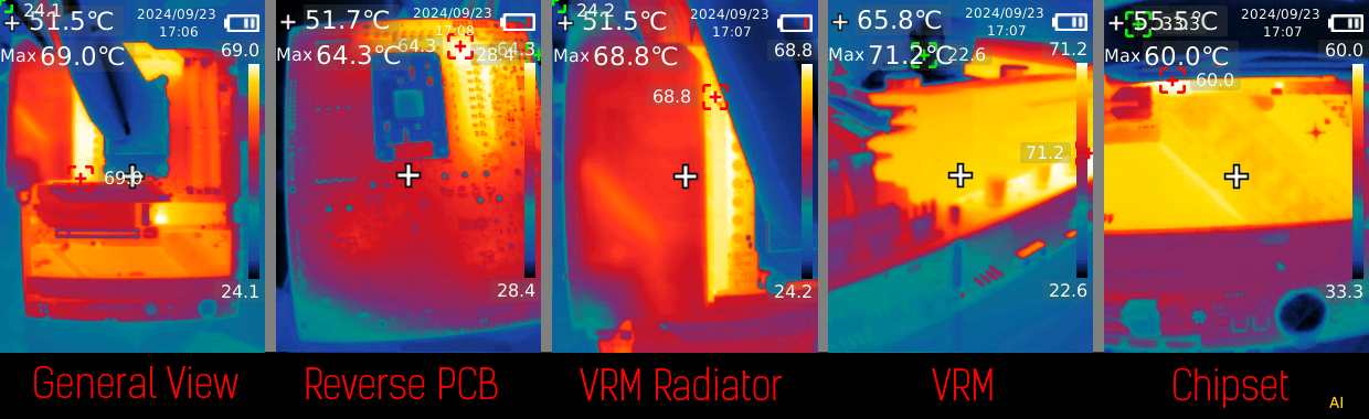 Термофото. Порядок: простій, навантаження в типовому режимі, навантаження в режимі автоматичного розгону AI Optimized, навантаження в режимі ручного розгону.