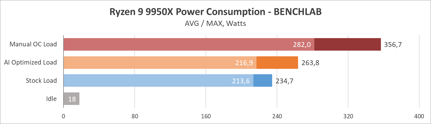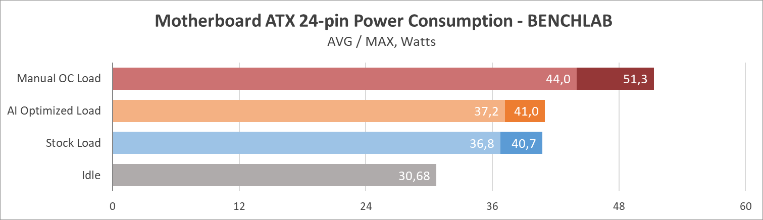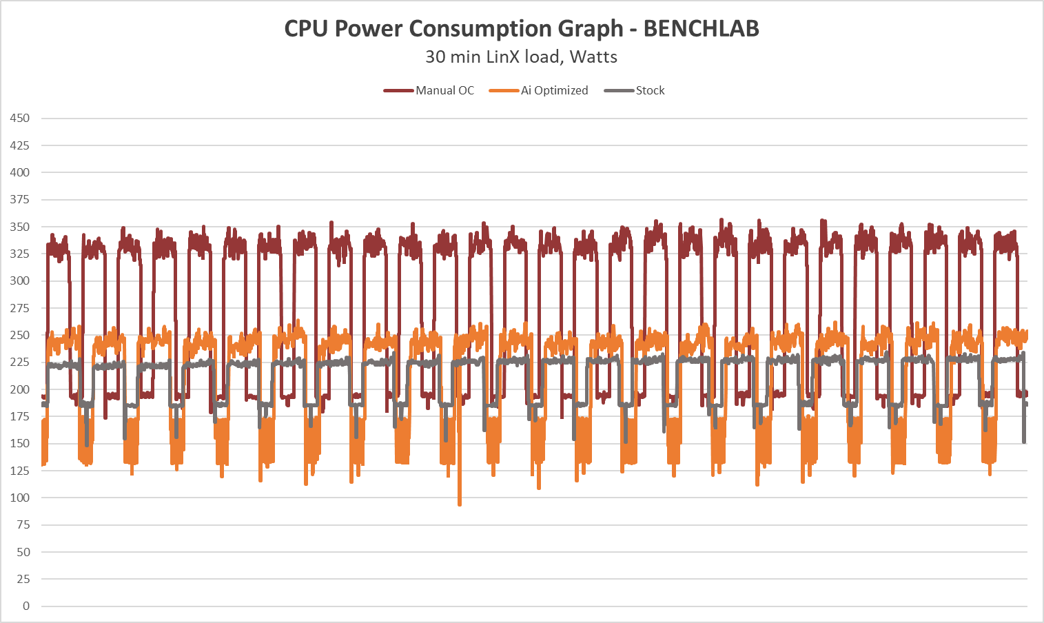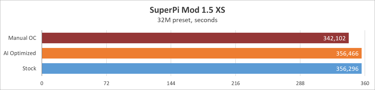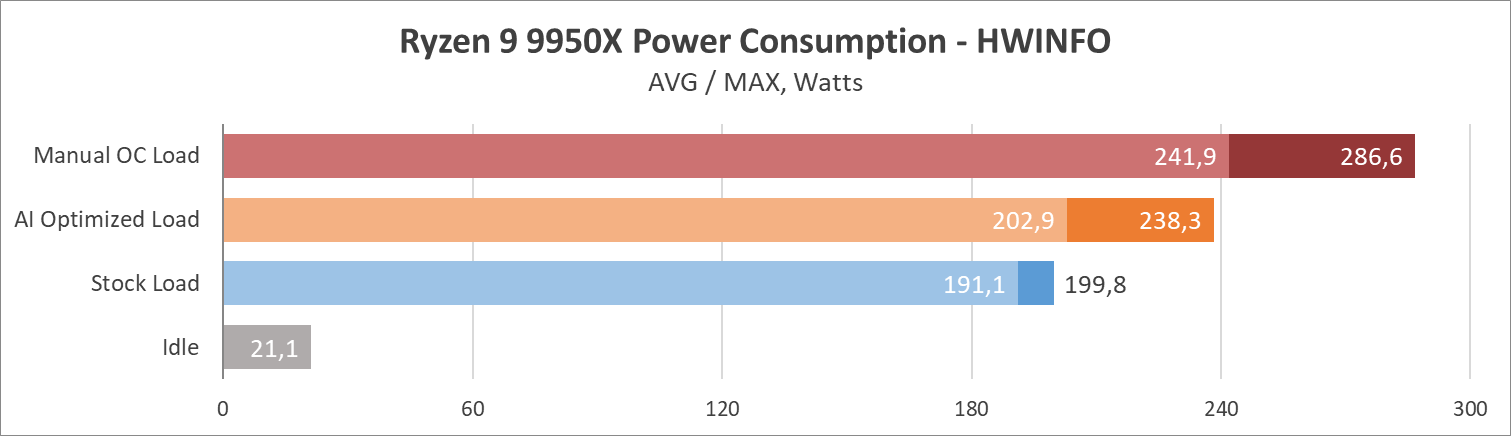 В навантаженні в режимі автоматичного оверклокінгу AI Optimized плата утримувала всі ядра на середній частоті вже 5247,4 МГц, а максимальне прискорення одного ядра склало 5714,7 МГц.