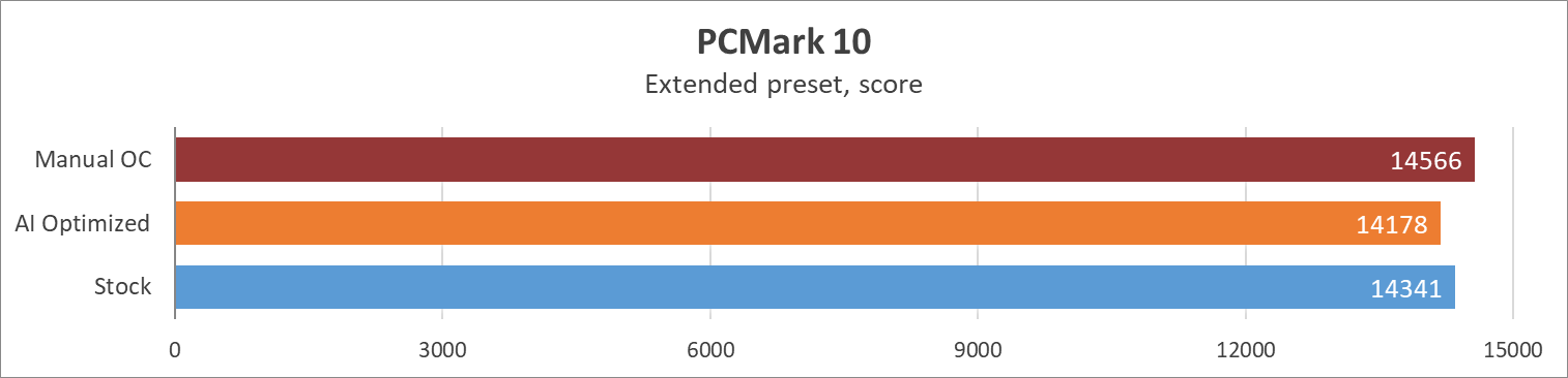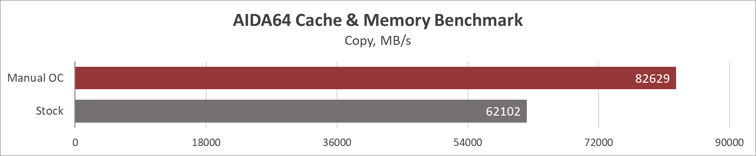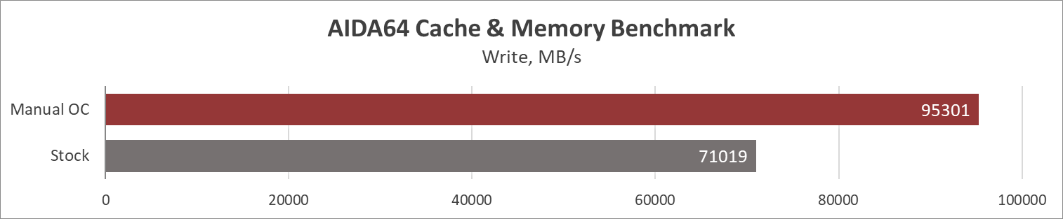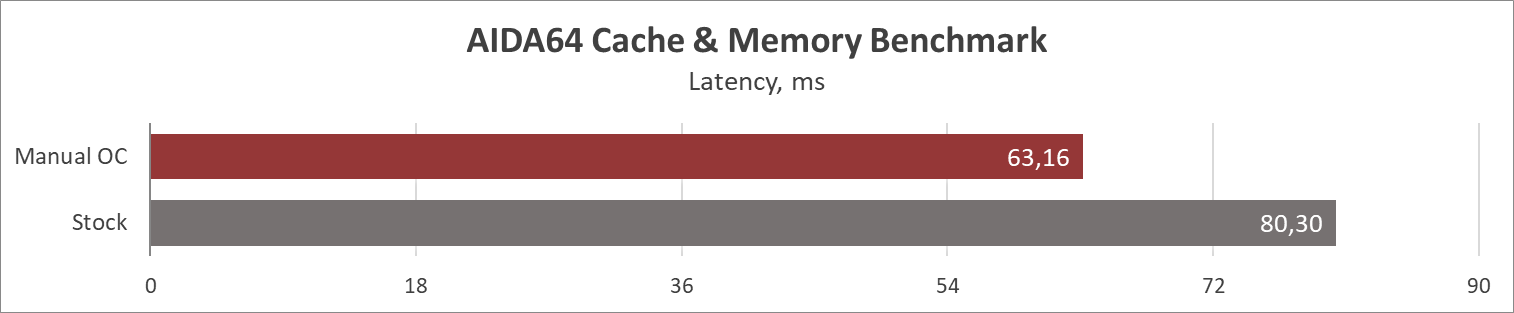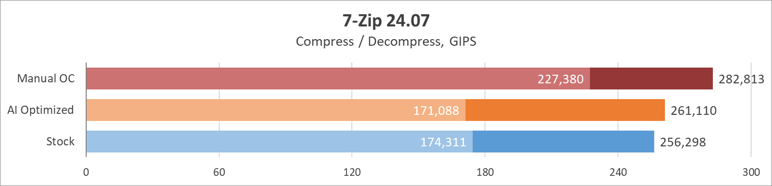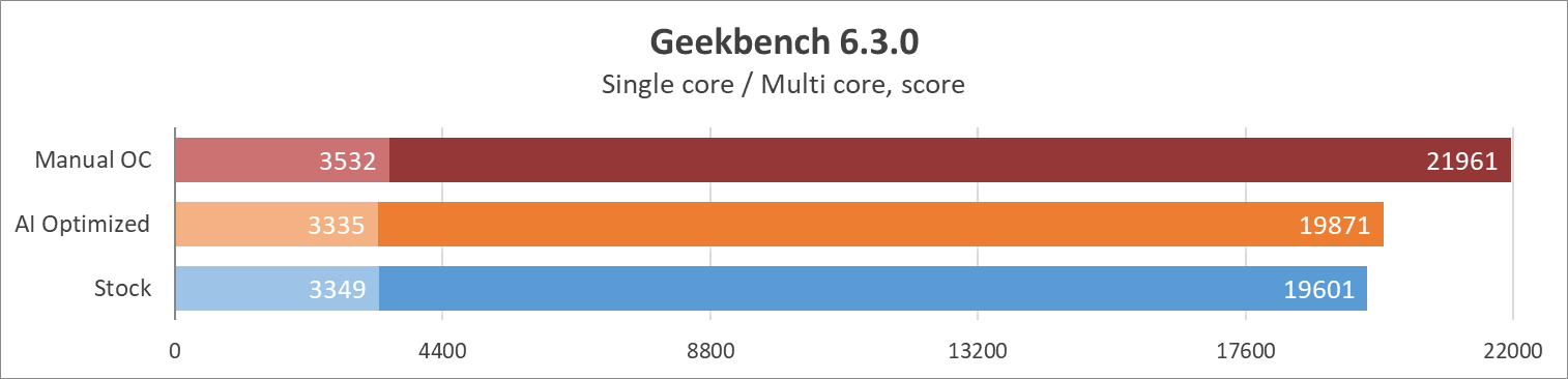 ОЗП традиційно для платформи AMD працював в режимі IMC 1:1 DDR5-6400 CL32-39-39-30-2T. 3300 МГц було занадто багато і досягти стабільності не вдалось навіть для бенчмаркінгу HWBOT. Процесор розганявся за допомогою Precision Boost Overdrive, максимальна частота збільшена на 150 МГц (5,9 ГГц), PBO Scalar = x10, ліміт температури розширено до 105 градусів. Також використовувався Curve Optimizer для всіх ядер = -10. Ліміти енергоспоживання знято.