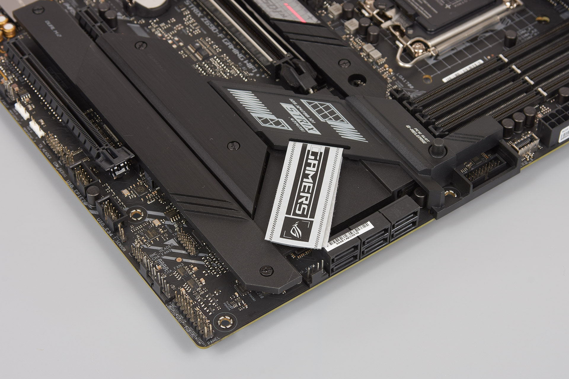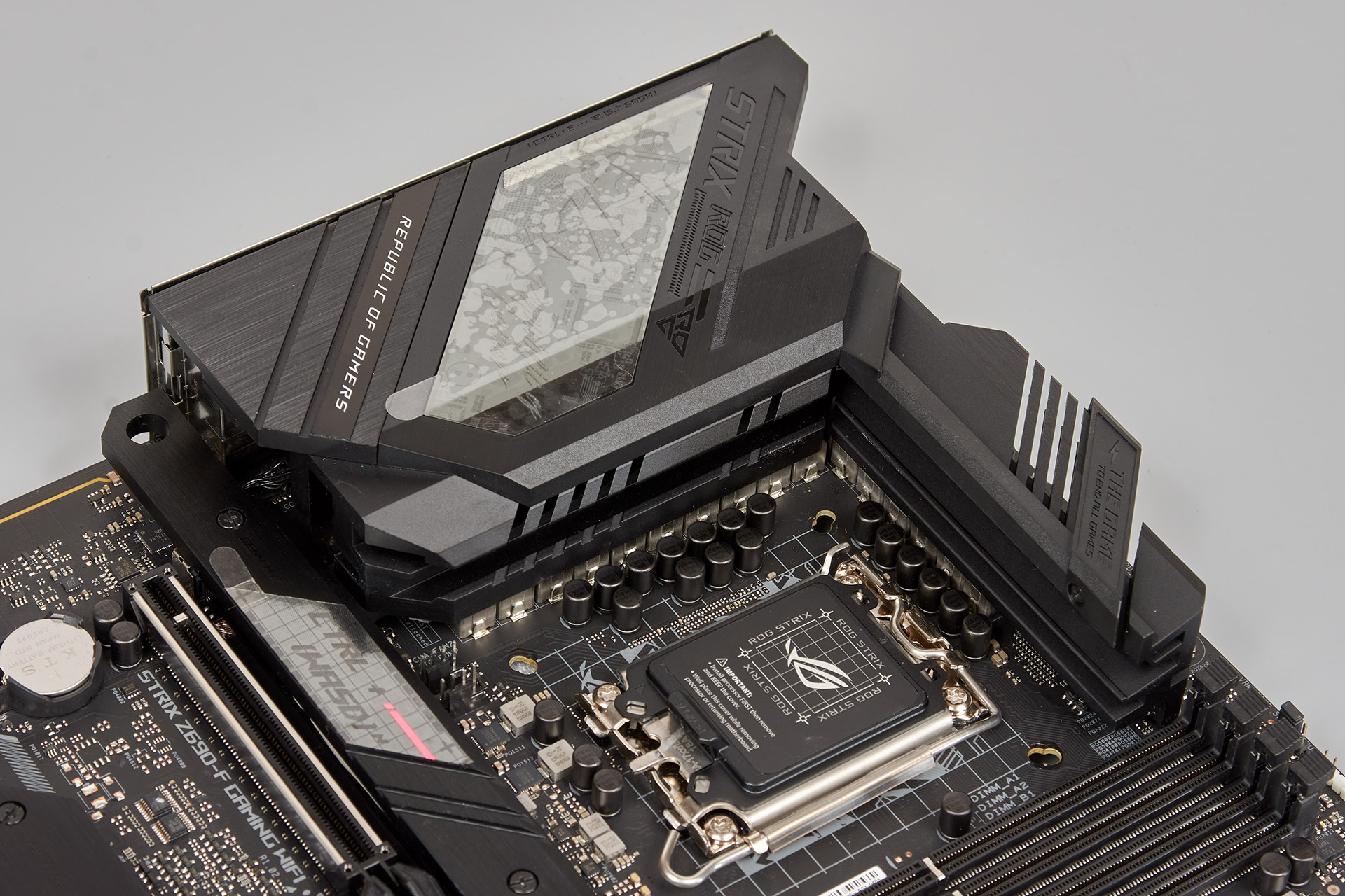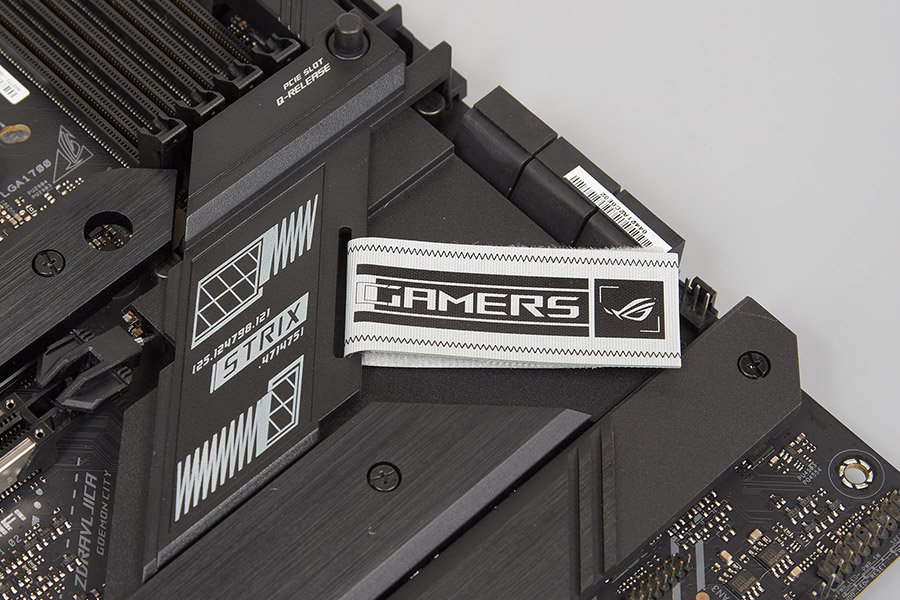 Як і у багатьох інших продуктів серії ROG — зовнішній вигляд плати хороший, втім, трохи пізніше з'ясовується, що в оформленні використано чимало пластмаси. З цікавинок на себе однозначно змусить звернути увагу кнопка відкриття клямки слота PCI-E х16, а також хомут-липучка в області чипсету, який покликаний допомогти в кабель-менеджменті. Текстоліт частково прихований за радіаторами охолодження M.2.
