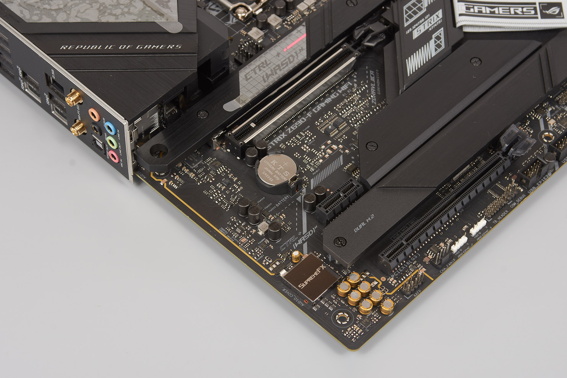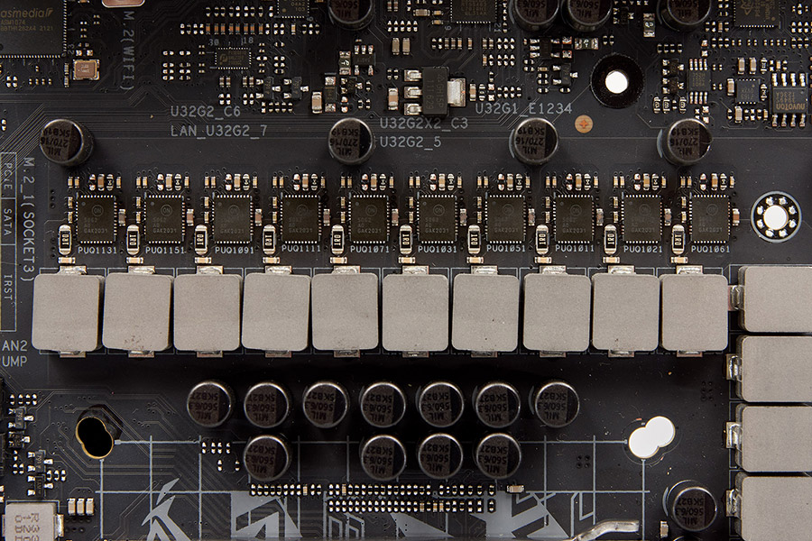 Привертає увагу цікава реалізація останнього слота розширення PCI-E. Річ у тому, що він призначений для карт розширення ROG HYPER M.2, тому може працювати в режимі x4/x4, проте, незважаючи на розведення восьми ліній PCI-E, він не здатний працювати саме в режимі x8. Або x4/x4, або просто x4.