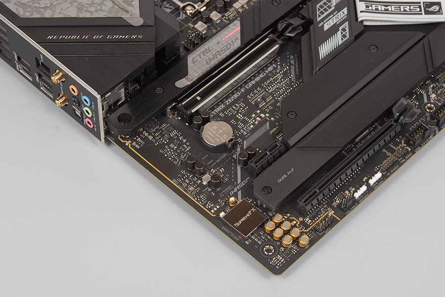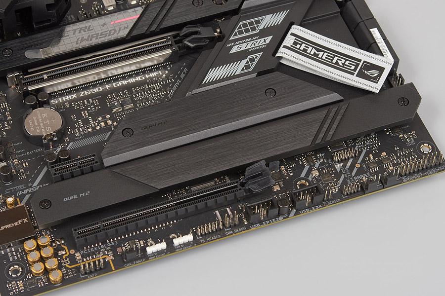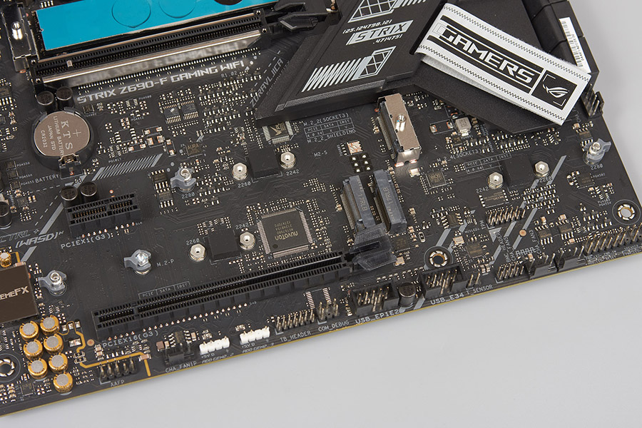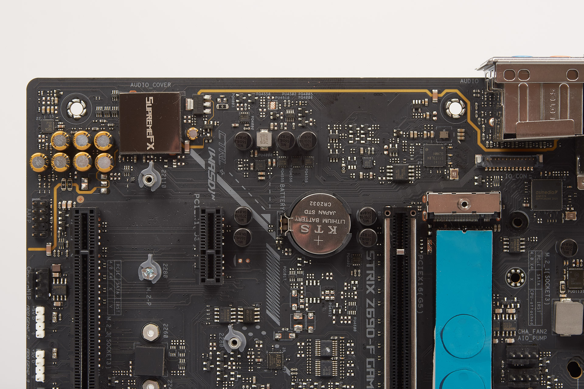 Настав час пройтися краями текстоліту. Батарейка CMOS розташована прямо під першим слотом PCI-E, в непрактичному місці, адже воно буде перекрито відеокартою. Проте згадуємо наявність чарівної кнопки розблокування слота, і це вже не здається проблемою. Внизу зліва можна виявити колодку HD_AUDIO, 4-контактну колодку для вентилятора, дві колодки RGB ADD_GEN2, колодку Thunderbolt, COM_DEBUG та дві колодки USB 2.0.