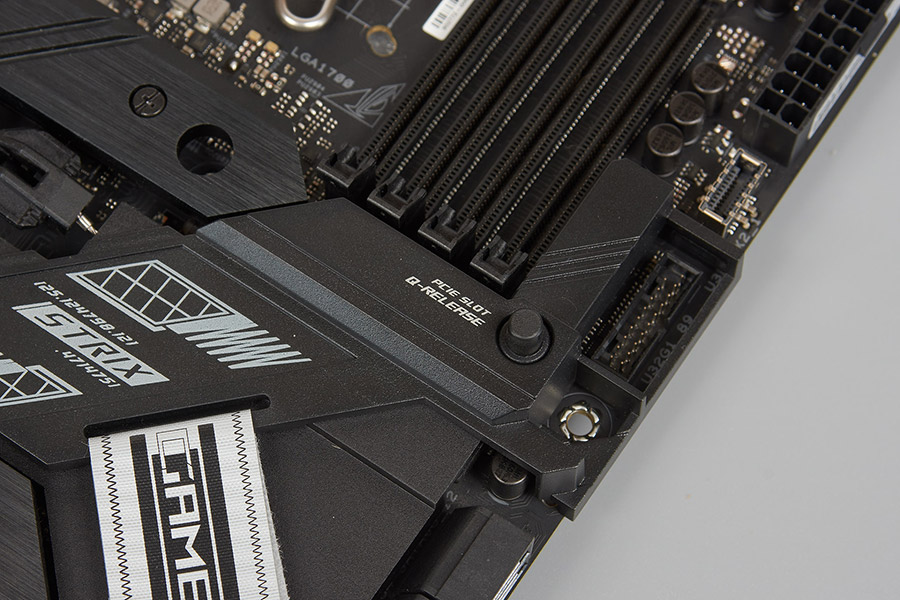 У зоні чипсета якраз розташувалися два цікавих елементи. Почнемо з кнопки розблокування слота PCI-E — це важіль на тросі, дуже просто, але наскільки ж геніально! Завдяки цьому можна без проблем витягти відеокарту, не прориваючись до засувки слота PCI-E за допомогою довгої викрутки або чогось подібного.