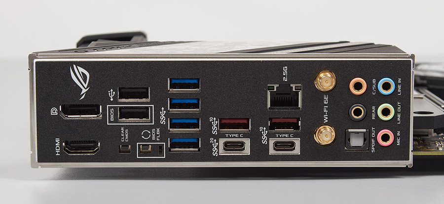 I/O-панель забезпечена заглушкою прямо із заводу, зі специфічного можна знайти кнопку та світлодіод BIOS FlashBack. Зі звичайного тут розташовані: