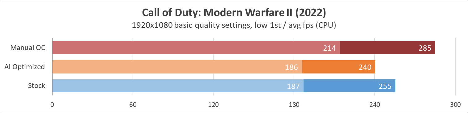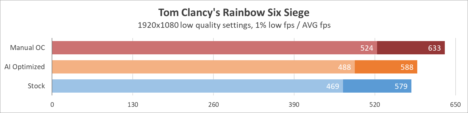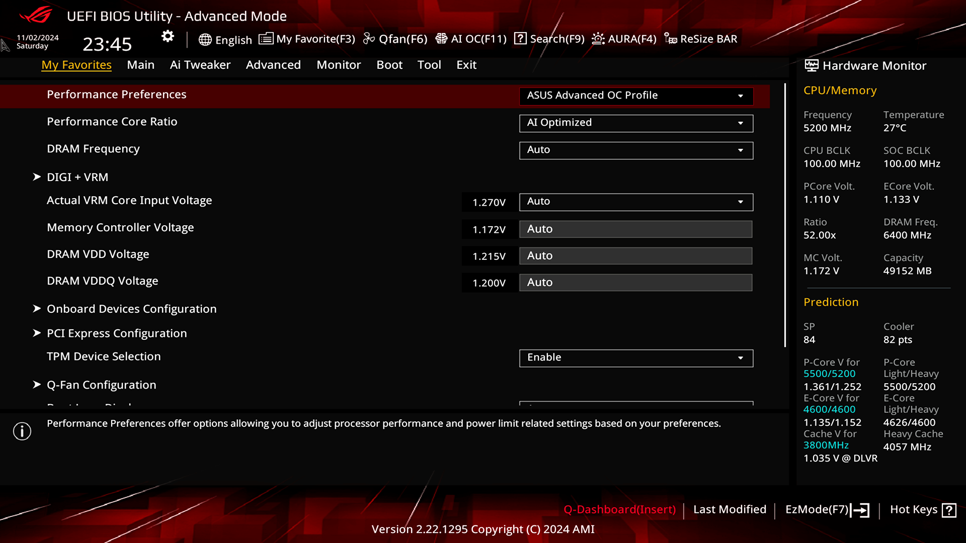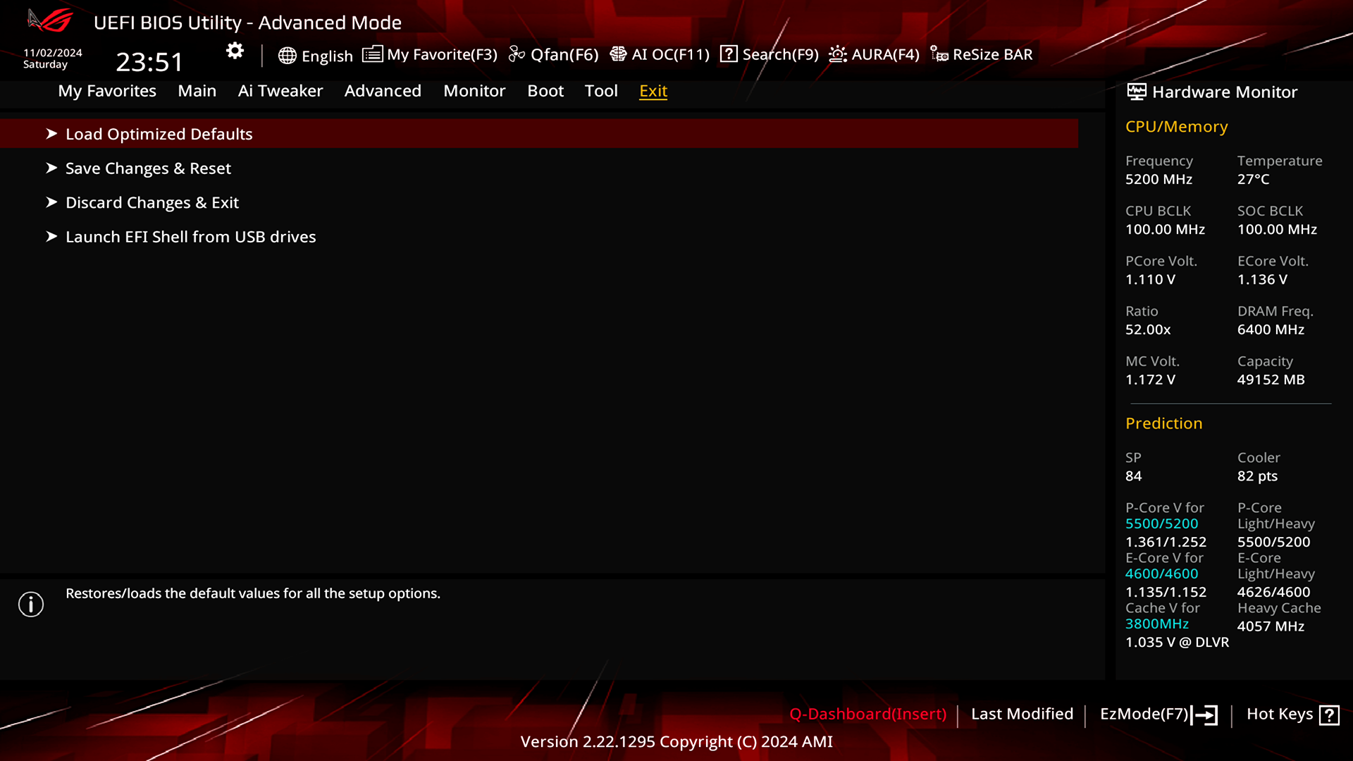 Типові налаштування аналогічні OPTIMIZED_DEFAULTS, виключення — частота пам'яті, що встановлена у режимі DDR5-6400 з таймінгами JEDEC (максимальна частота без префіксу «OC» в специфікаціях процесора). Управління обертами вентилятора за фабричним налаштуванням — автоматичне. Для наближення до стандартних умов експлуатації в операційній системі Memory_integrity та Core_isolation не вимикалися.
