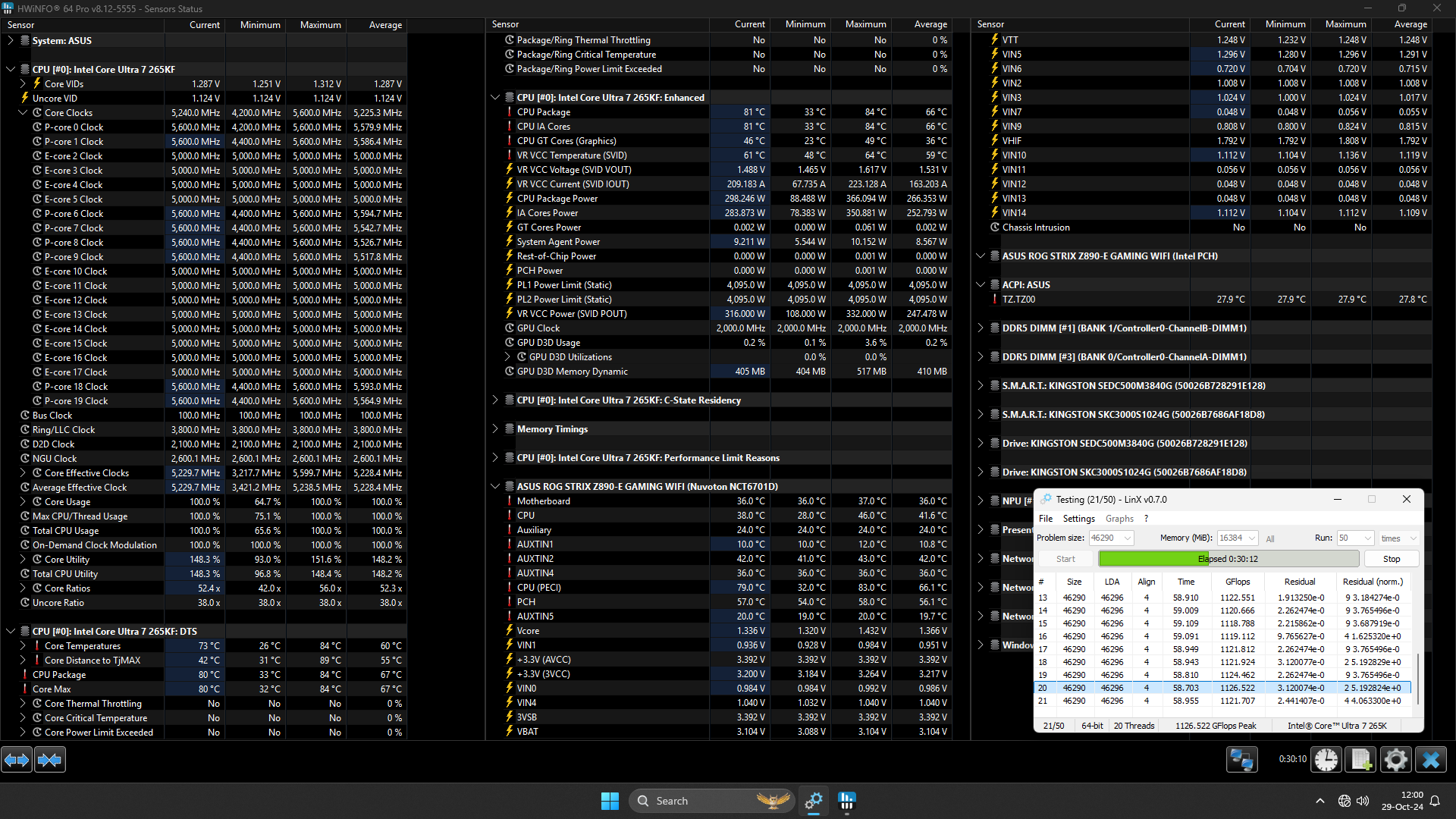 В режимі навантаження при типових налаштуваннях плата ASUS ROG Strix Z890-E Gaming WiFi утримувала середню частоту P-cores на рівні 5195,2 МГц з максимальним прискоренням одного ядра до 5200 МГц. E-cores працювали на середній частоті 4600 МГц. Глобальна середня частота ядер склала 4837,7 МГц.