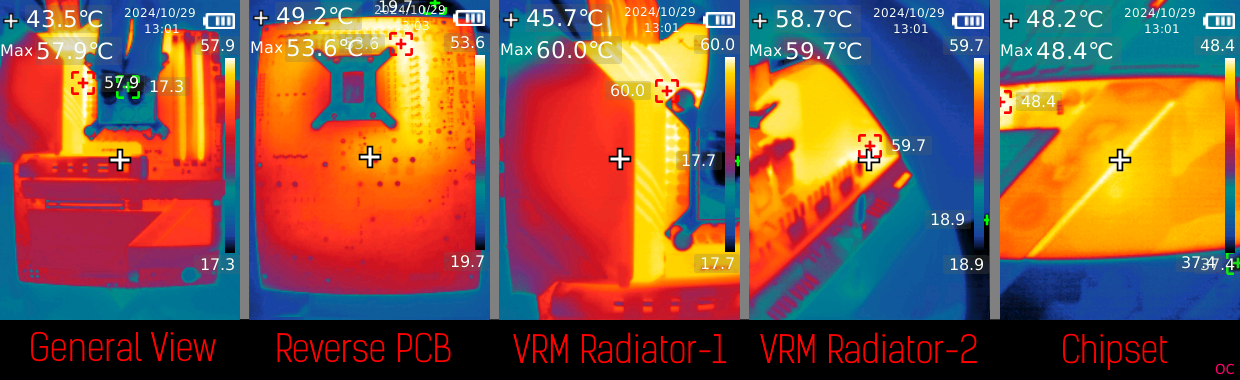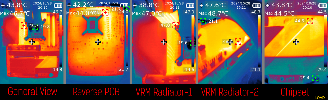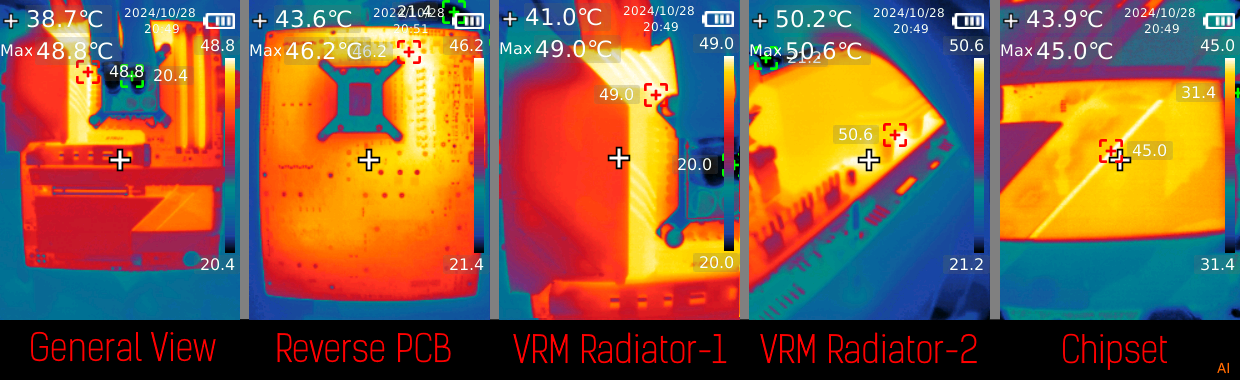 Термофото. Порядок: простій, навантаження в типовому режимі, навантаження в режимі автоматичного розгону AI Optimized, навантаження в режимі ручного розгону.