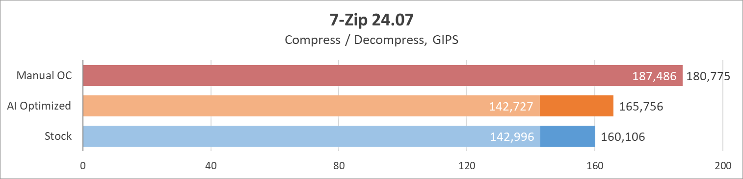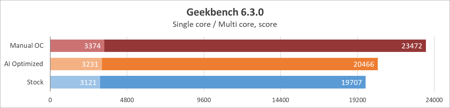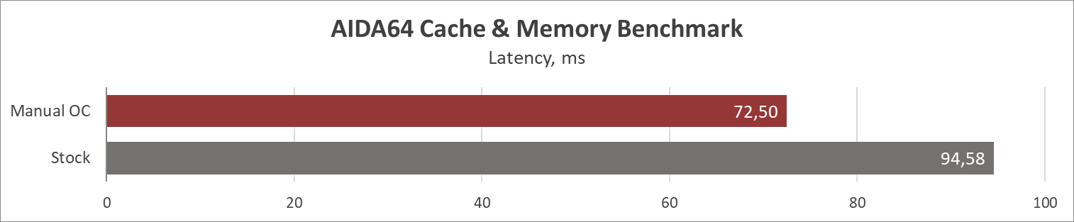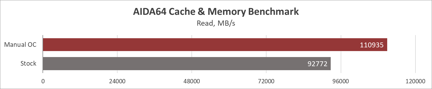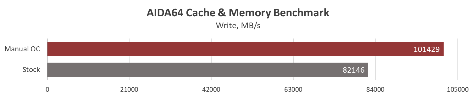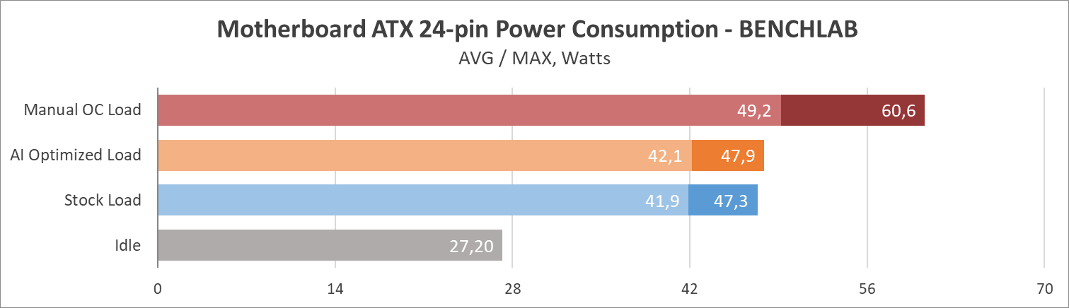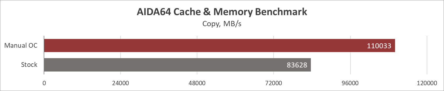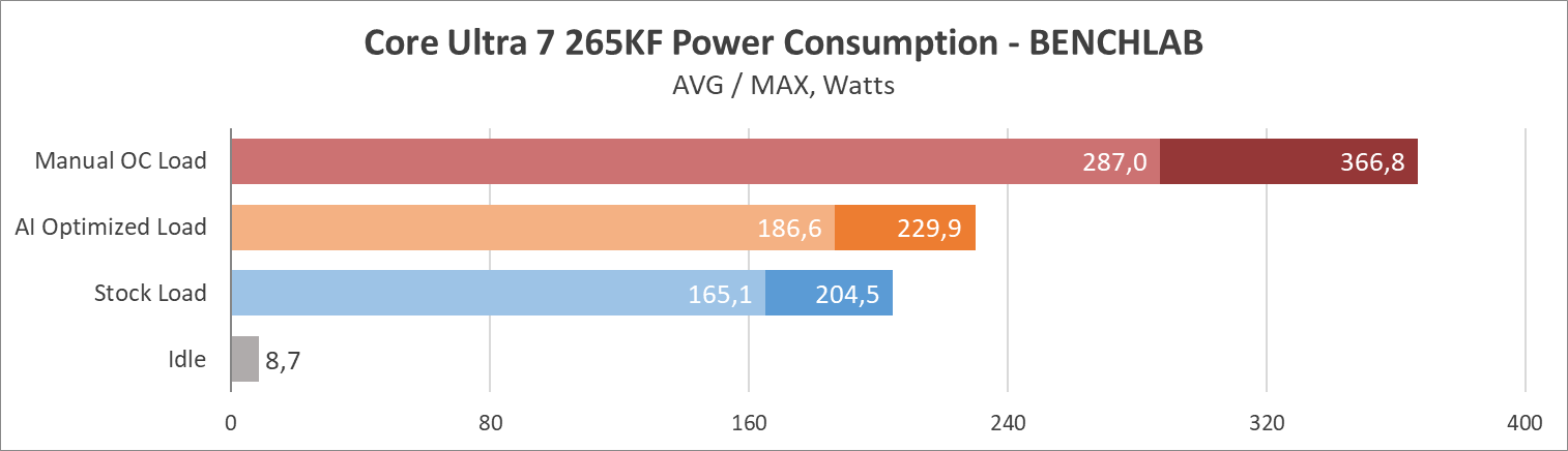 Оперативна пам’ять працювала в режимі DDR5-8000 CL36-48-48-34-2T та Gear 2 (нагадуємо, що Gear 1 в цій платі немає). Процесор було розігнано до 5,6 Гц за продуктивними ядрами та 5,0 ГГц за енергоефективними в адаптивному режимі без використання TVB, V/F Offset. NPU залишався на заводських частотах. Ліміти енергоспоживання повністю знято, однак захист Max Voltage Limits працював.