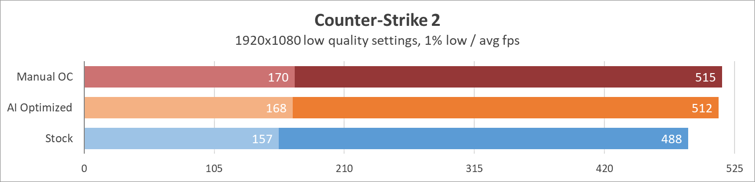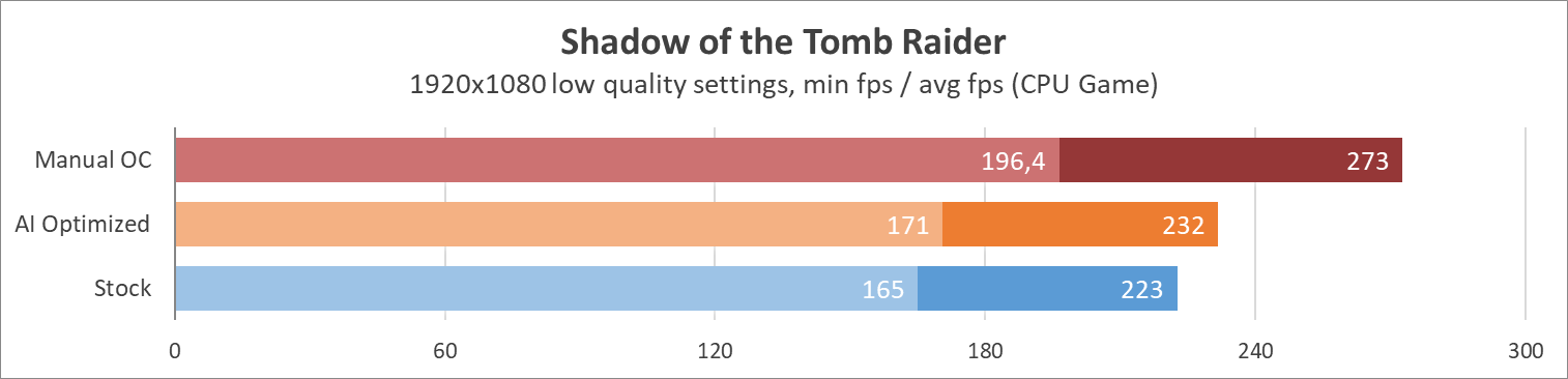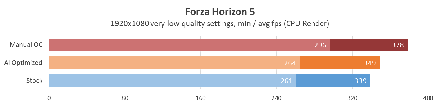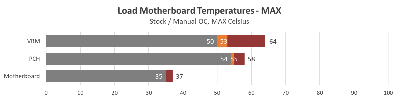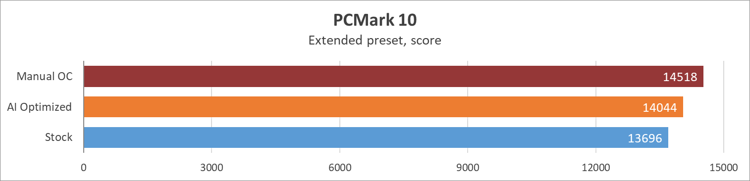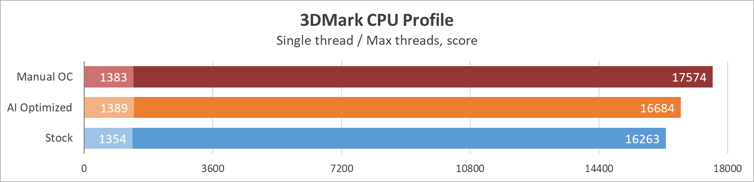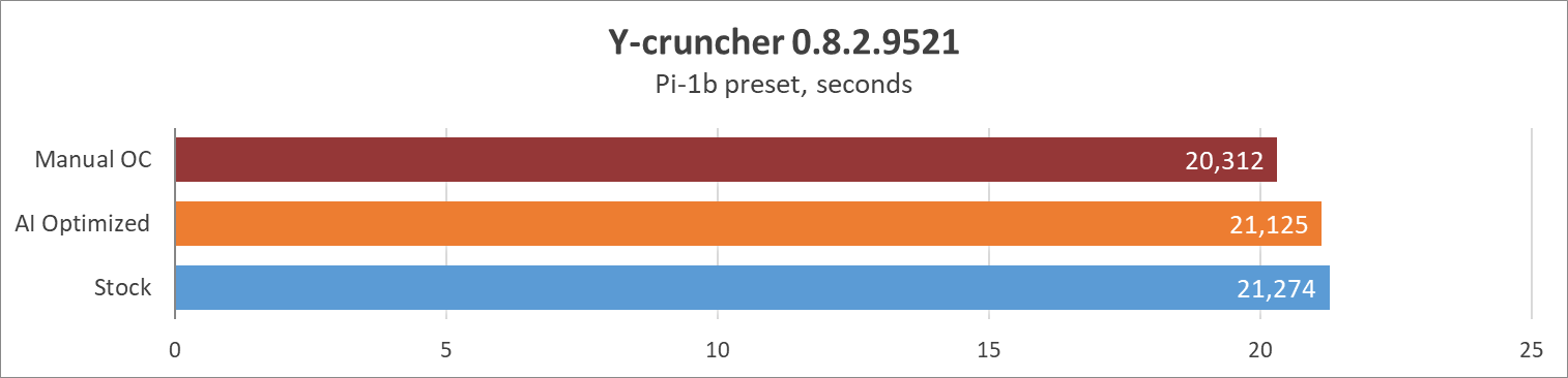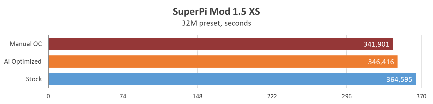 Оперативна пам’ять працювала в режимі DDR5-8000 CL36-48-48-34-2T та Gear 2 (нагадуємо, що Gear 1 в цій платі немає). Процесор було розігнано до 5,6 Гц за продуктивними ядрами та 5,0 ГГц за енергоефективними в адаптивному режимі без використання TVB, V/F Offset. NPU залишався на заводських частотах. Ліміти енергоспоживання повністю знято, однак захист Max Voltage Limits працював.
