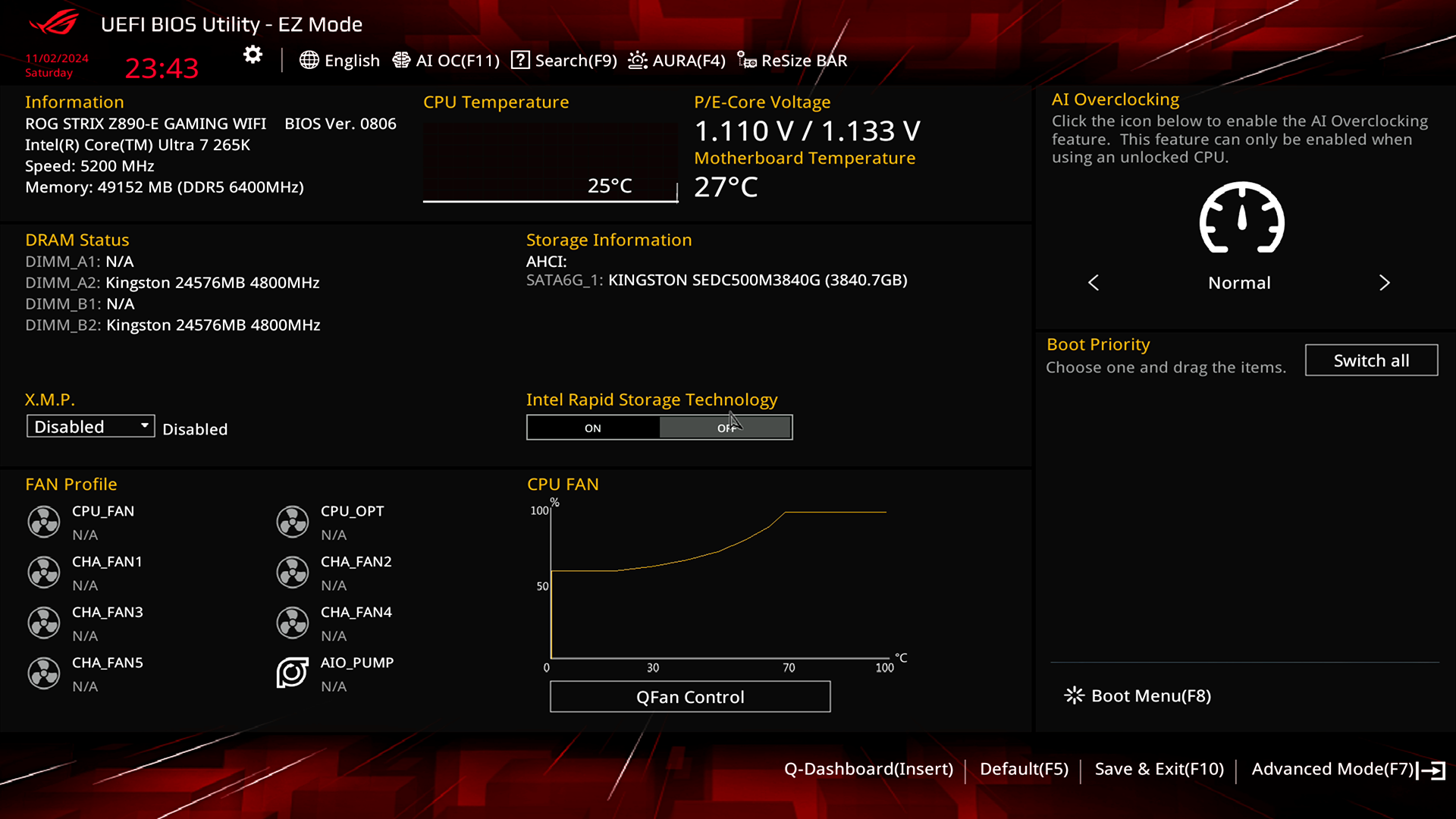 EZ Mode дає можливості отримати звіт по ключових елементах системи, вказати системний час, мову, завантажити AI OC, знайти потрібну опцію за пошуковим запитом, налаштувати AURA, ResizeBAR, криву обертів вентиляторів, XMP, RAID, вказати пріоритет завантаження з накопичувачів чи мережі.